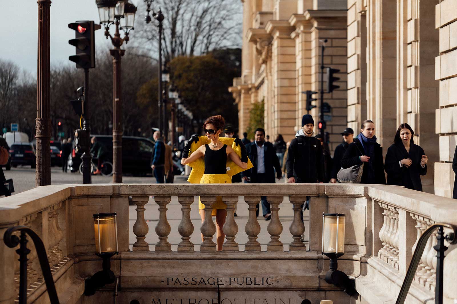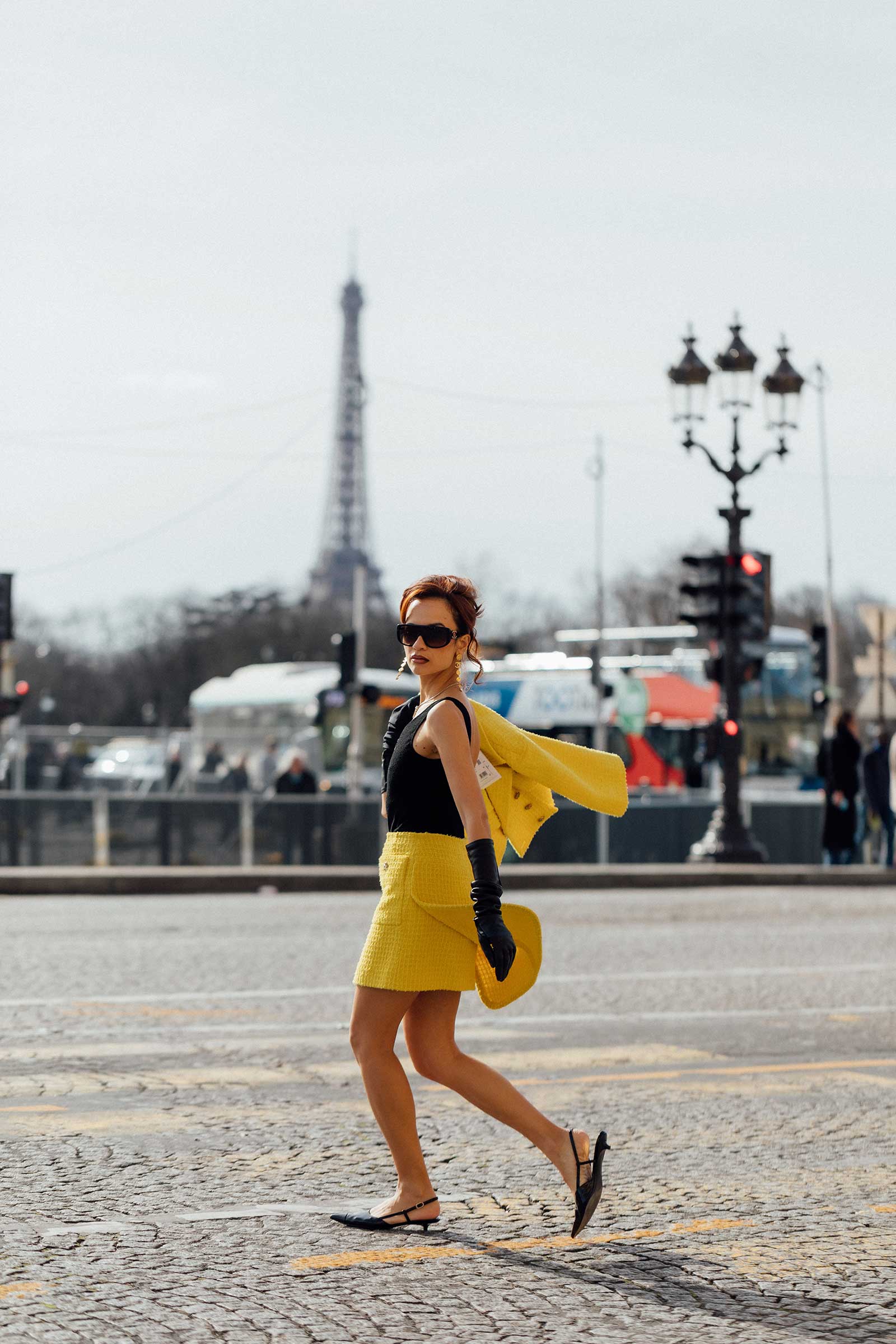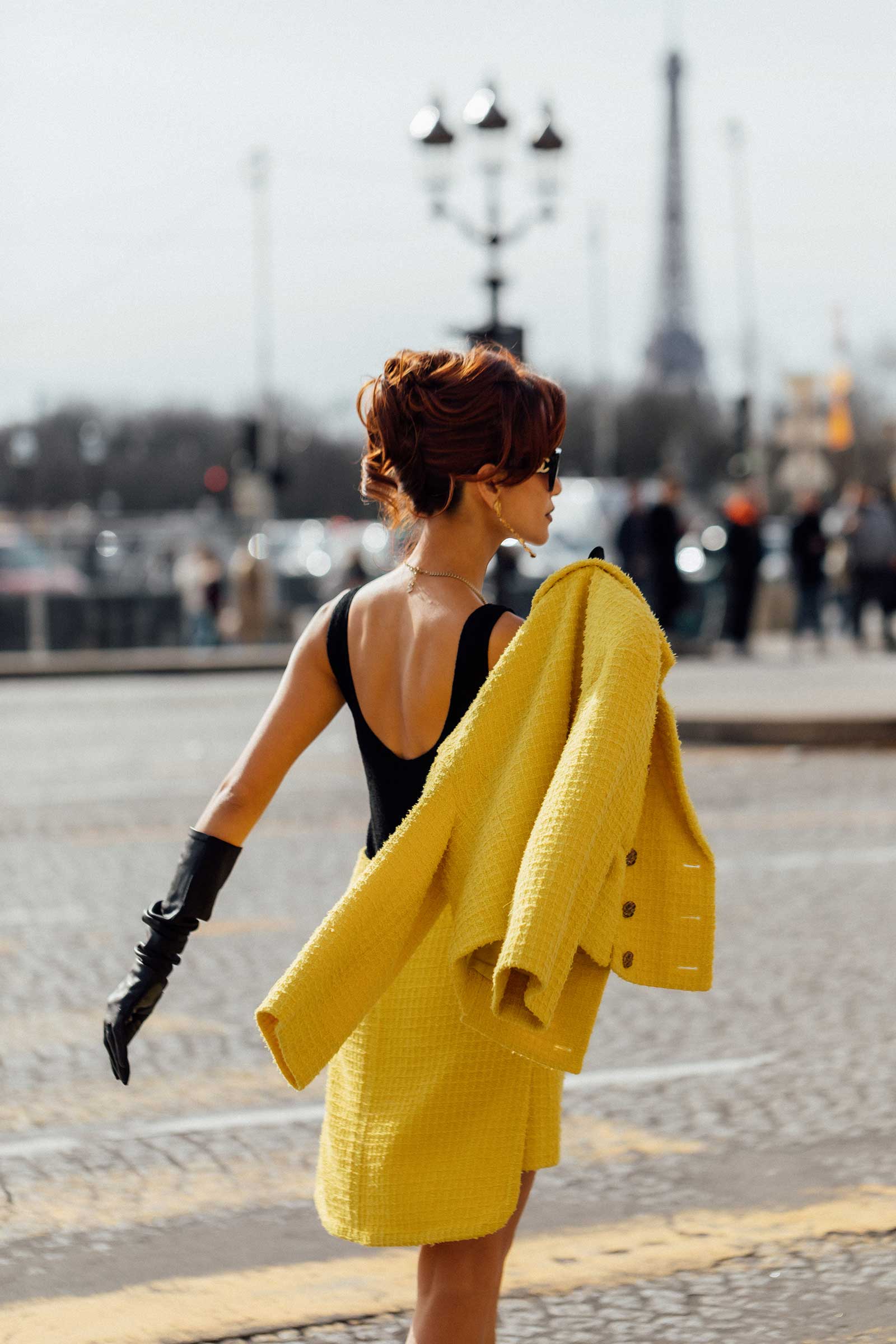 By Place de la Concorde in a yellow tweed suit from Chanel’s spring/summer 2022 collection