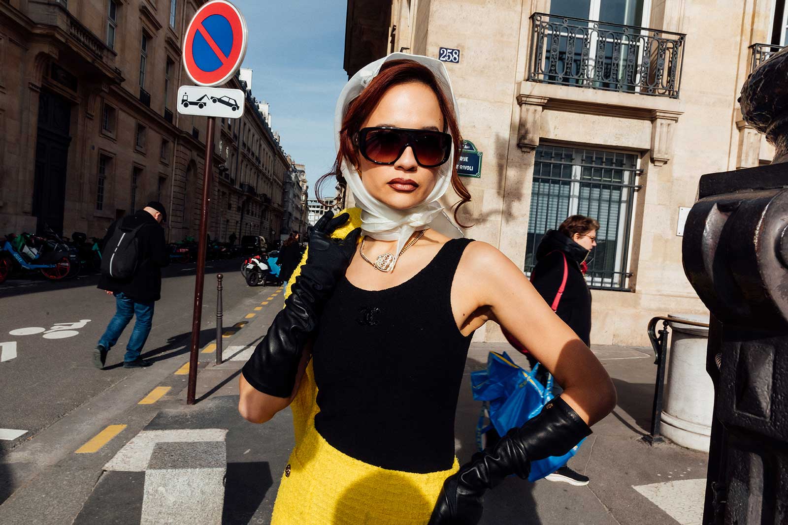 Along the iconic Rue de Rivoli in a dress and sequin tote bag from spring/summer 2024