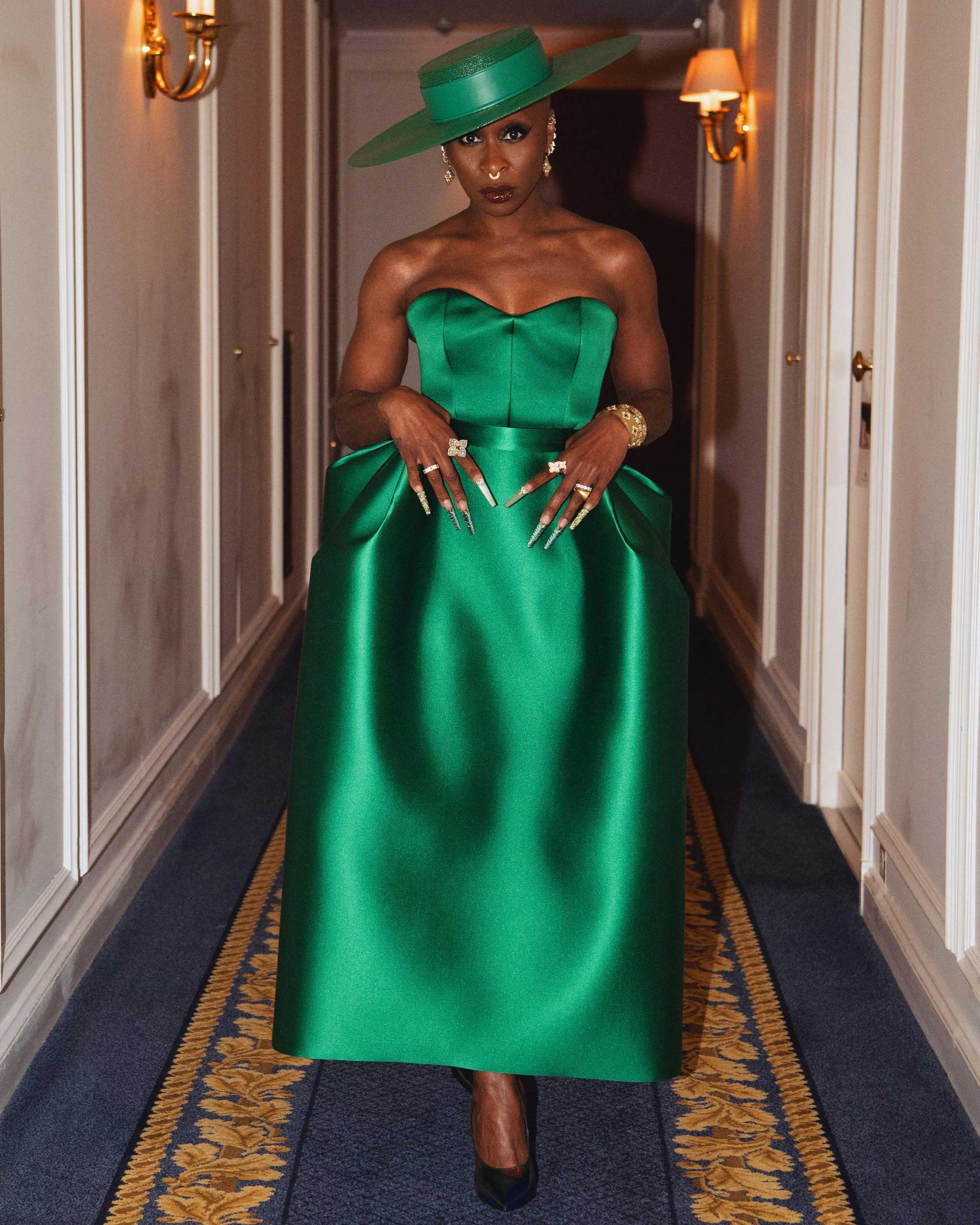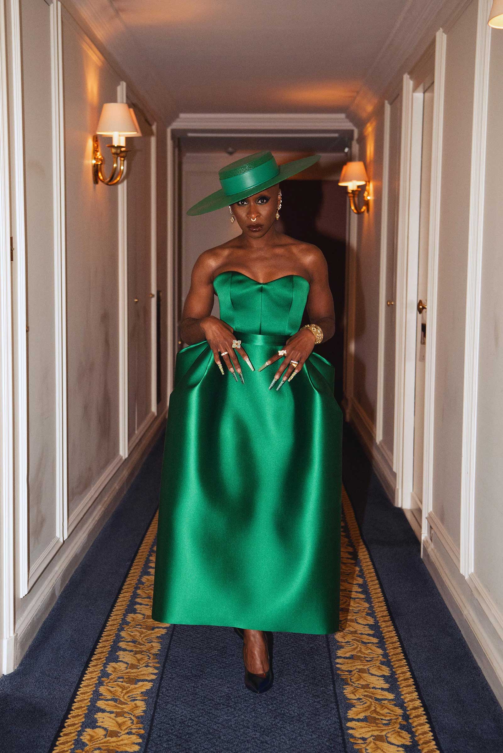What went into Erivo’s look, which channeled Elphaba realness? It was a custom Louis Vuitton ensemble in—what else?—emerald green. “We were inspired by Dominique Deveraux from Dynasty when finding references,” says Erivo, who was styled by Jason Bolden. “Her edge, her sophistication, her elegant Parisian style. It’s also been lovely to use the reference of a beautiful, strong Black woman.” Her favorite details were the accessories—including her Roberto Coin jewels and a dramatic brimmed chapeau. “When attending the last Vuitton show, we saw the hats going back and forth on the runway, and we decided to add something that was a bit more personal to me, which in this case is the hat,” says Erivo. “I love it! The shape and structure of the dress gives a throwback to the classic Parisian style, which felt appropriate given where we are. That’s something I love too!”