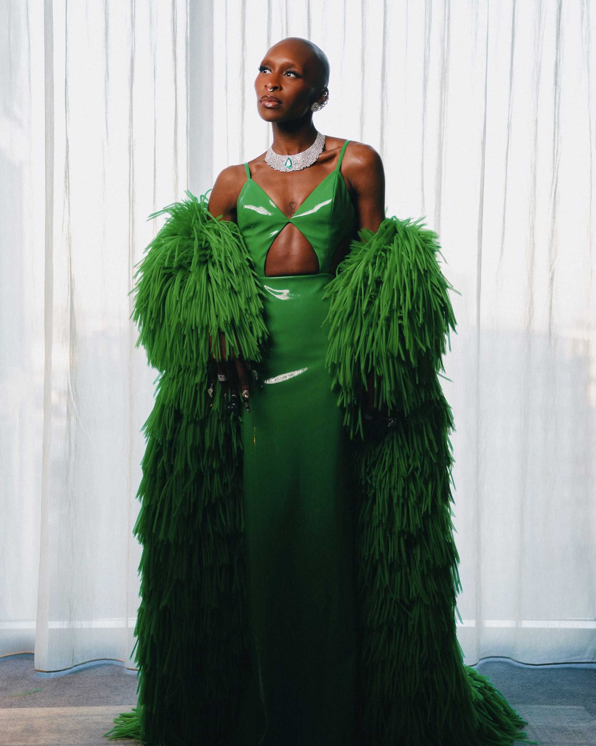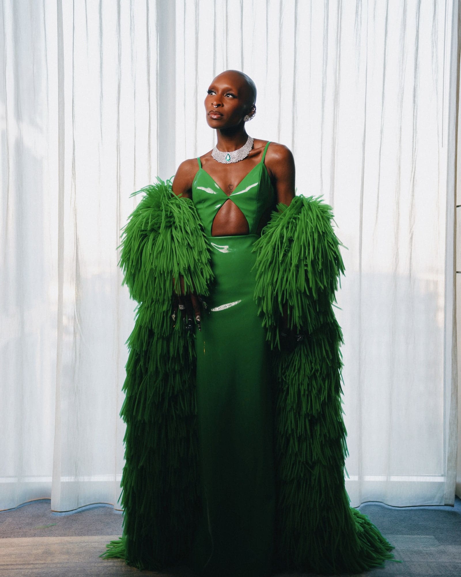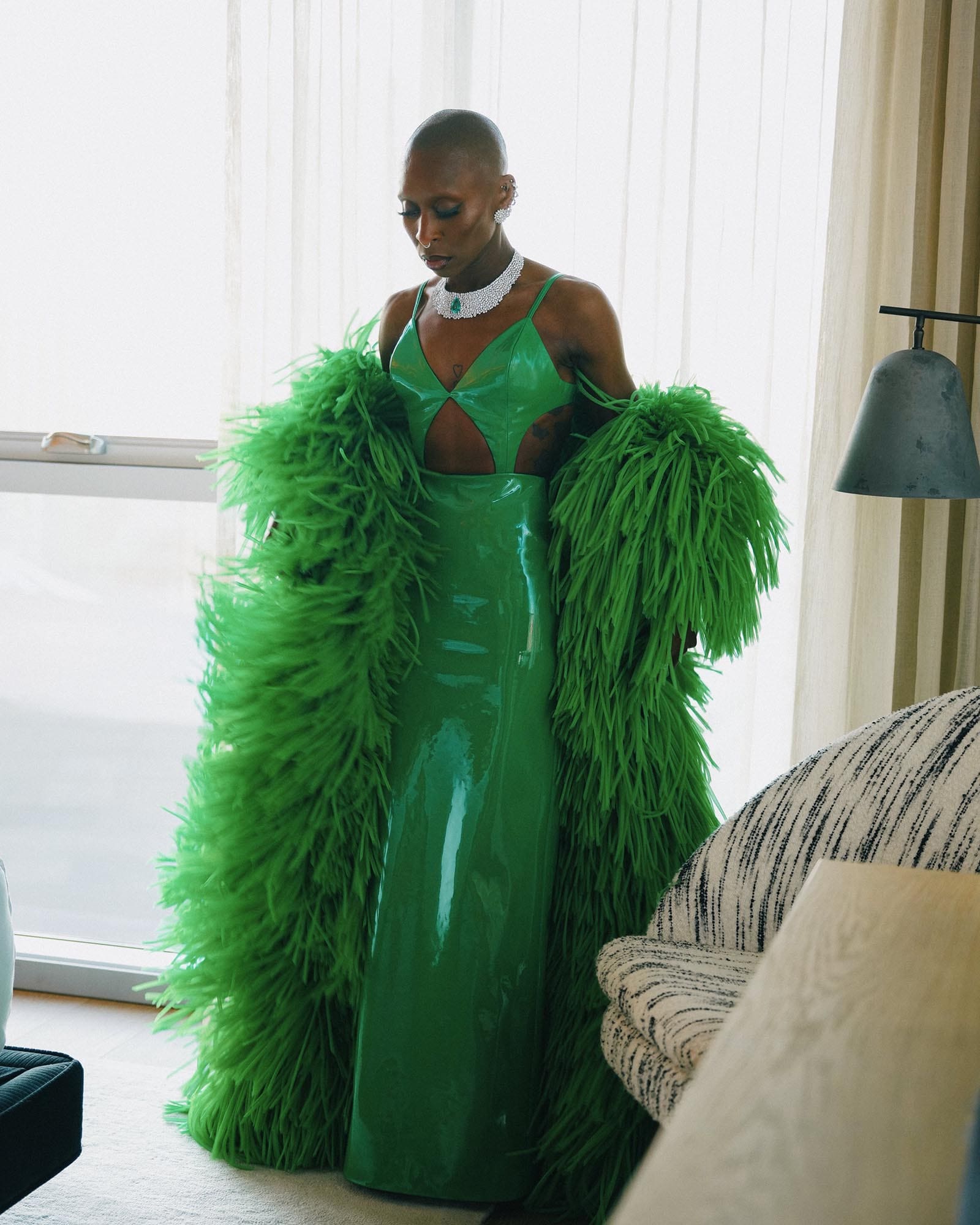 Speaking of outfits: At the Los Angeles premiere, Erivo certainly delivered one of her best Elphaba-inspired looks yet. Working with stylist Jason Bolden, the star chose a green vinyl Louis Vuitton gown with a feathered stole to match. “The LA carpet [look] for me is a such a wow factor—the color, the fabric,” says Erivo. “It just feels electric—[it lets] my character truly own the color green in such big, bold way!” While Erivo has worn many green numbers throughout the press tour, she says there was something fresh and original about this latest choice. “My stylist Jason had an idea about asking Louis Vuitton about vinyl, which normally isn’t the first go-to when it comes to a carpet,” she says. “I thought the fabric choice was strong and divine, which is how I see my character. We’ve also worked with LV on a vinyl look before that created a wow factor, so I guess we wanted to try our hand at that again and see what the reaction would be this time.”