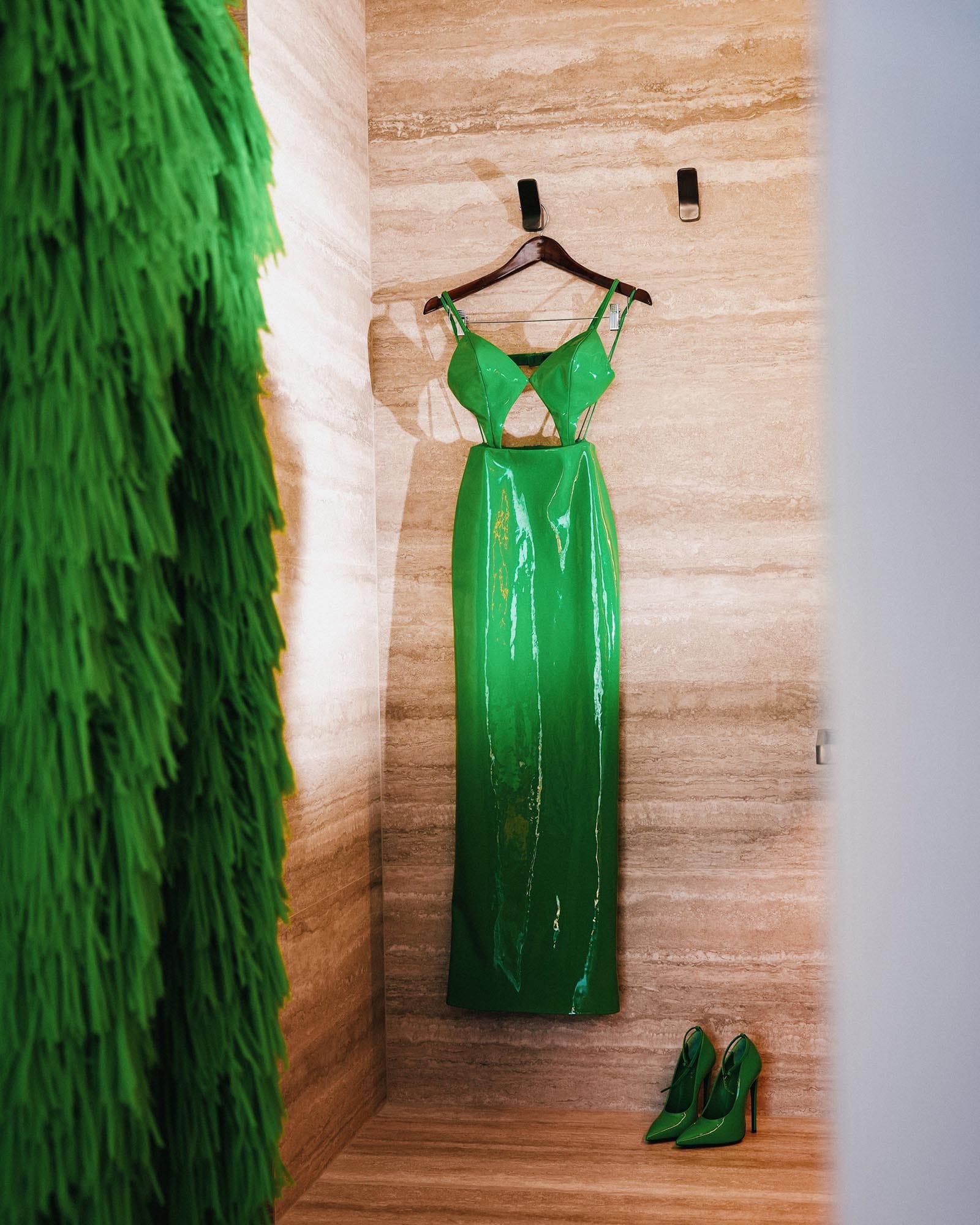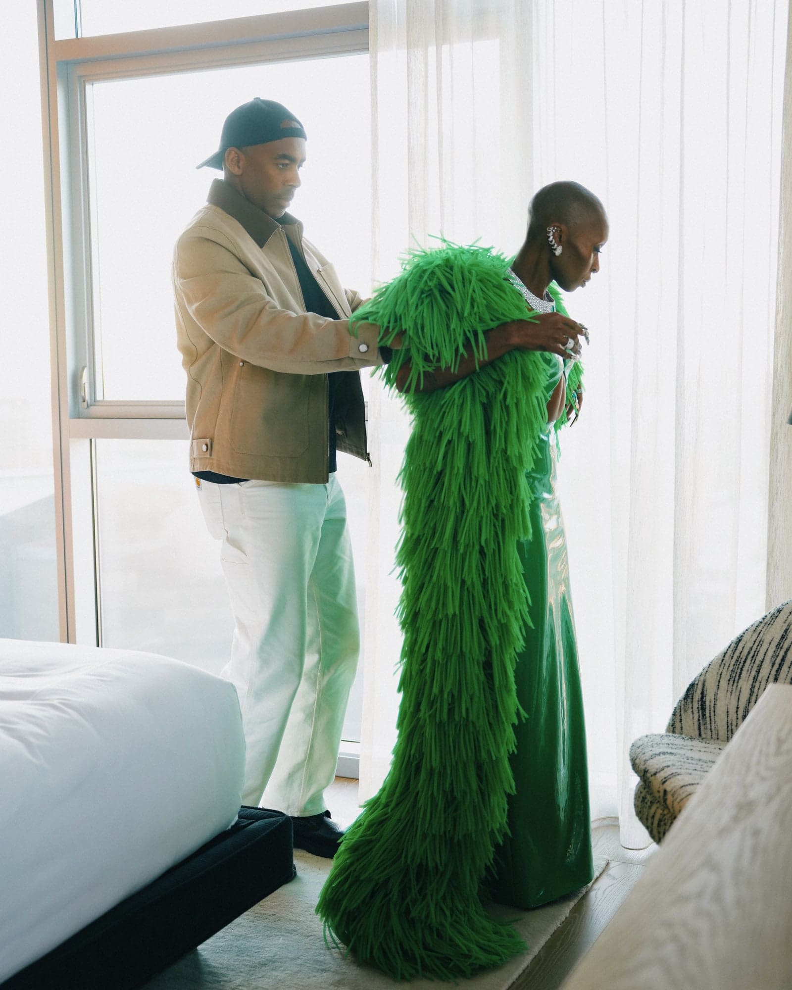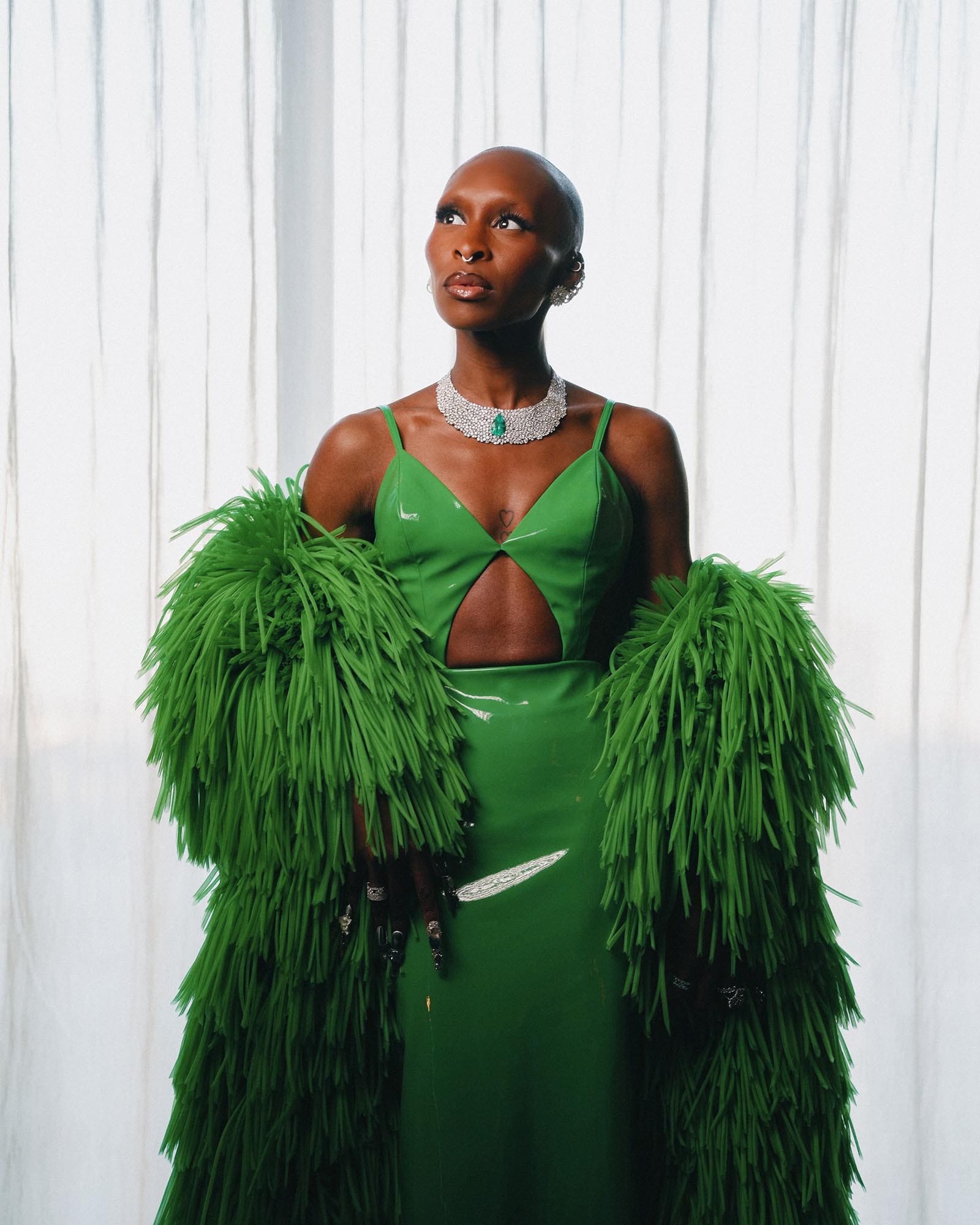 Speaking of outfits: At the Los Angeles premiere, Erivo certainly delivered one of her best Elphaba-inspired looks yet. Working with stylist Jason Bolden, the star chose a green vinyl Louis Vuitton gown with a feathered stole to match. “The LA carpet [look] for me is a such a wow factor—the color, the fabric,” says Erivo. “It just feels electric—[it lets] my character truly own the color green in such big, bold way!” While Erivo has worn many green numbers throughout the press tour, she says there was something fresh and original about this latest choice. “My stylist Jason had an idea about asking Louis Vuitton about vinyl, which normally isn’t the first go-to when it comes to a carpet,” she says. “I thought the fabric choice was strong and divine, which is how I see my character. We’ve also worked with LV on a vinyl look before that created a wow factor, so I guess we wanted to try our hand at that again and see what the reaction would be this time.”
