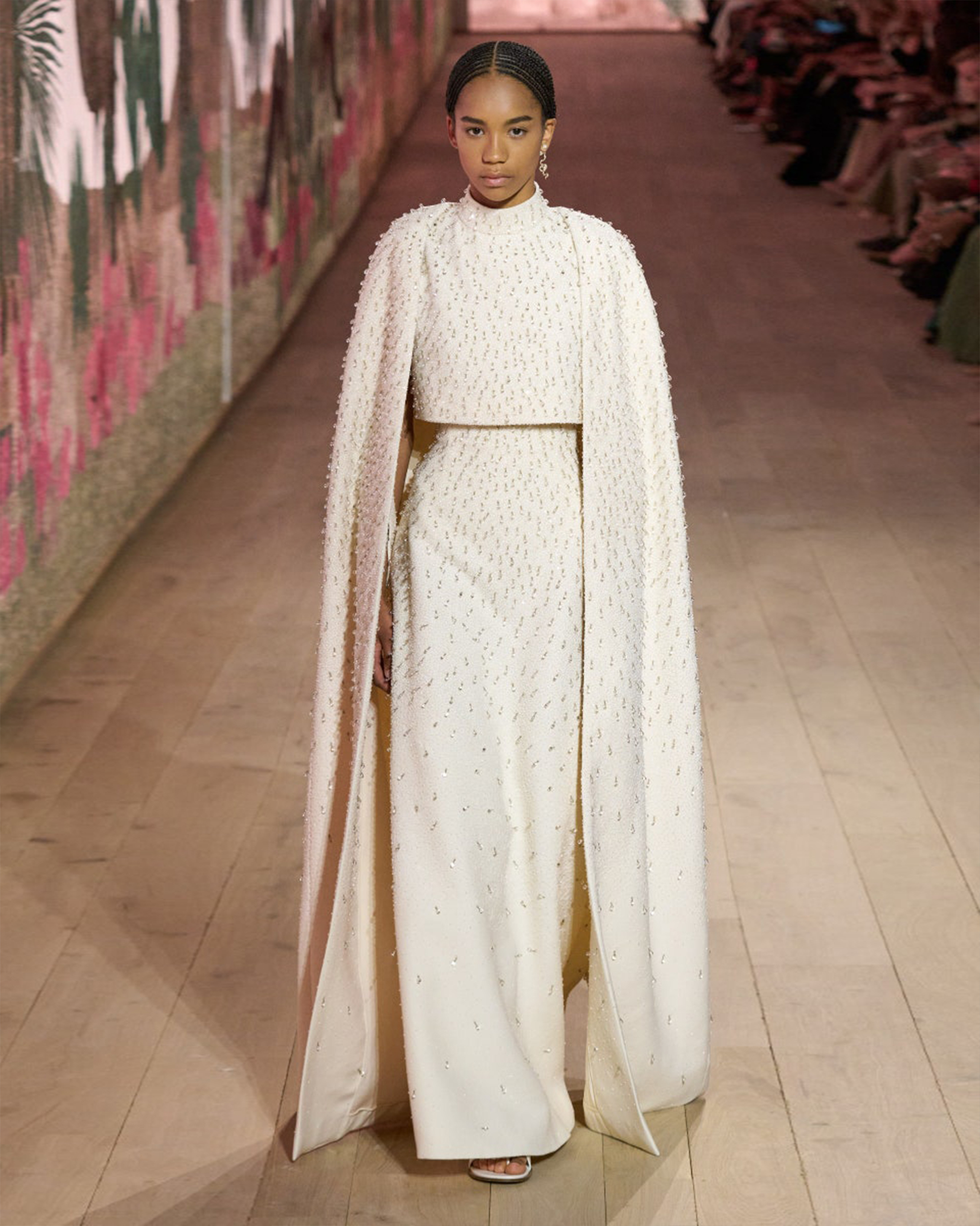 Chiuri approached her “apparent simplicity” with a kind of intricacy that takes the time only haute couture can afford. “For me, couture is a territory where you can take your time. And the client who comes for couture knows that it’s a different kind of clothes. It’s more timeless,” she said. Sticking to an antique silhouette with infusions of modernism, she created capes and dresses constructed in the finest double-faced ecru wool, fringe dresses in ecru silk so luxe it looked like leather, and silk shantung lace-like dresses crafted with needlepoint embroidery or guipure of braids and beaded silk. More decoration-focused exercises included a chalk georgette crepe gown covered in pearl embroidery. “It’s an idea of something natural. It doesn’t feel like big embroidery.”