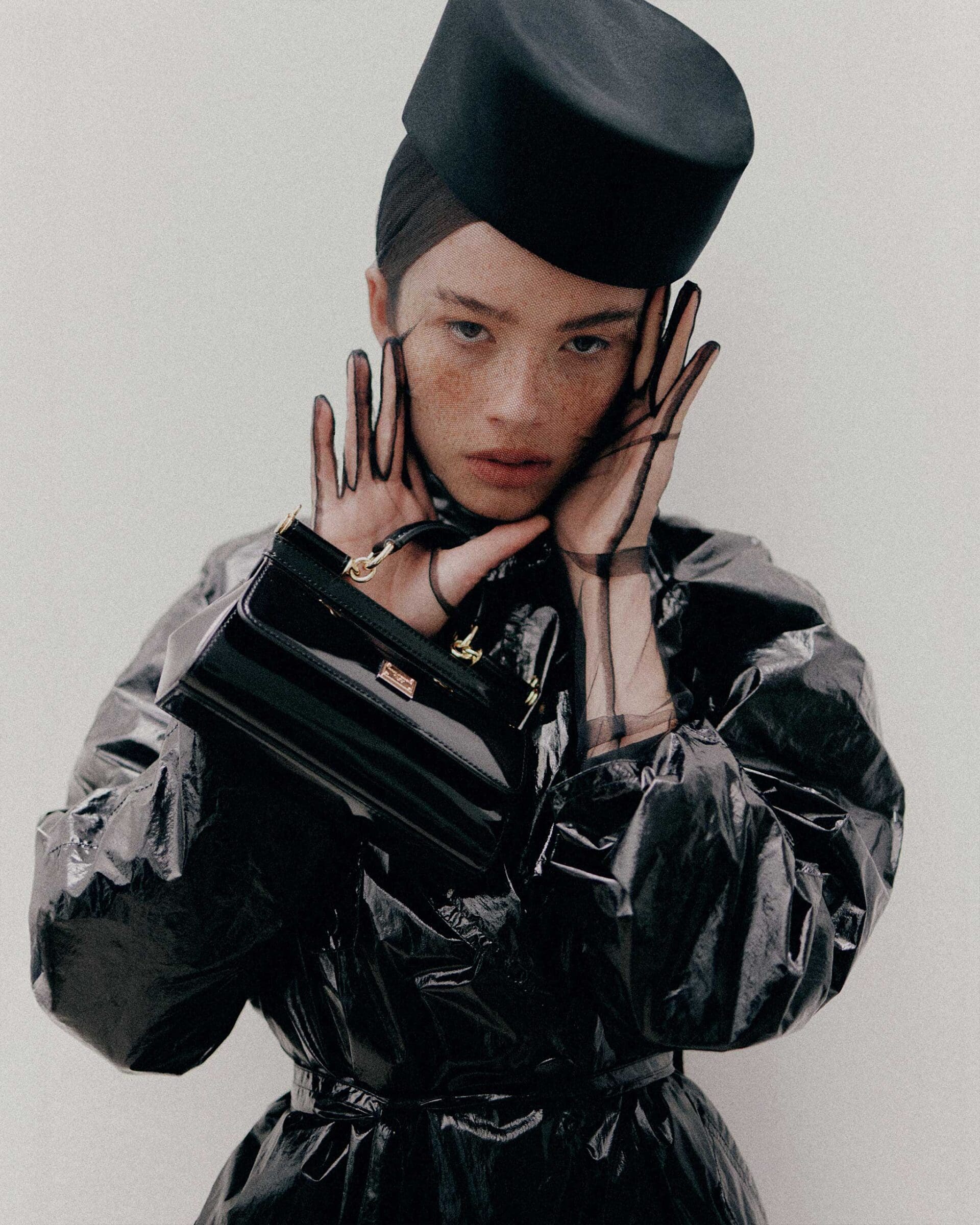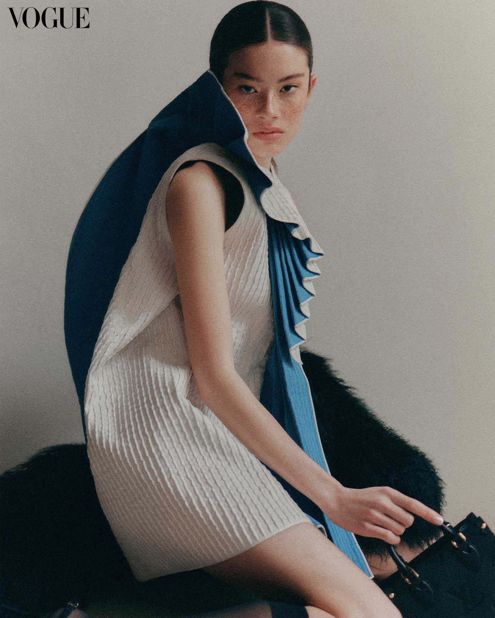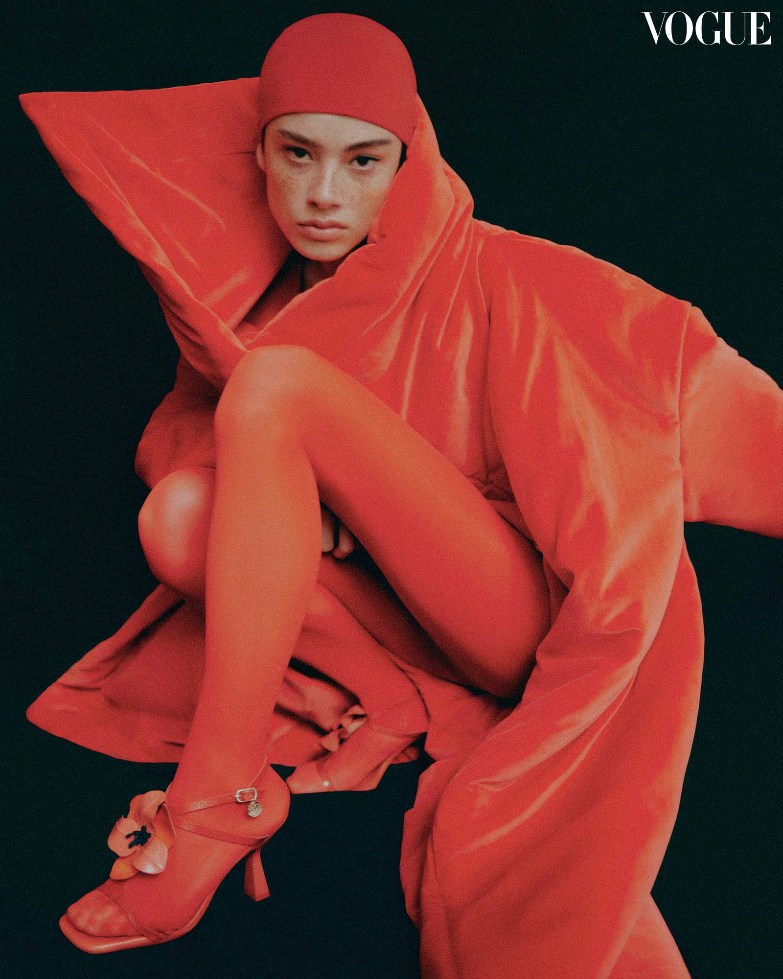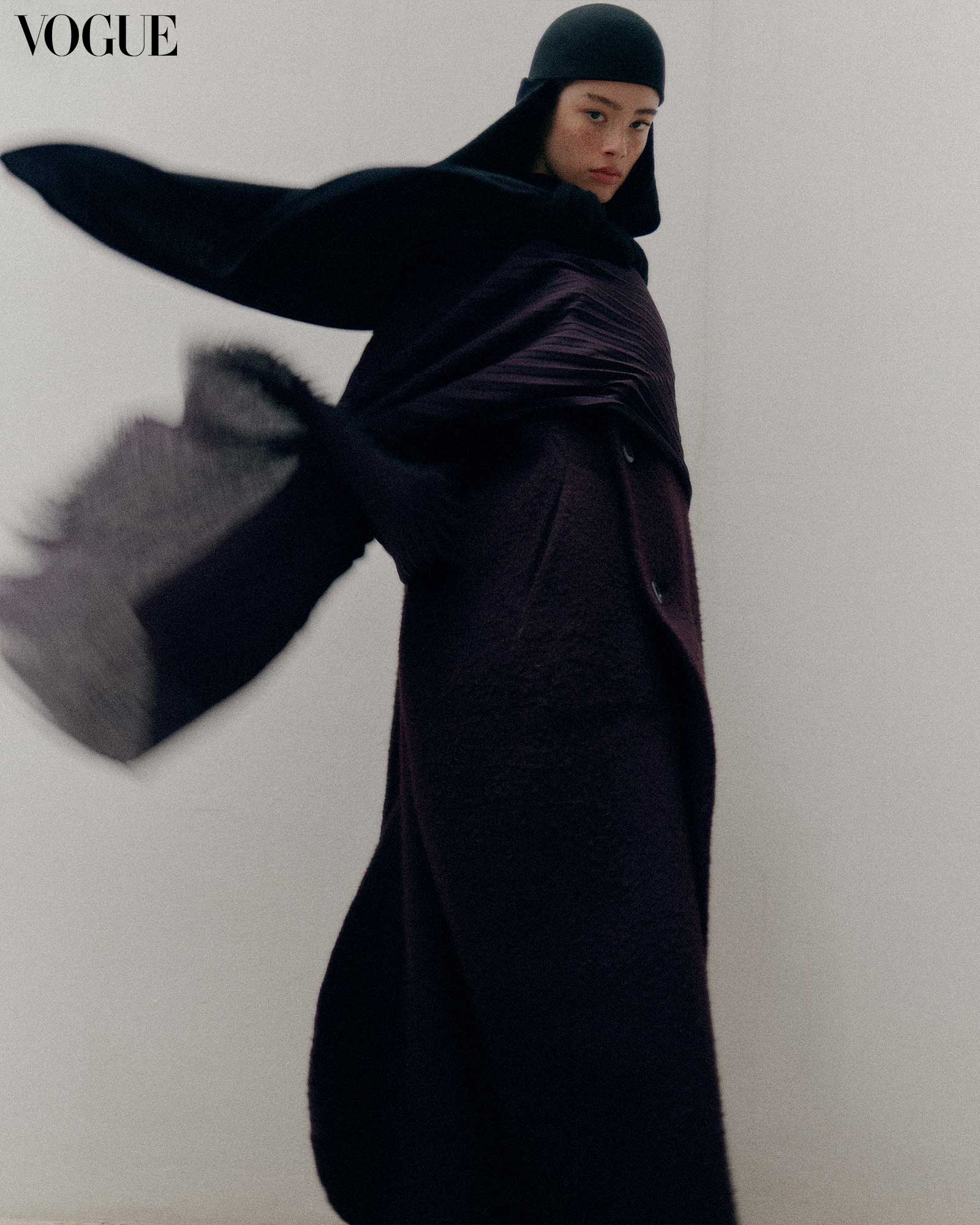 ISSEY MIYAKE head scarf, jacket, and boots. Photographed by Álvaro Gracia for the November 2024 Issue of Vogue Philippines