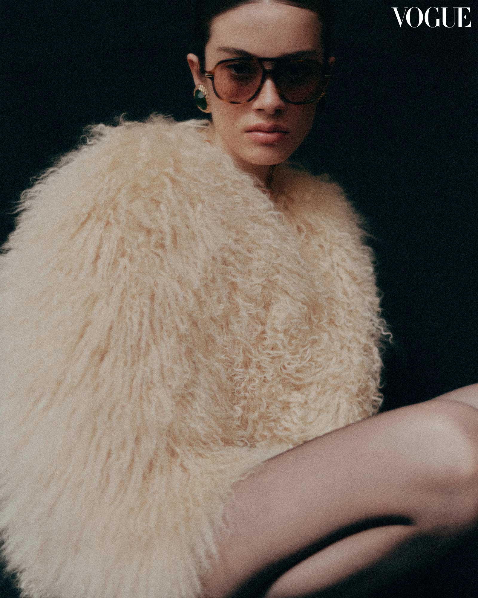 TETE BY ODETTE eco-fur coat, WOLFORD tights, vintage GUCCI sunglasses and earrings. Photographed by Álvaro Gracia for the November 2024 Issue of Vogue Philippines