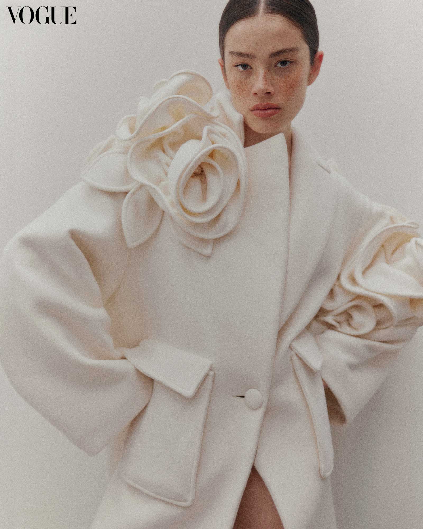 ELIE SAAB wool coat with draped flowers. Photographed by Álvaro Gracia for the November 2024 Issue of Vogue Philippines