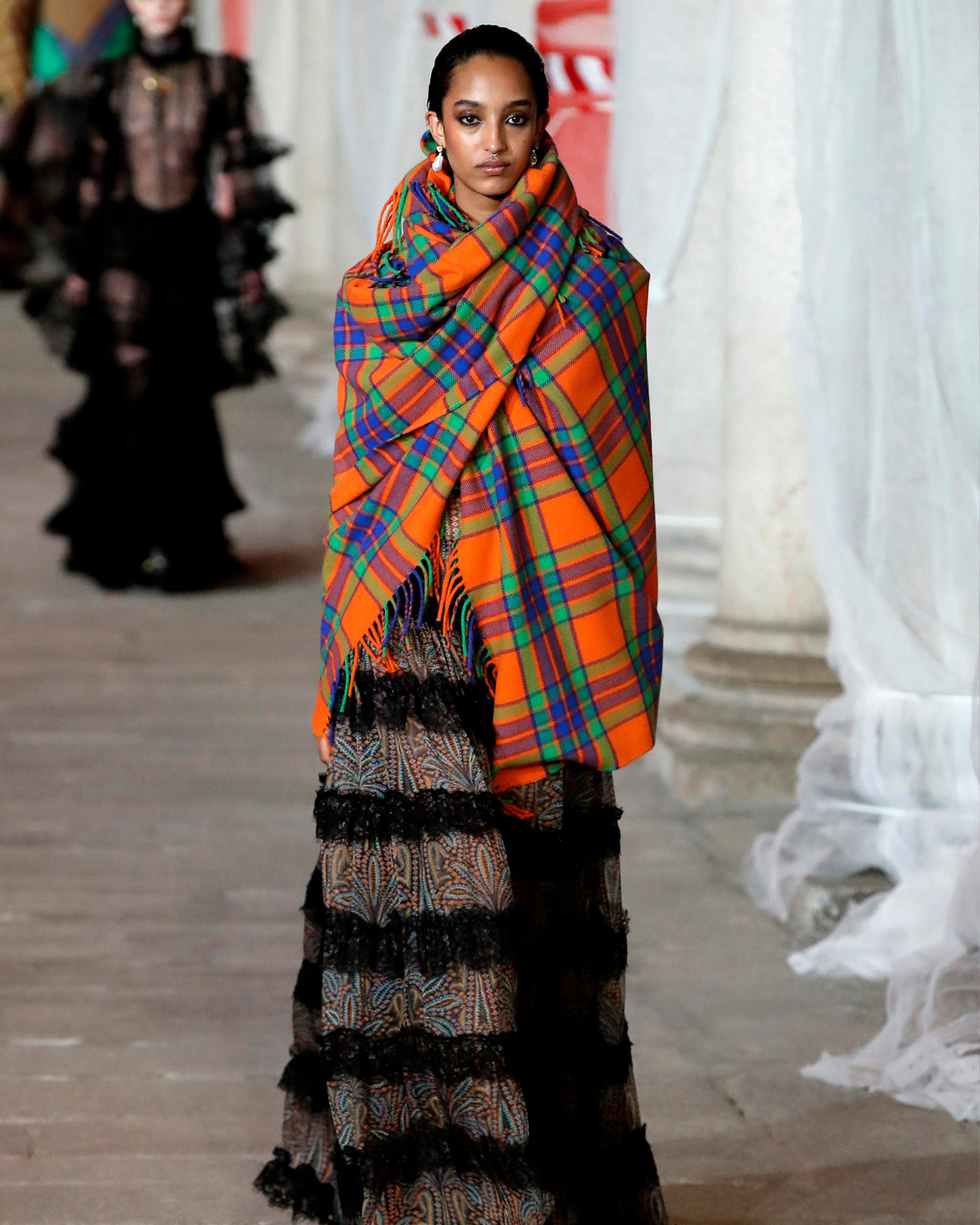 The palazzo in Milan that served as De Vincenzo’s venue was dressed to look like a construction site, with plastic tarp and scaffolding set up around the pillars. The effect was of a work in progress, a nod to the designer’s relationship to the house that has become his home. “Delving into the history of a brand is, after all, an archaeological undertaking,” Etro said.