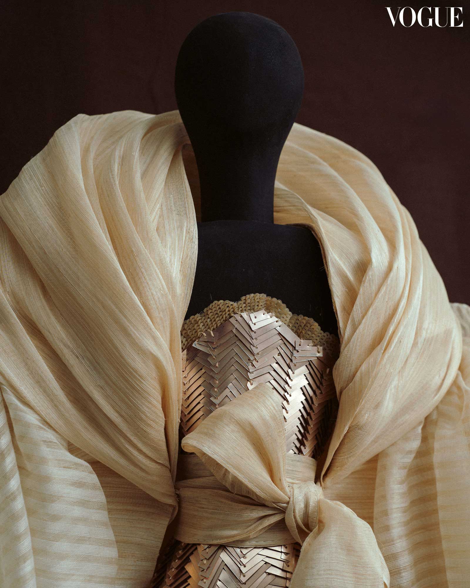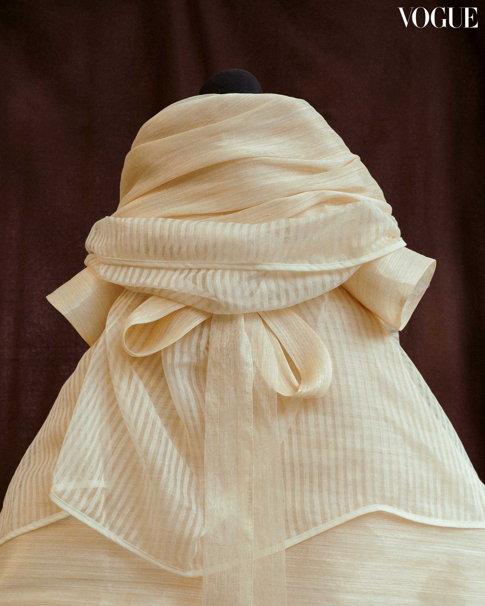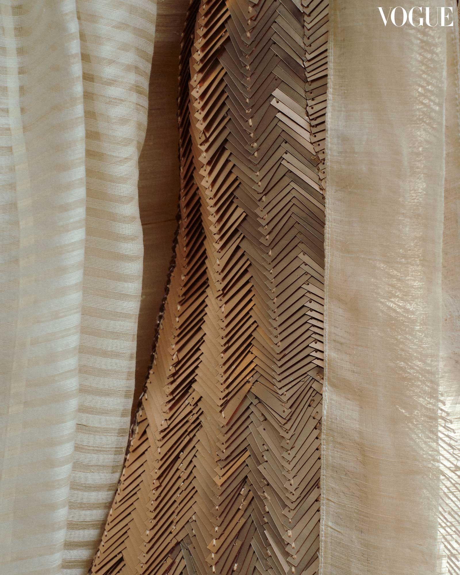 For Vogue Threads, Ezra Santos presents a design inspired by the rugged beauty of the vakul, a traditional protective garment from Batanes. In this design, Santos incorporates abaca, straw, beads, and Swarovski crystals into a hand-embroidered gown. The gown is enveloped by a floor-length outerwear resembling a pañuelo, tied with a sash around the waist. Overall, the gown took 240 hours of hand embroidery and another 120 hours of hand stitching.