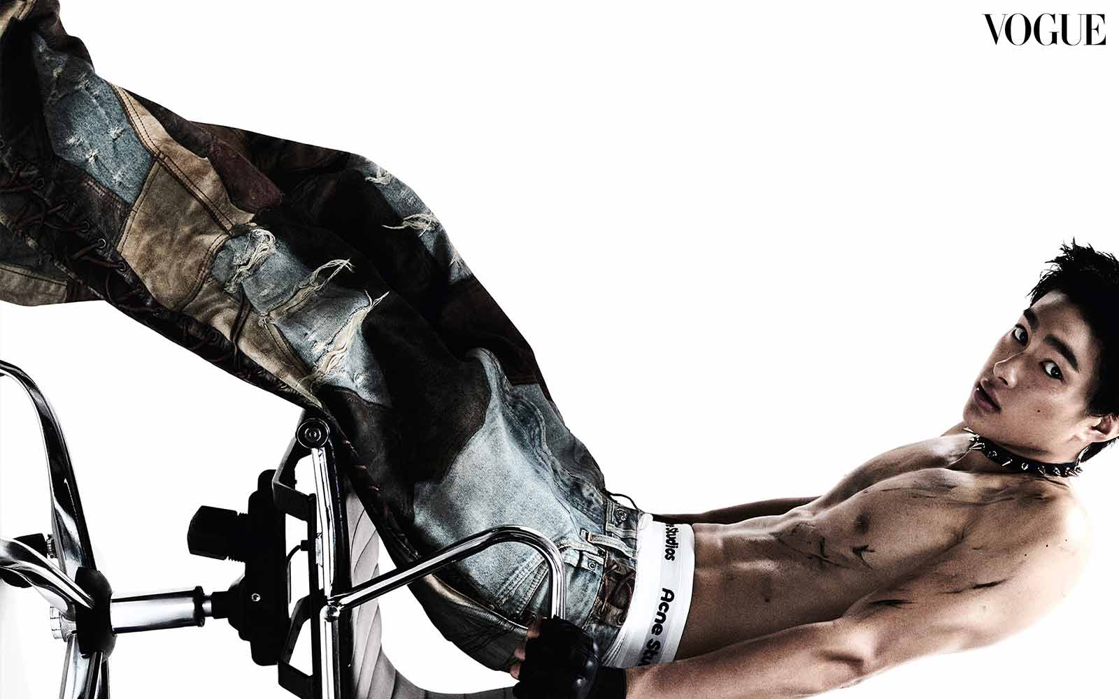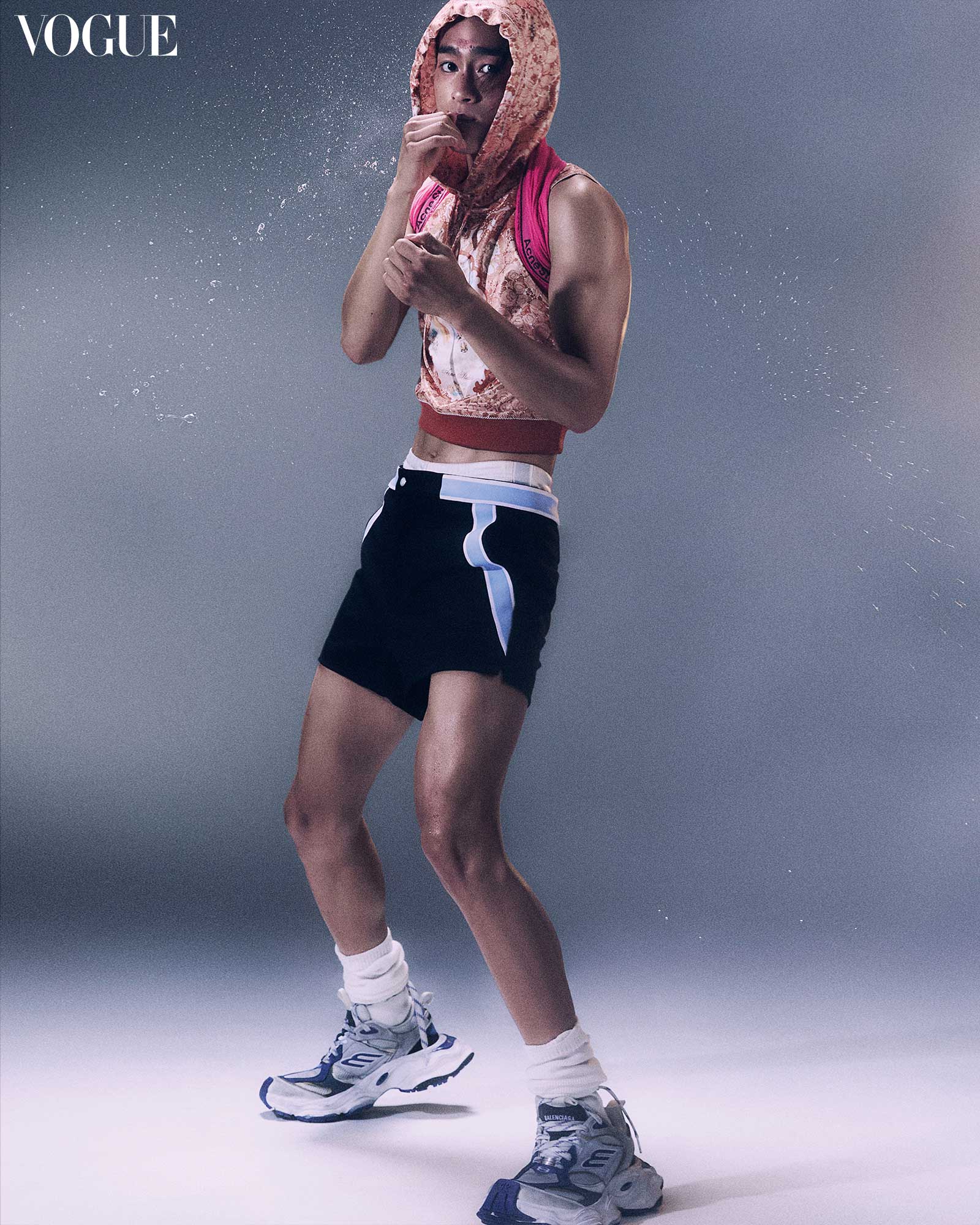 ACNE STUDIOS top, scarf, and underwear, VERSACE shorts, BALENCIAGA shoes. Photographed by Sang Hun Lee for the August 2024 Issue of Vogue Man Philippines