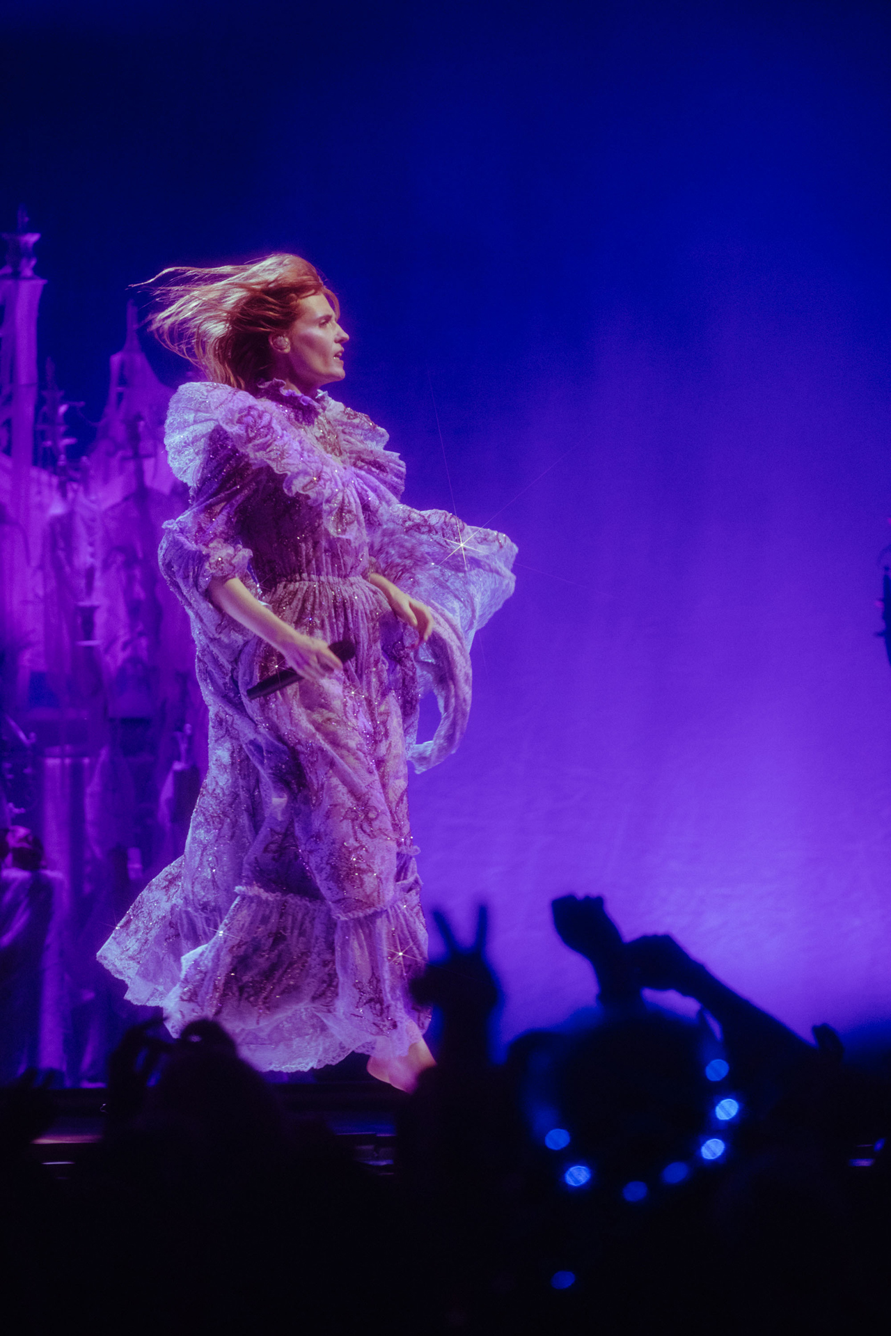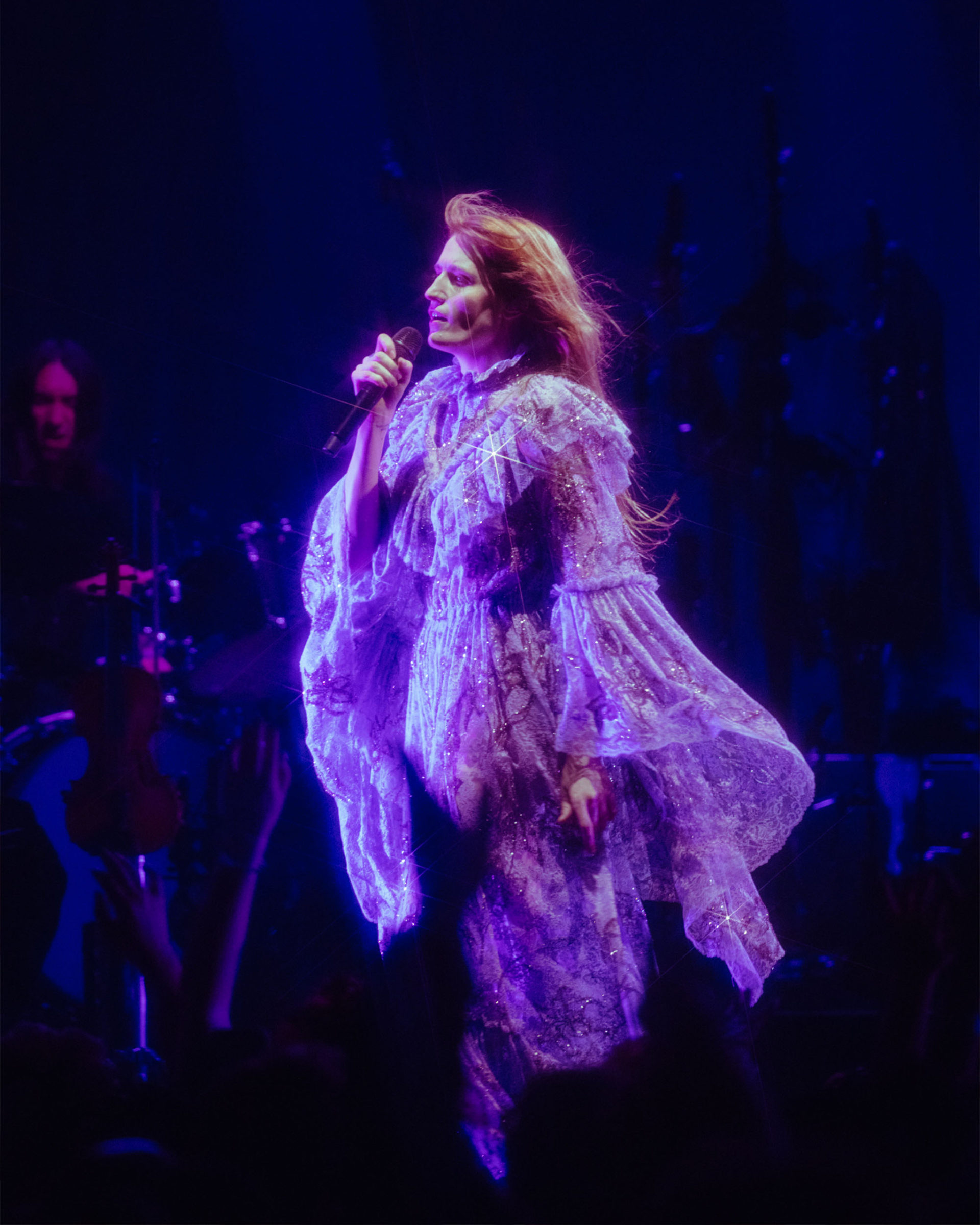 To bring that vision to life, Welch enlisted Gucci’s Alessandro Michele to conjure up the designs. It was a natural fit, given Welch has served as a muse to the designer before, and Welch says they share a similar approach to stage wear. “Alle just knows how to dress my body at this point,” says Welch. “The dresses add so much to the performance, while always giving me freedom to move. And Gucci really dove into the fairytale with us.” He created pieces such as lace-trimmed maxi dresses, or ruffled gowns in sheer lilac. “I loved the chokers and the sequined embroidery,” she says. “This is the most detail we have ever had on stage outfits, and I’m so grateful to Gucci for all the time and love they have put into them.”
