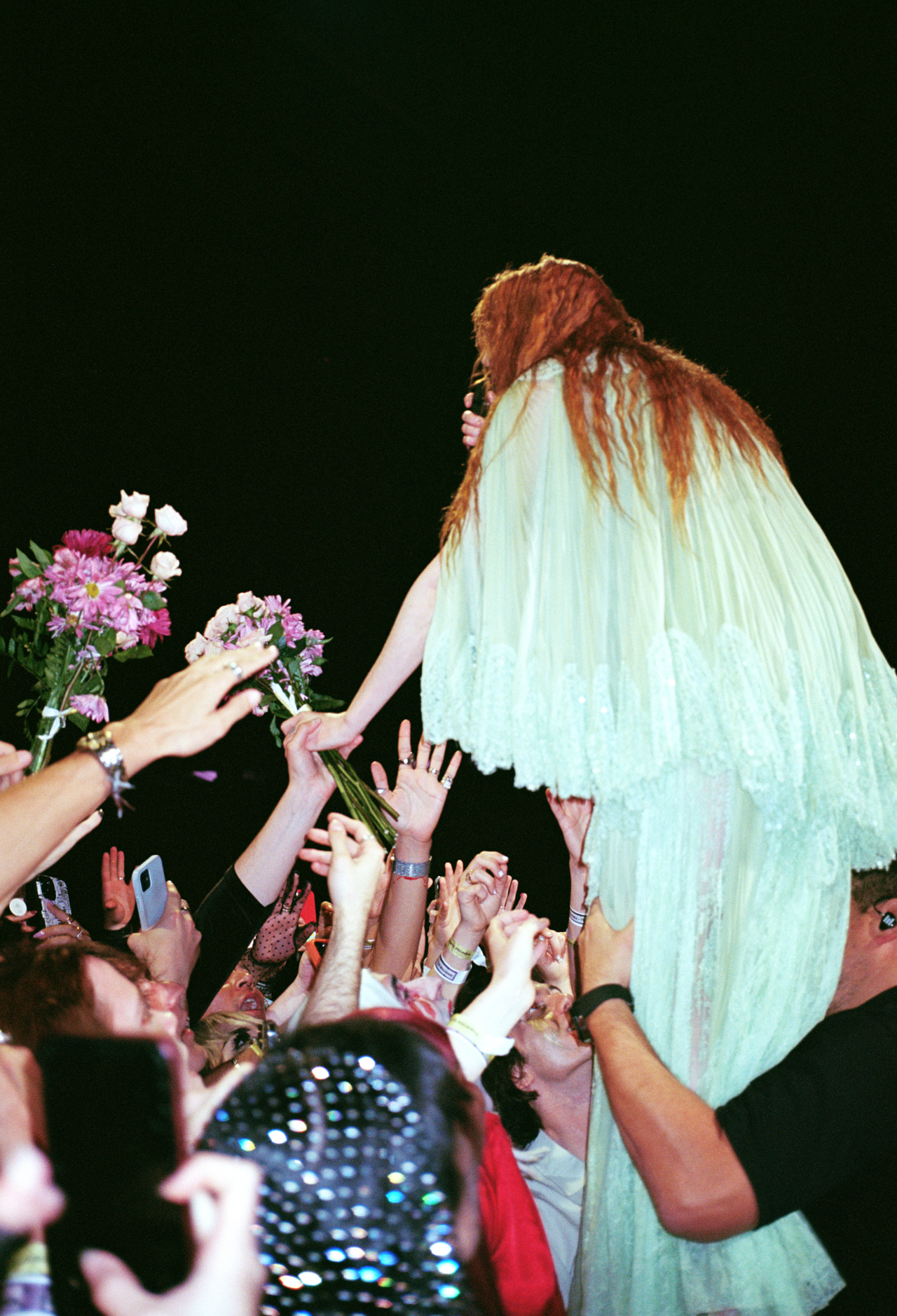 As she continues touring through the end of the year, Welch will likely debut a few more new Gucci looks on stage. She says it’s already been her favorite tour to date. “From the stage to the clothes, to the looks that the crowd are showing up in,” says Welch. “Maybe it’s something about the theatricality of this album. But it really feels like the audience feel free to express themselves in their outfits, too. We’ve had people dressed as vampires, demon brides, Midsomer flower cults, and holy relics. No matter how tired I am, I now always look forward to seeing what everyone is wearing.”