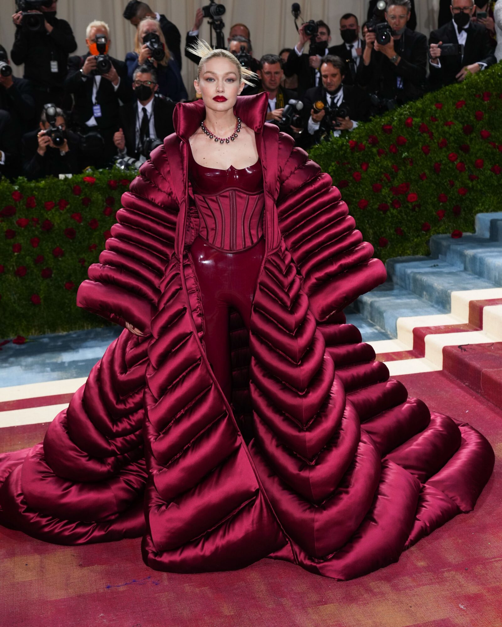 More recently, Hadid nailed the camp theme in 2019 by wearing a Michael Kors Collection ensemble that consisted of a silvery jumpsuit with a matching cape, boots, and headpiece. In 2021, she hit the red carpet in a strapless gown by Prada, complete with a back slit and leather opera gloves—a look that was equal parts timeless and super modern. Last year, she opted for a puffer coat-inspired gown in crimson red that was custom-designed by Donatella Versace.