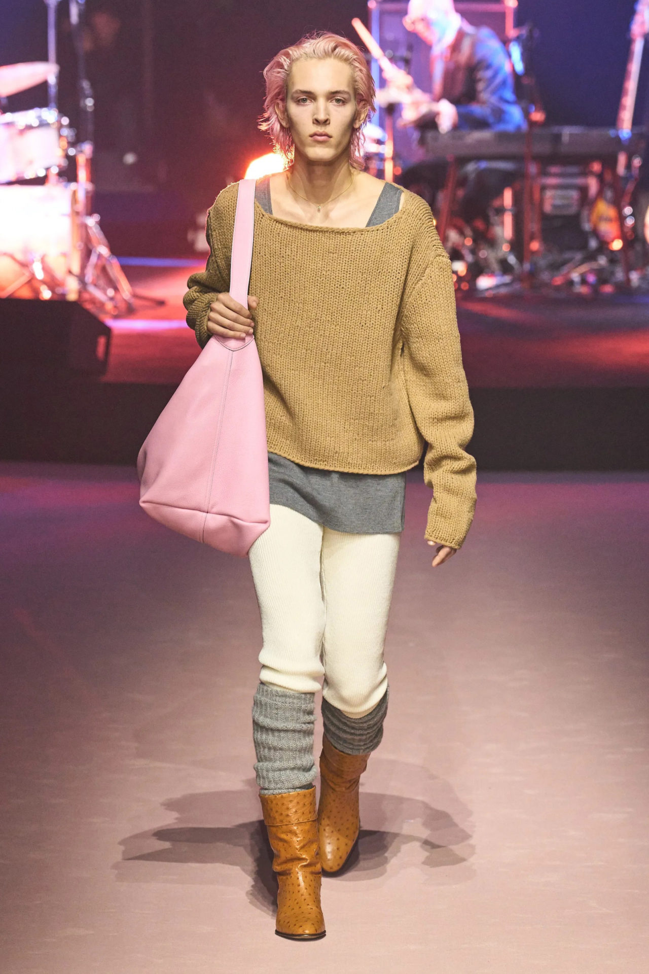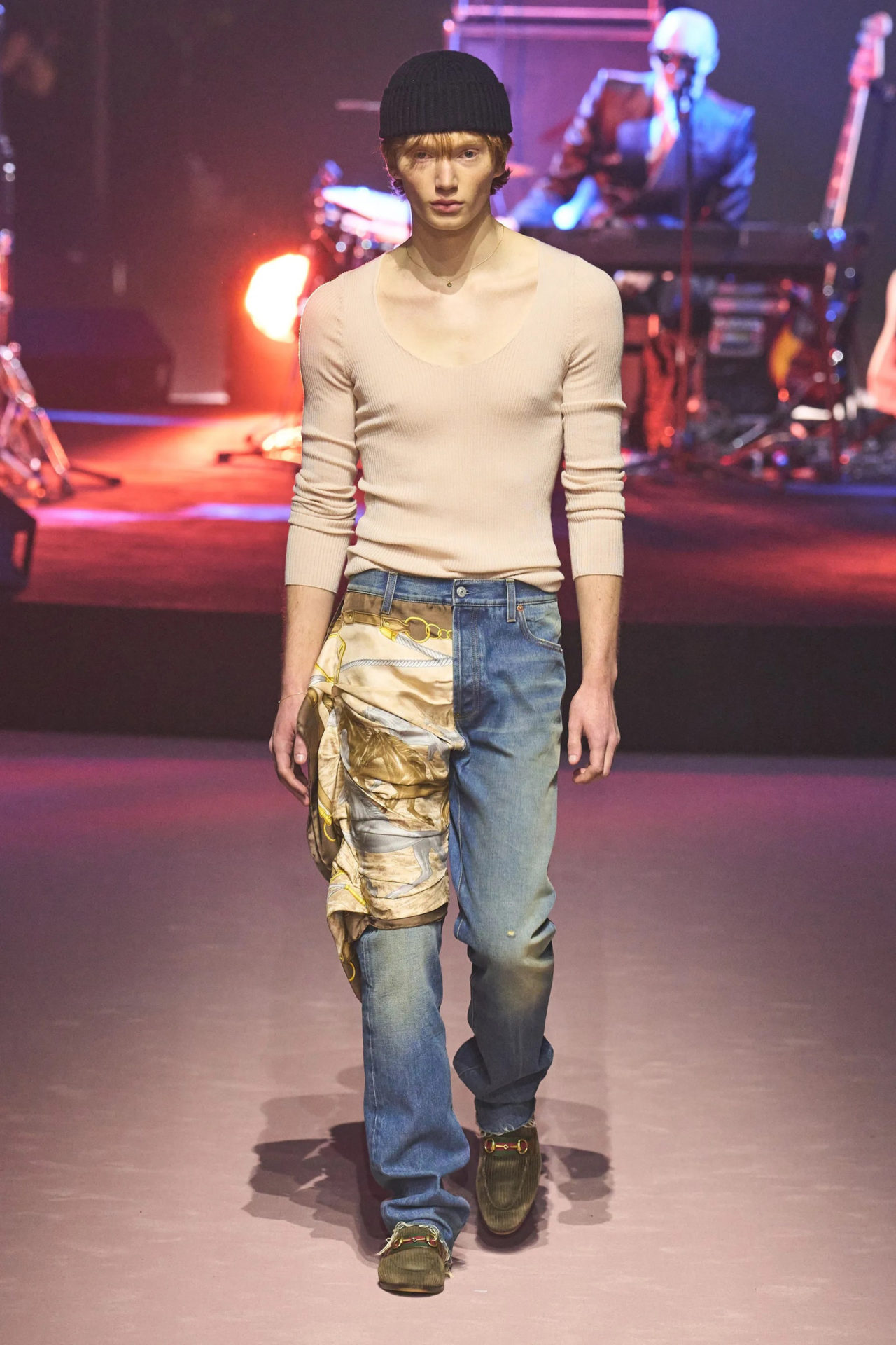Staged in the Gucci Hub in Via Mecenate, the models circled a big round platform. On top of it was the band Marc Ribot’s Ceramic Dog—fronted by the man whose name it carries—who performed a live orchestration interpreting the theme of improvisation. It drew on elements of jazz and punk exemplary of the point Gucci was making: music genres in which the untrained ear can’t detect a system, but which require the utmost skill and precision. As the show progressed, the arrangement expanded in sound, culminating in an invigorating climax. Like the collection, the performance marked a departure from the musical influences of Michele’s work, and Gucci’s choice to change things up rather than emulating what had been felt like the right way to go forward.