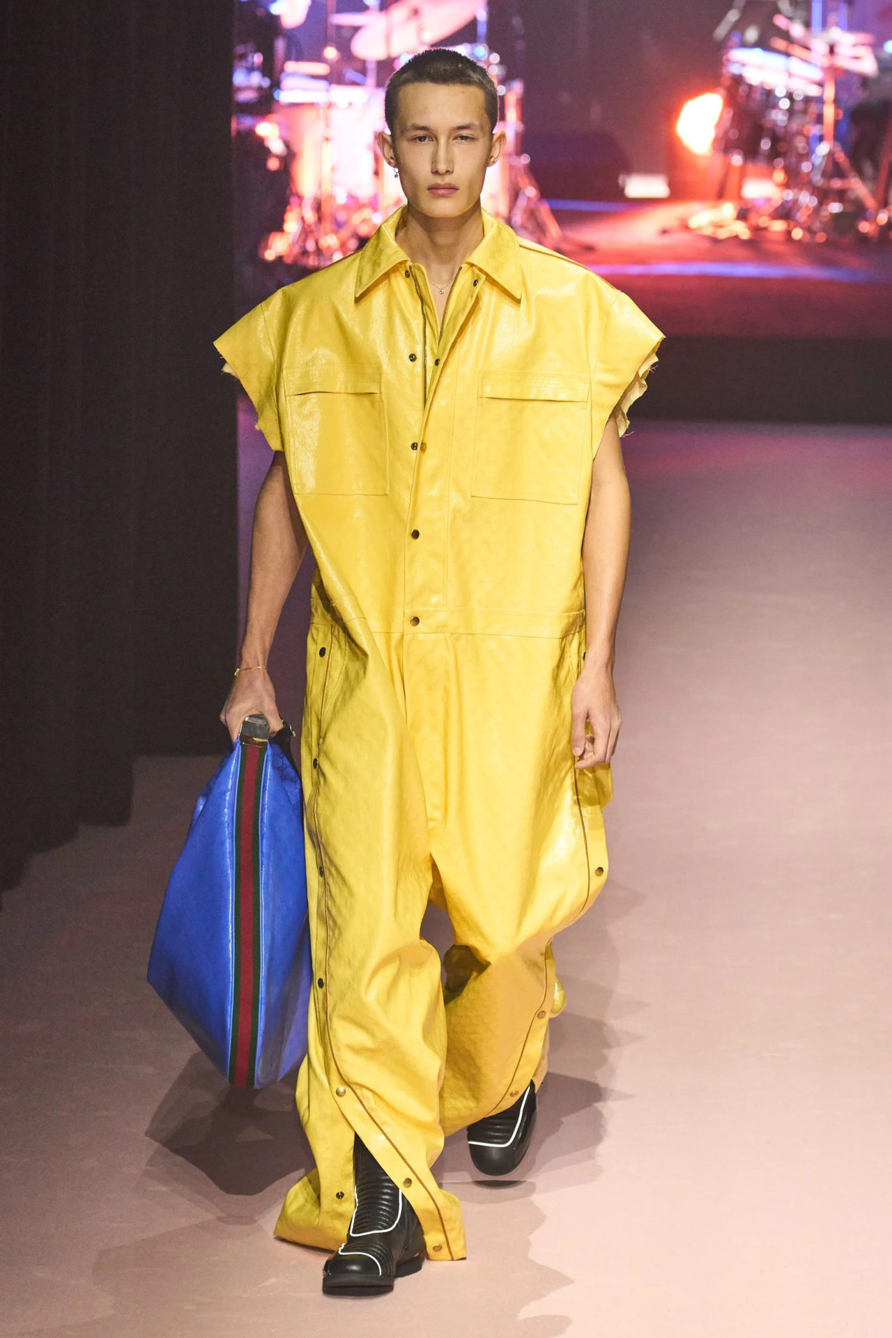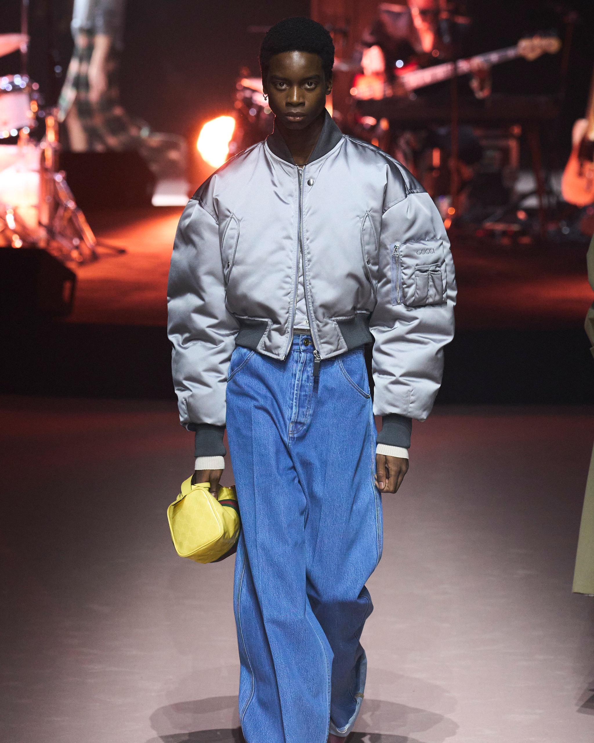 Delving into the archives was a natural point of departure for a collection that signified an interval for Gucci. While the house awaits its next artistic director, the design team had looked to the history that defines it. It was suggested in the 1980s silhouettes that appeared towards the end of the show— dance clothes, leg warmers, gilet tracksuits, soft ankle boots—and in the Tom Ford-centric references that made nostalgic Y2K hearts grow fonder. Next to washed, almost golden denim trousers, those included motorcycle jackets and trousers in leather, which paved the way for oversized coveralls. One was crafted in black Crystal GG canvas, a lacquered take on the house’s monogram cloth that also appeared in accessories.