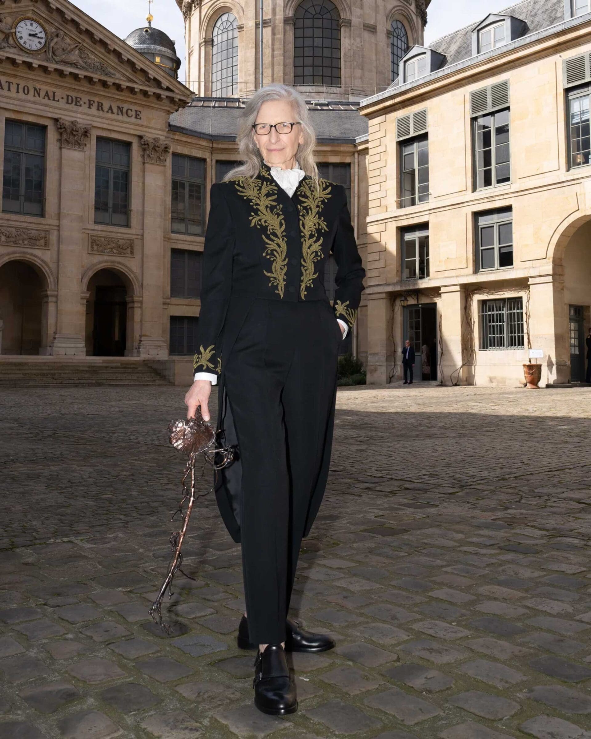 She joins as a foreign associate member of the Academy of Fine Arts, and for the occasion, Leibovitz wore a custom suit by Nicolas Ghesquière, Louis Vuitton’s artistic director of the women’s collections. For her look, Ghesquière referenced men’s courtly attire of the ancien régime with a black frock coat with gold embroidery. Following her induction, Leibovitz would accessorize the suit with the Académie’s ceremonial sword, a symbol of membership. Per the Académie, “Far from being a harbinger of future battles, it is a sign of existence, and therefore of respect.”
