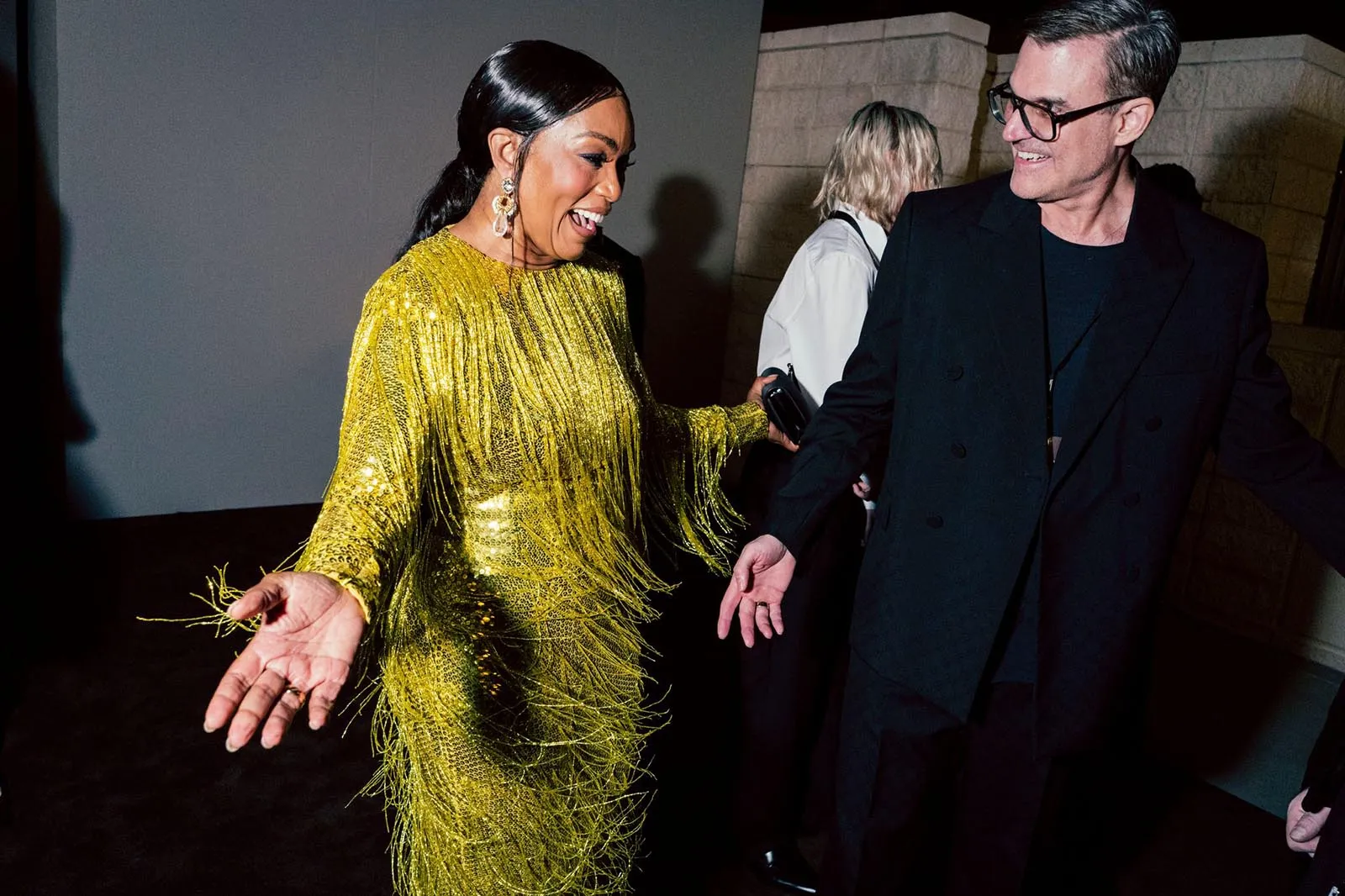 Angela Bassett chose a vivid chartreuse fringed frock for the occasion. “I’m having so much fun wearing this dress,” Bassett said of her Gucci gown as she shimmied. “I love it—it’s a work of art in itself.” Bassett shared that the 1975 film Mahogany, starring Diana Ross, is always on her fashion moodboard when it comes to getting red carpet ready. “I remember Diana wore the most glamorous looks that reflected her character’s journey from a fashion student to a world-renowned designer, and I wanted to dress like her. She had a one-shoulder purple dress with a fur muff and turban that was absolutely incredible.”