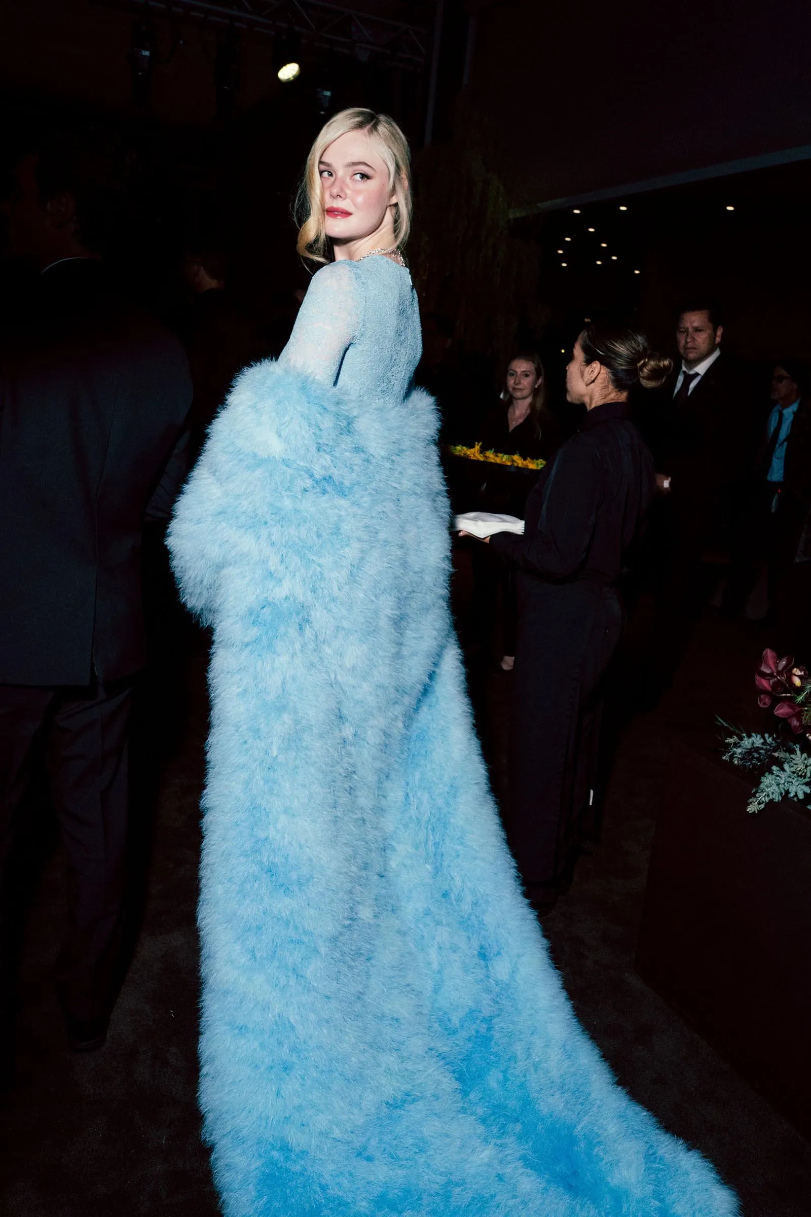 At the center table sat Crawford, who shared a long conversation with Demna’s muse Demi Moore, who was resplendent in a spectacular jeweled gown with a regal high neck. Meanwhile, Gerber left her seat next to her mom to reunite with friends and fellow runway regulars, models Paloma Elsesser and Alex Consani. Crouching down on the floor, she placed her arms on the table for an animated chat as they pose for selfies. Nearby, Elle Fanning—in baby blue lace with sheer long sleeves and a fluffy coat draped around her arms—spoke with Demna. “It’s a beautiful color that I don’t wear a lot and I love it,” Fanning told Vogue earlier in the night. “I tried it on and it zipped up like a glove.”