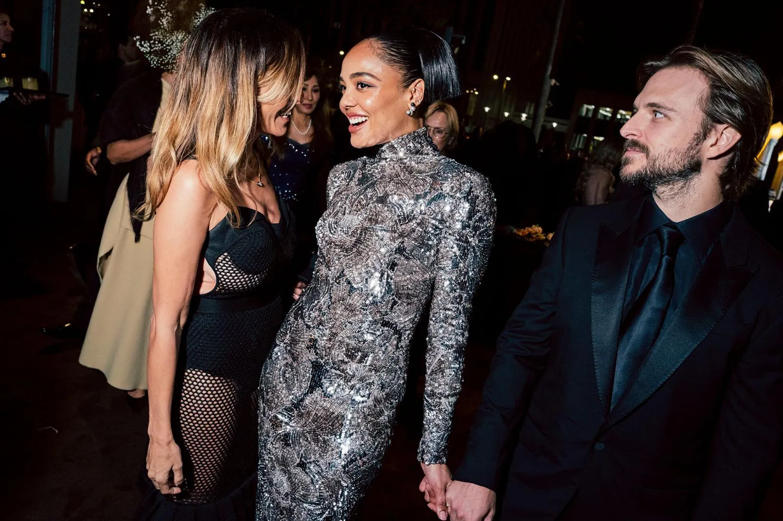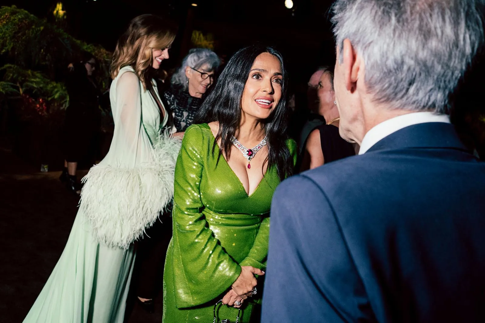 Salma Hayek Pinault was spotted chatting with Tessa Thompson, who was dressed in a metallic gown with a deep open back. “I feel like I’m in liquid silver! It’s exceedingly comfortable and it’s business in the front and party in the back,” she said gleefully. Thompson was in attendance to pay tribute to Coogler, who directed her in Creed alongside Michael B. Jordan. “He’s an extraordinary filmmaker. He’s interested in community and wants to expand our ideas of what’s possible with the Black identity,” she praised. “He’s the most imaginative person and truly a solid, just lovely, caring, empathetic human being.”