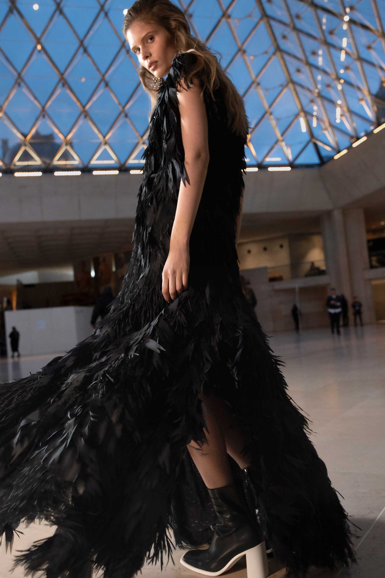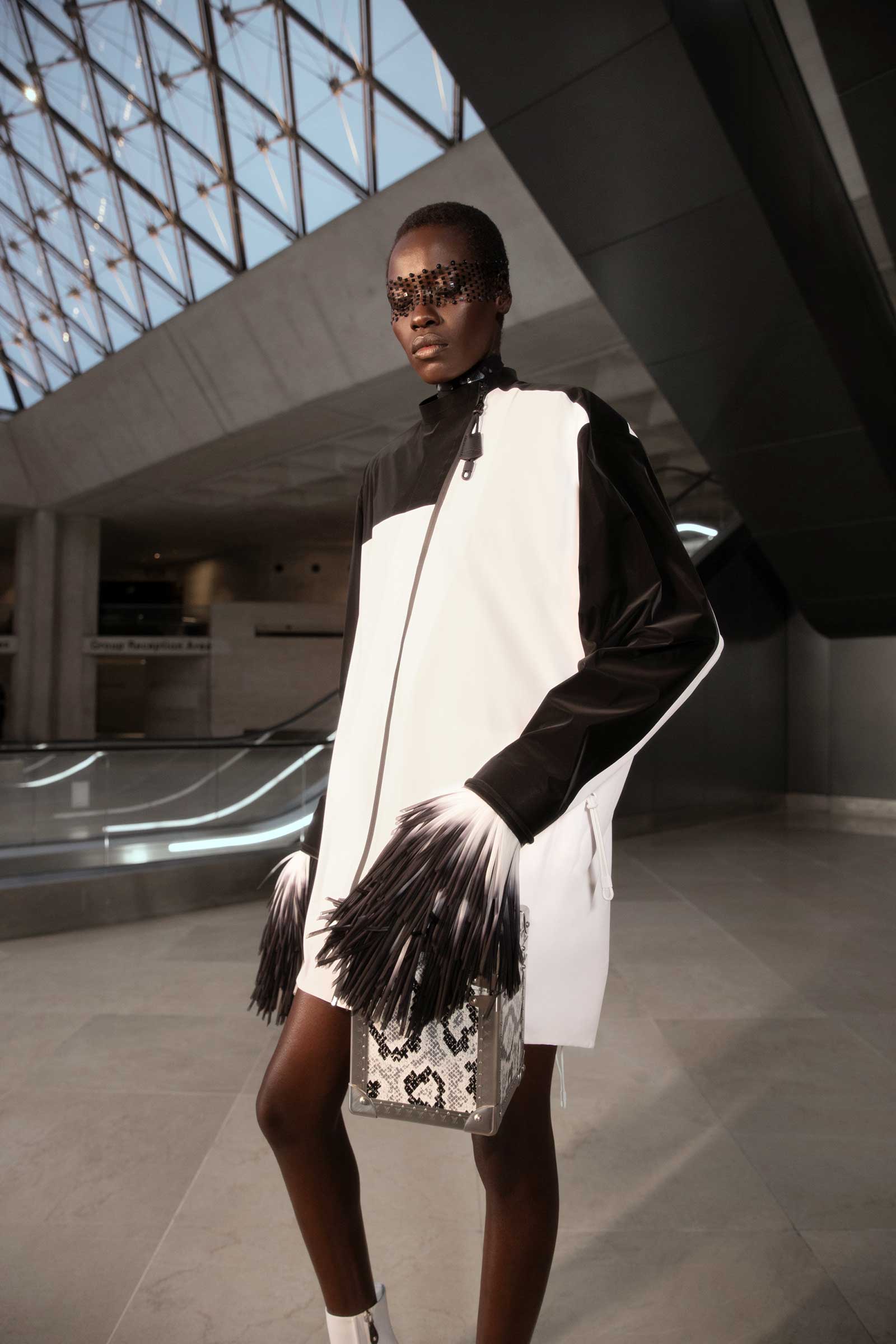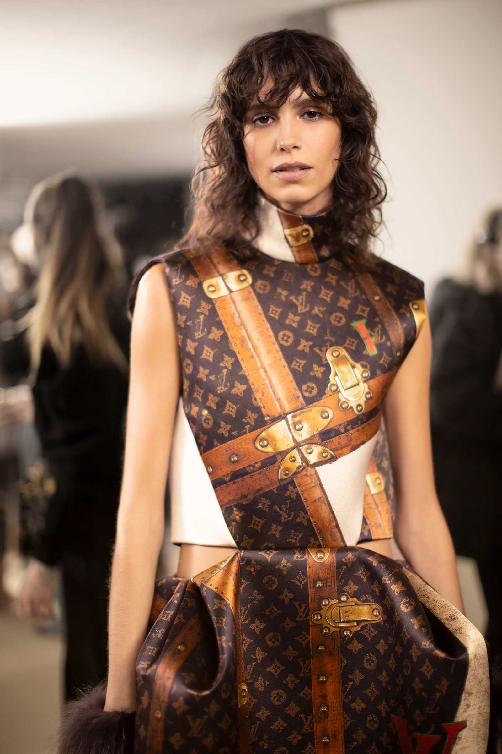In exclusive photographs taken backstage at the Cour Carrée du Louvre, see the striking detail that made up the motifs that ran throughout Nicolas Ghesquière’s tenth anniversary Louis Vuitton show: his paillette veils, trunk-printed minidresses, and the faux fur and feather cuffs that extend from tech jackets and build on silhouettes.