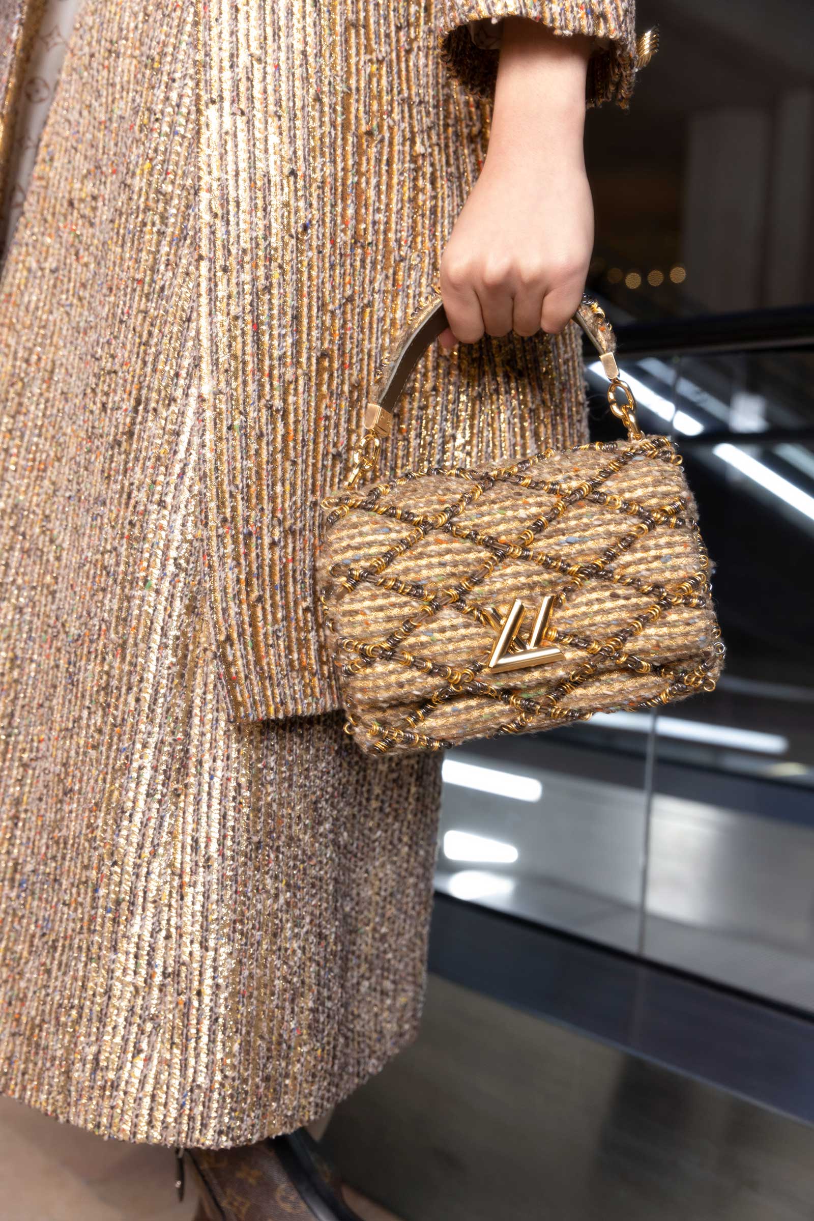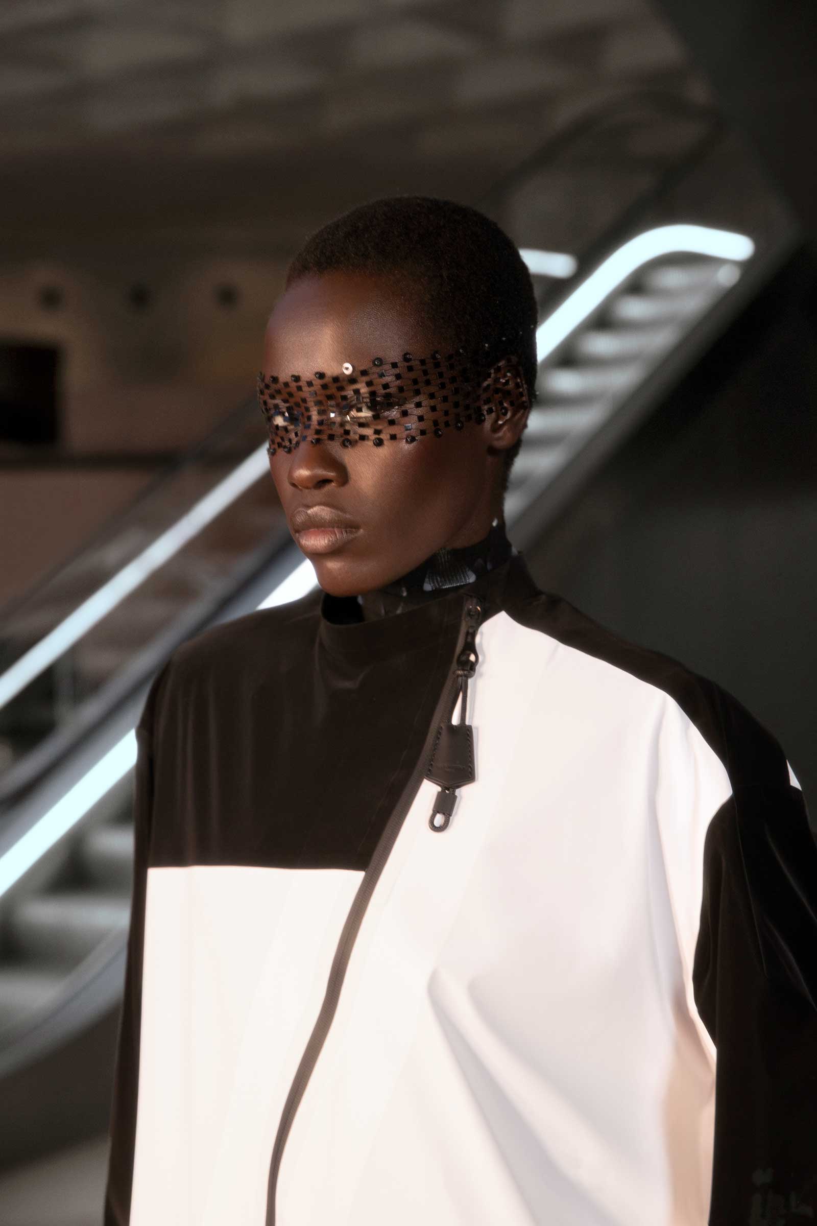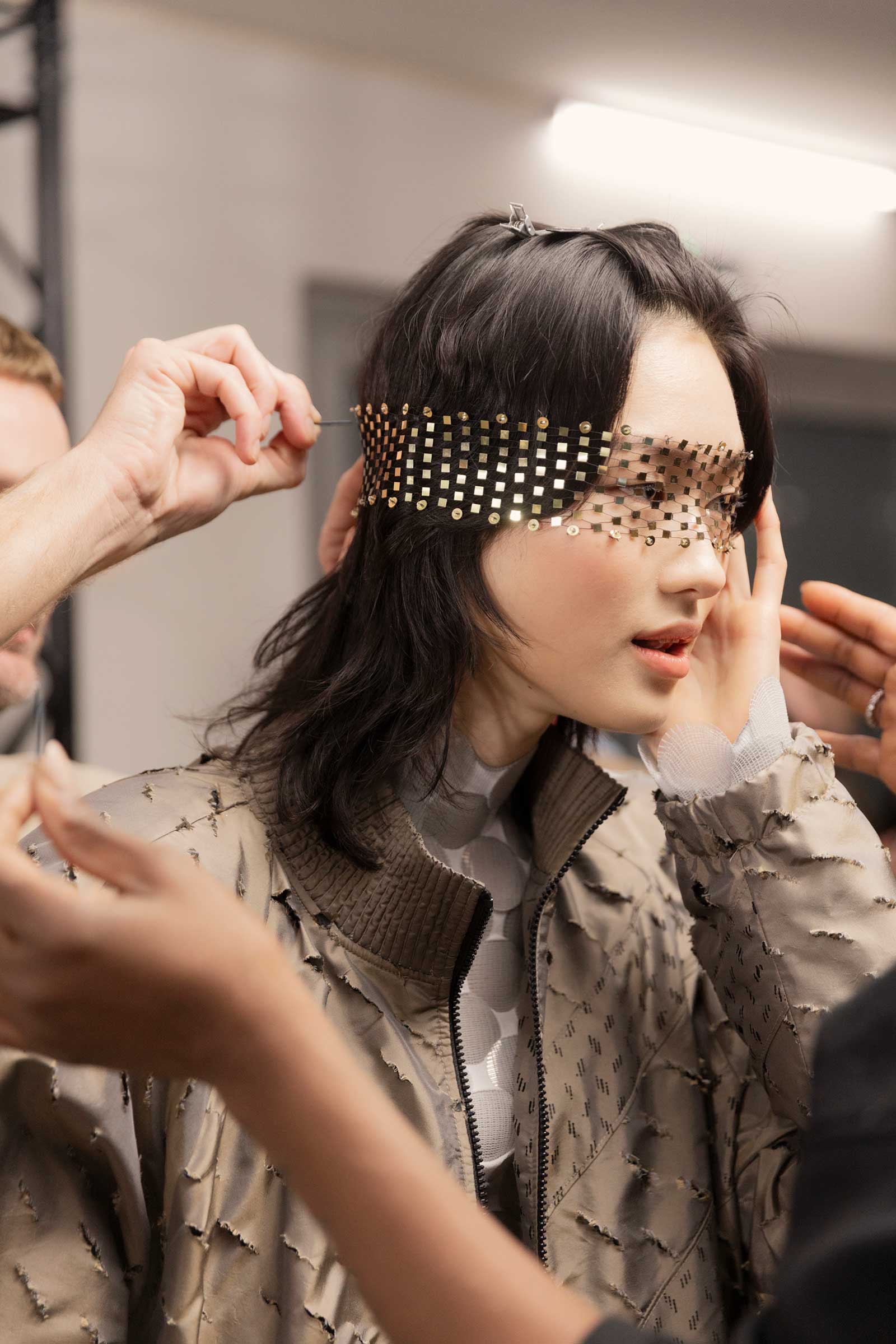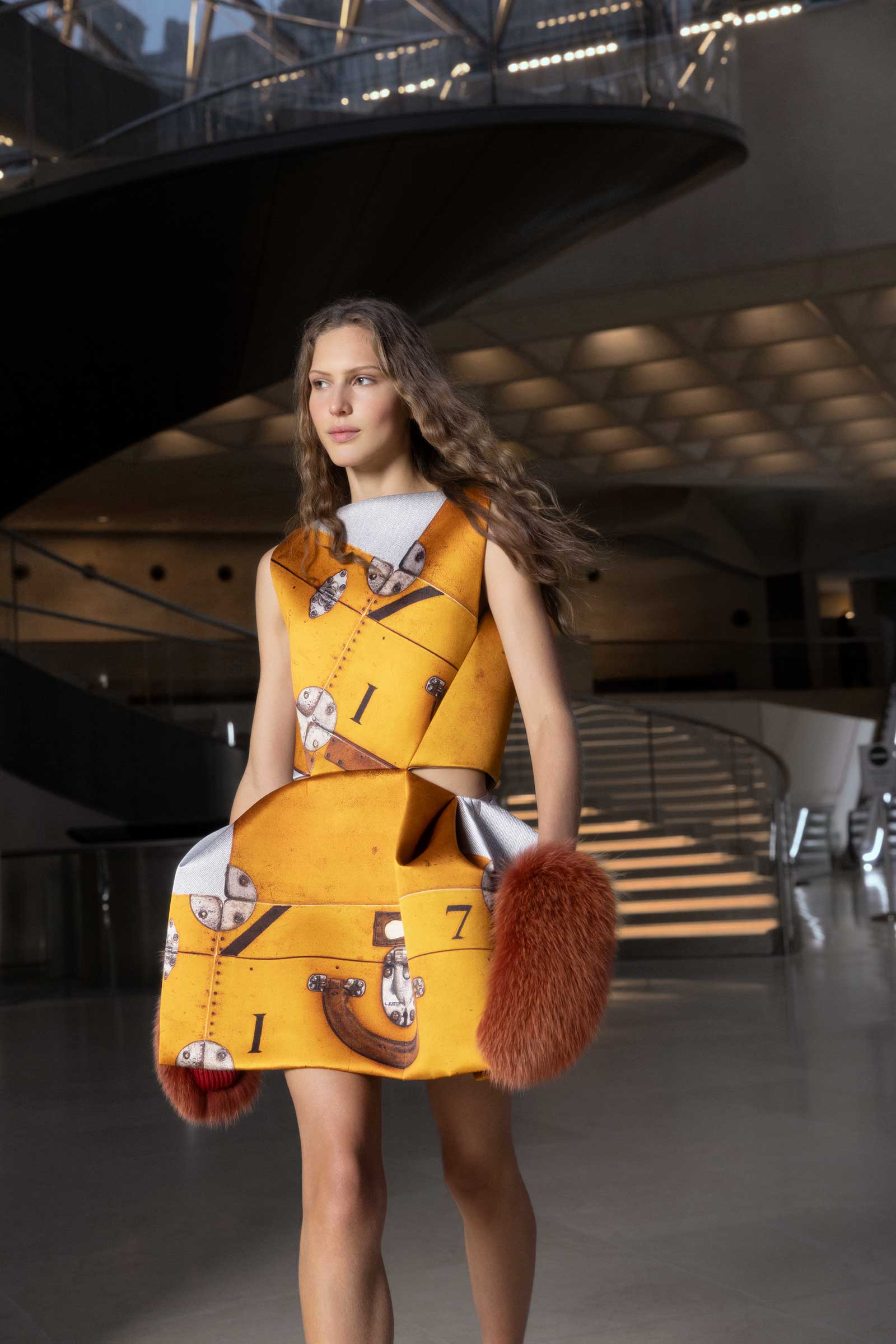 In exclusive photographs taken backstage at the Cour Carrée du Louvre, see the striking detail that made up the motifs that ran throughout Nicolas Ghesquière’s tenth anniversary Louis Vuitton show: his paillette veils, trunk-printed minidresses, and the faux fur and feather cuffs that extend from tech jackets and build on silhouettes.
