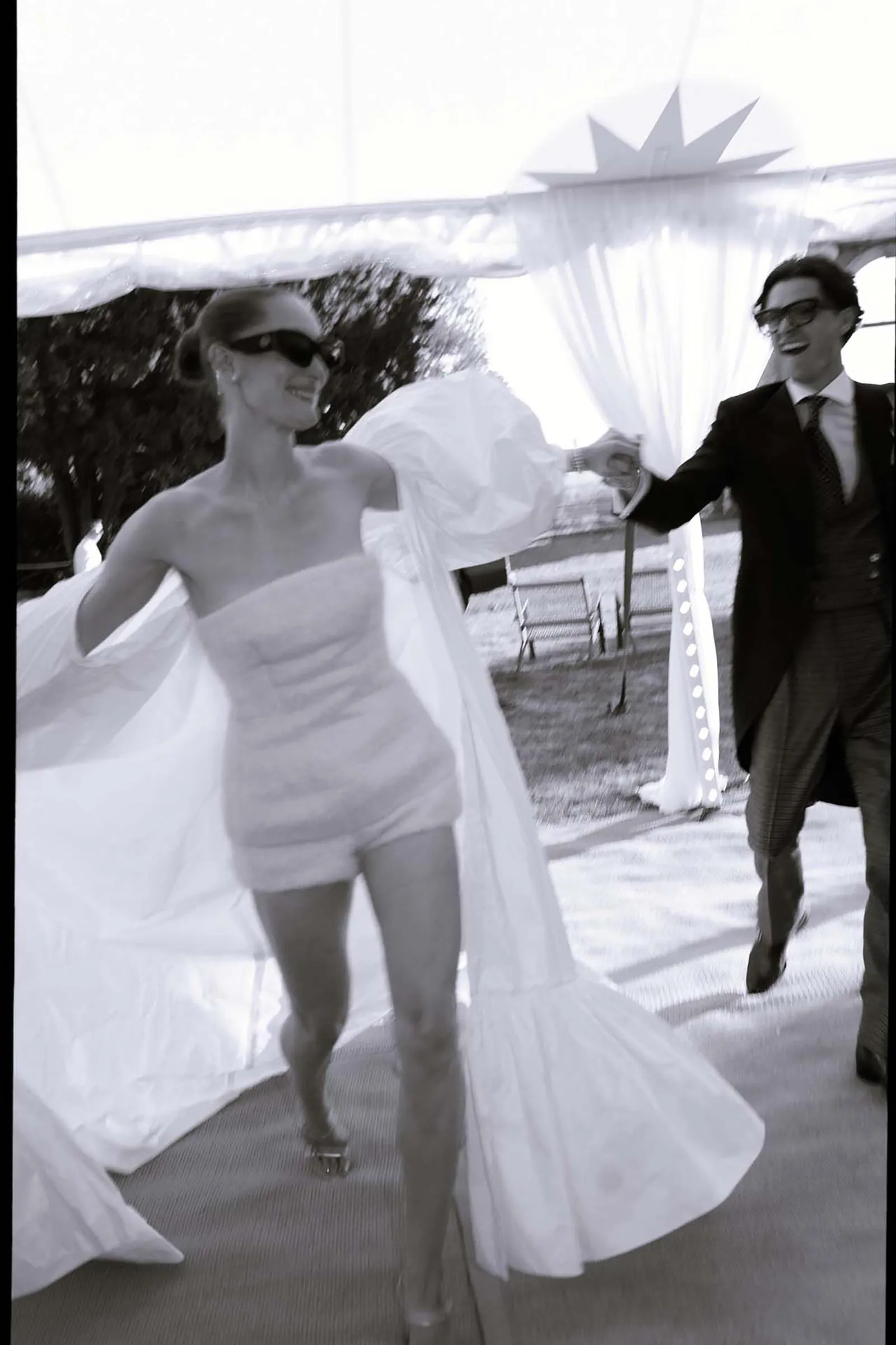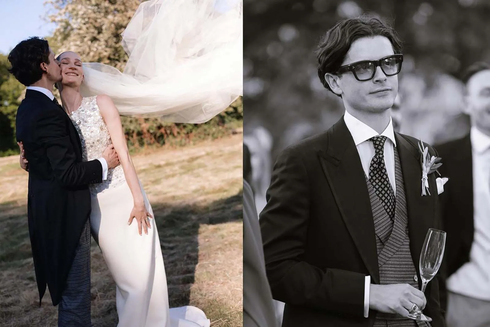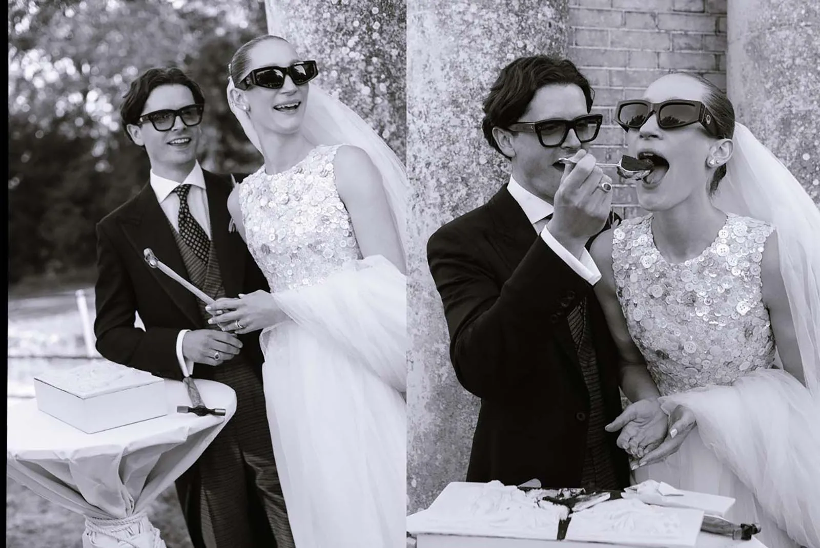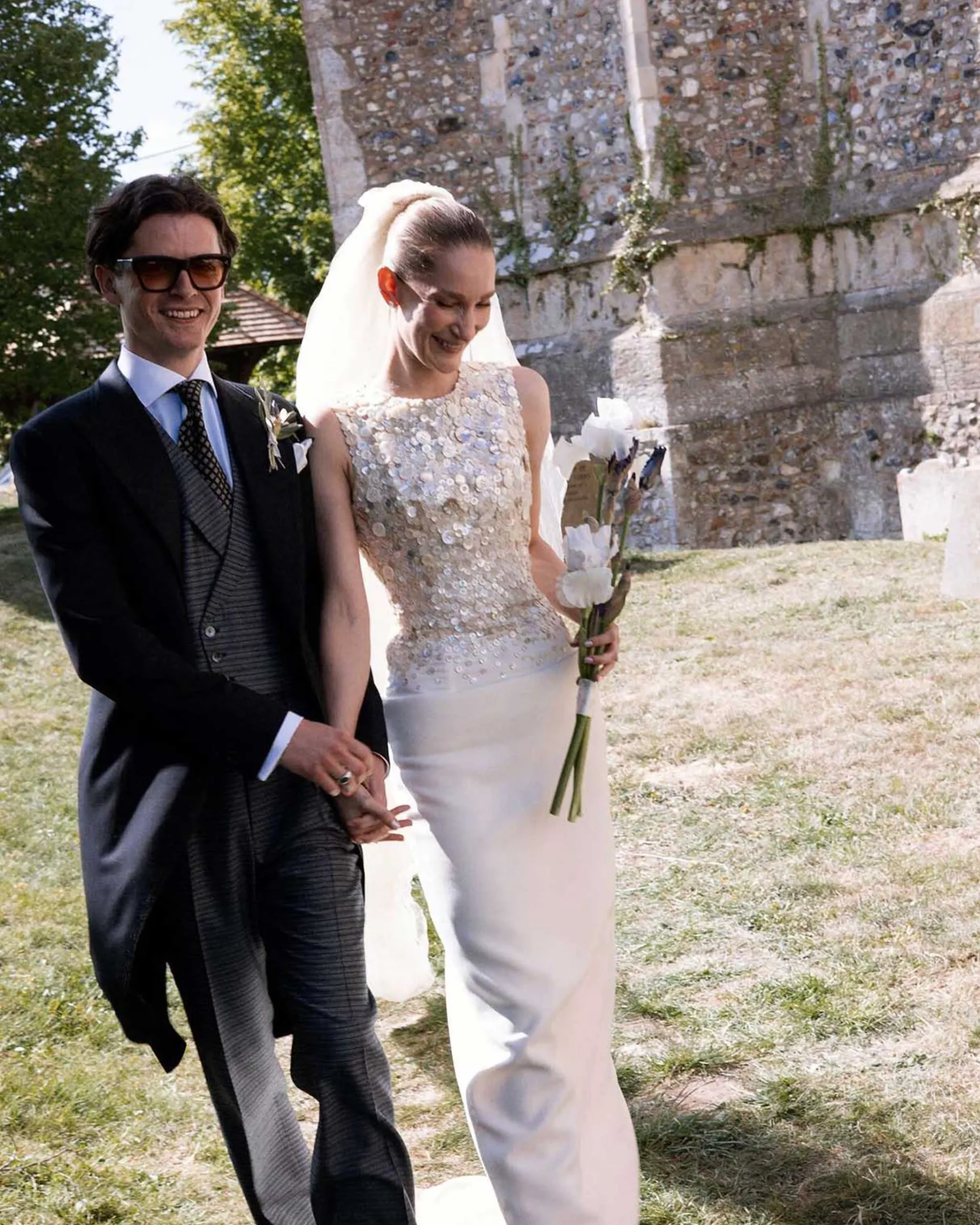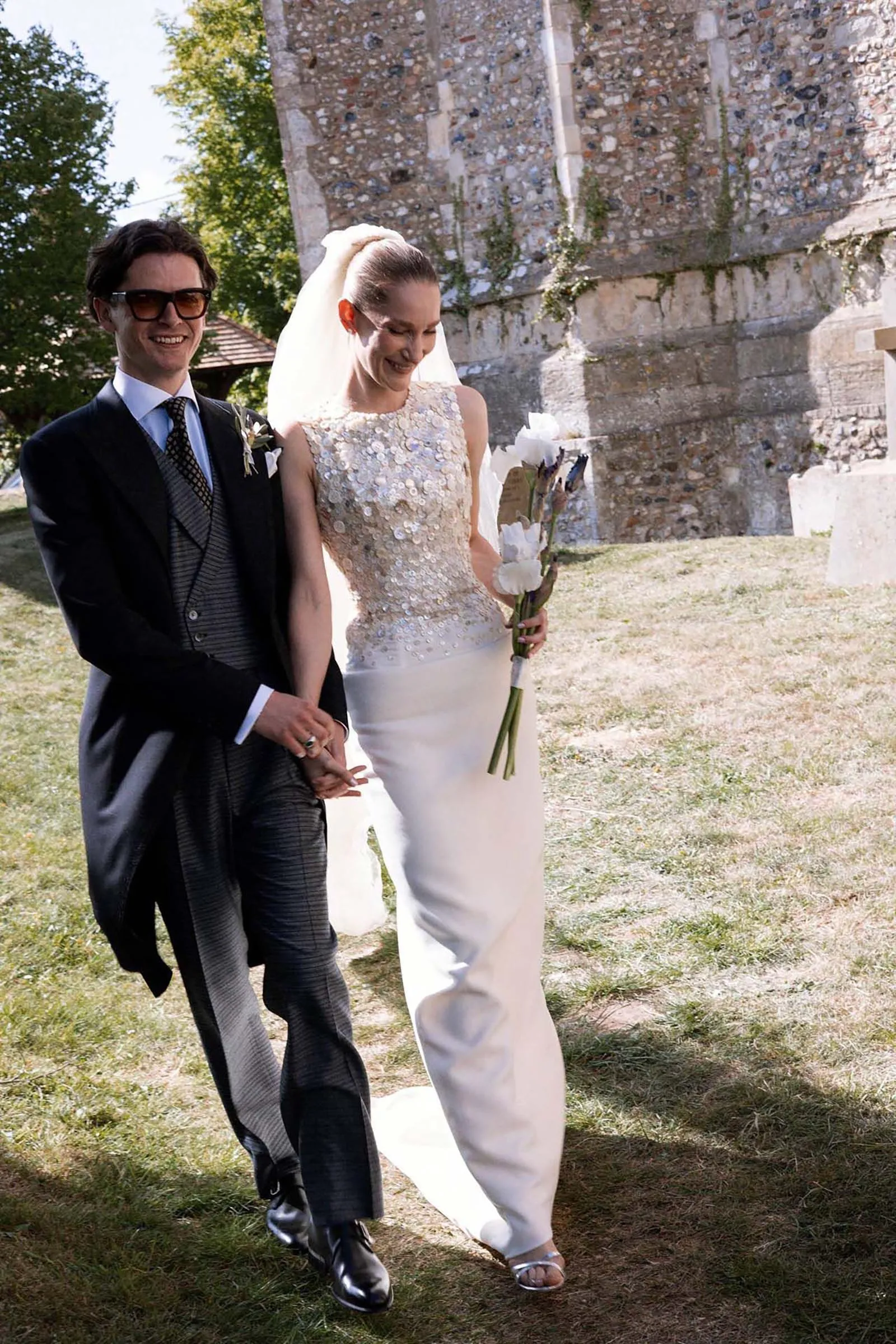 It took her sister 45 minutes to lace Judd into the dress, but by the time she said “I do”, two diamond bands, sourced vintage from Piccadilly Vaults, clasped around a bouquet of milk-white irises grown in her mother’s allotment, “I felt like a princess”. A choir serenaded the bride and groom – who runs a tailoring business with his father, and wore a bespoke Anthony Sinclair morning suit – with an arrangement of Oasis’s “Acquiesce”, as they made their way to the reception in an Aston Martin DB5. The car had a couple of false starts. Then along came a Greek-inspired feast, speeches, and the requisite outfit change into a mohair Éliane Vergès shorts set (Judd got her micro moment in the end) with a watteau-backed Henrietta Faire cape. “It was very Saint Laurent-inspired,” she says. “I felt like a diva.”