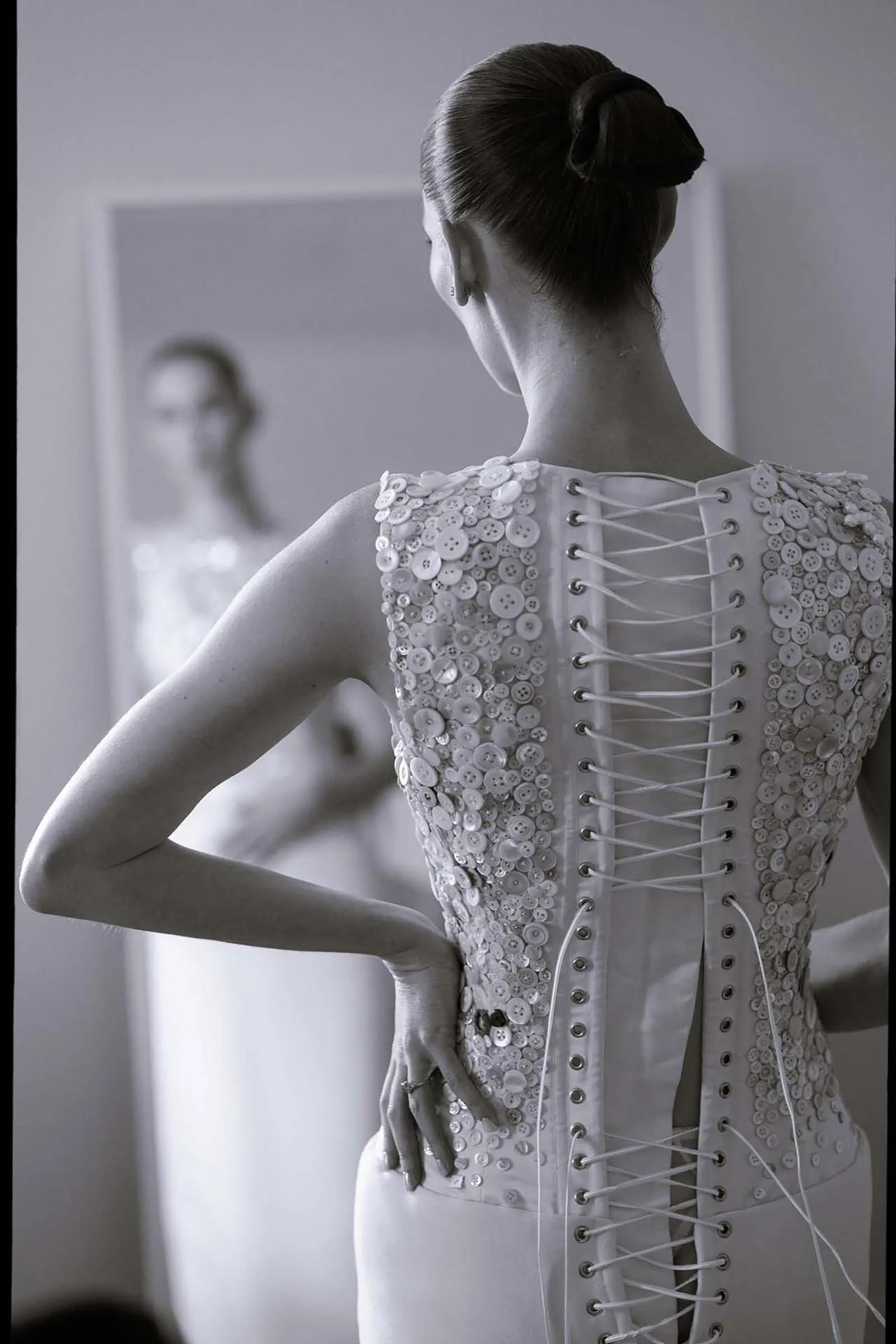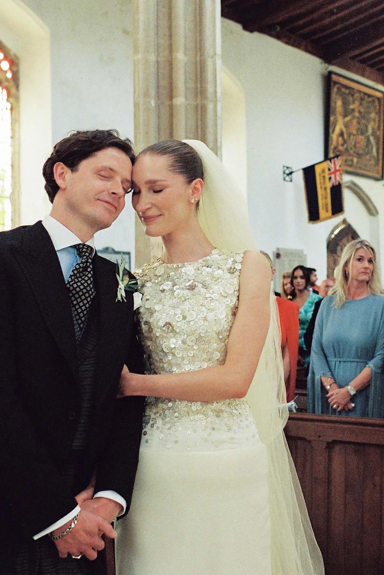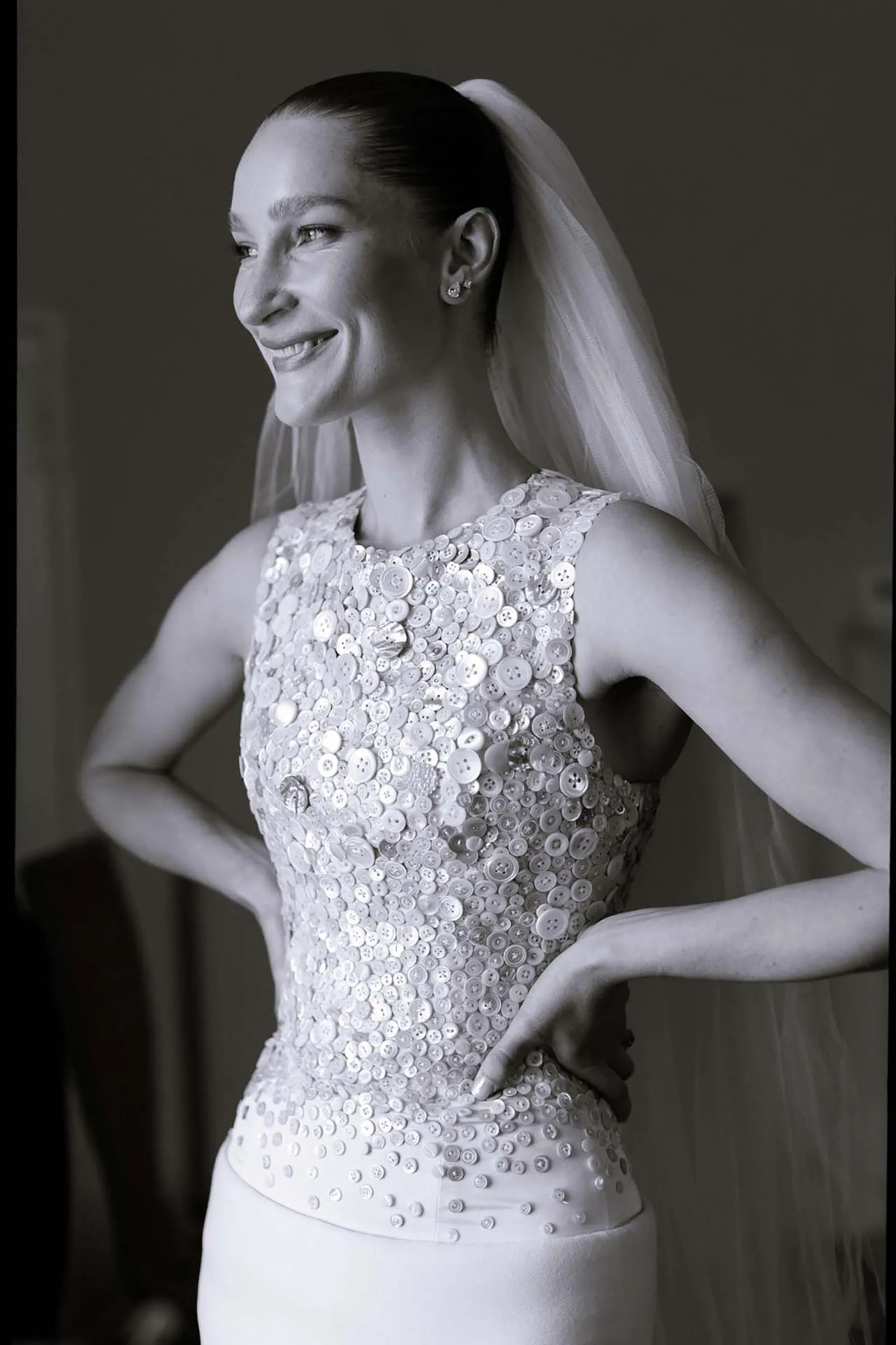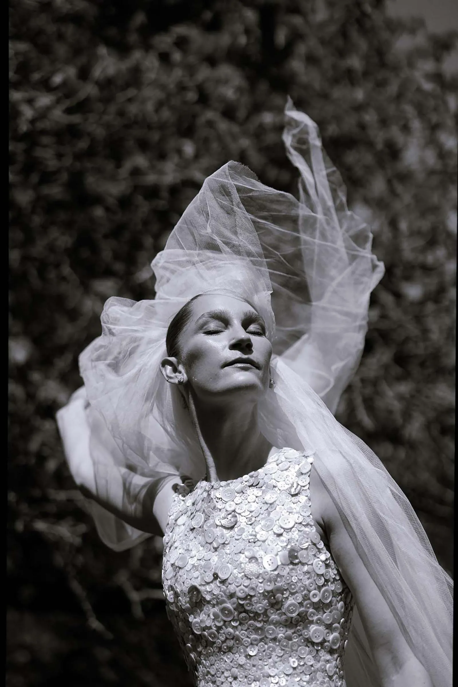 The fashion was just as intentional. “I originally wanted to have, like, 15 dresses, including a micro mini with a huge, billowing cape,” she says. “But my mum was like, ‘You just cannot wear that in a church.’” Judd consulted close friend Isabel Bonner – a stylist for whom she was bridesmaid in 2022 – and demi-couturier Ellie Misner to refine her editorial ambitions. Their moodboard included images of Pearly Kings and Queens (a tribute to Judd’s Mile End roots) with references to early Margiela, Gaultier and McQueen. The result? A shimmering mother-of-pearl bodice – hand-embroidered with hundreds of second-hand buttons from her late grandmother’s collection and parents’ clothes, alongside a pendant cross once worn by a friend’s mother – with an earthy raw wool skirt. “It carried all the spirits of people who were, and are, so precious to me.”