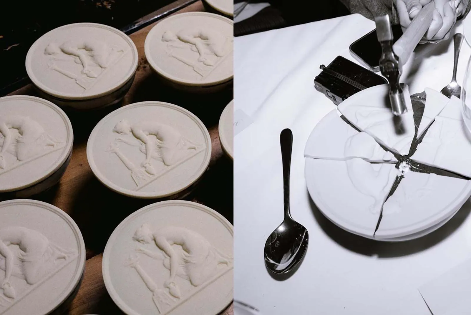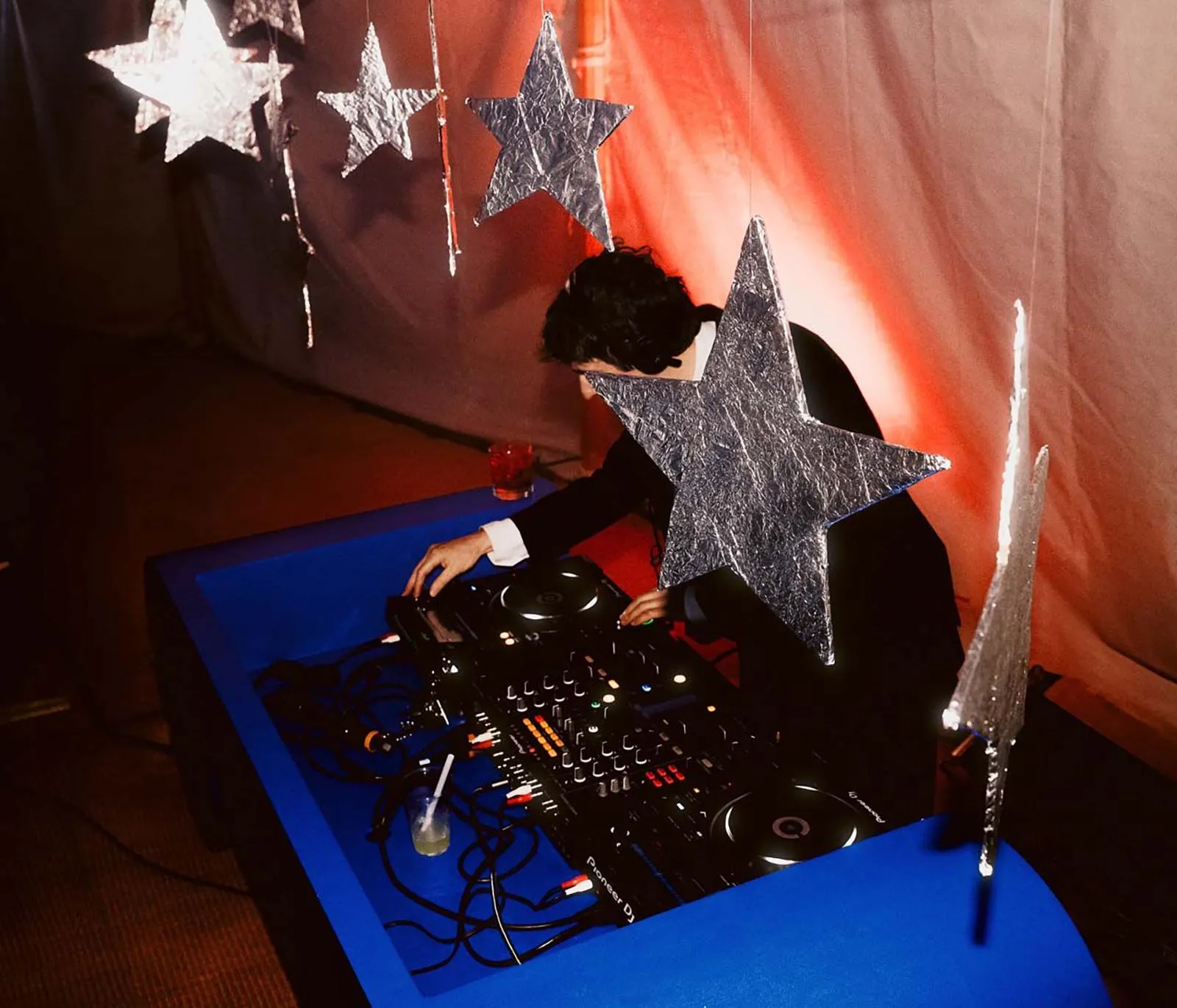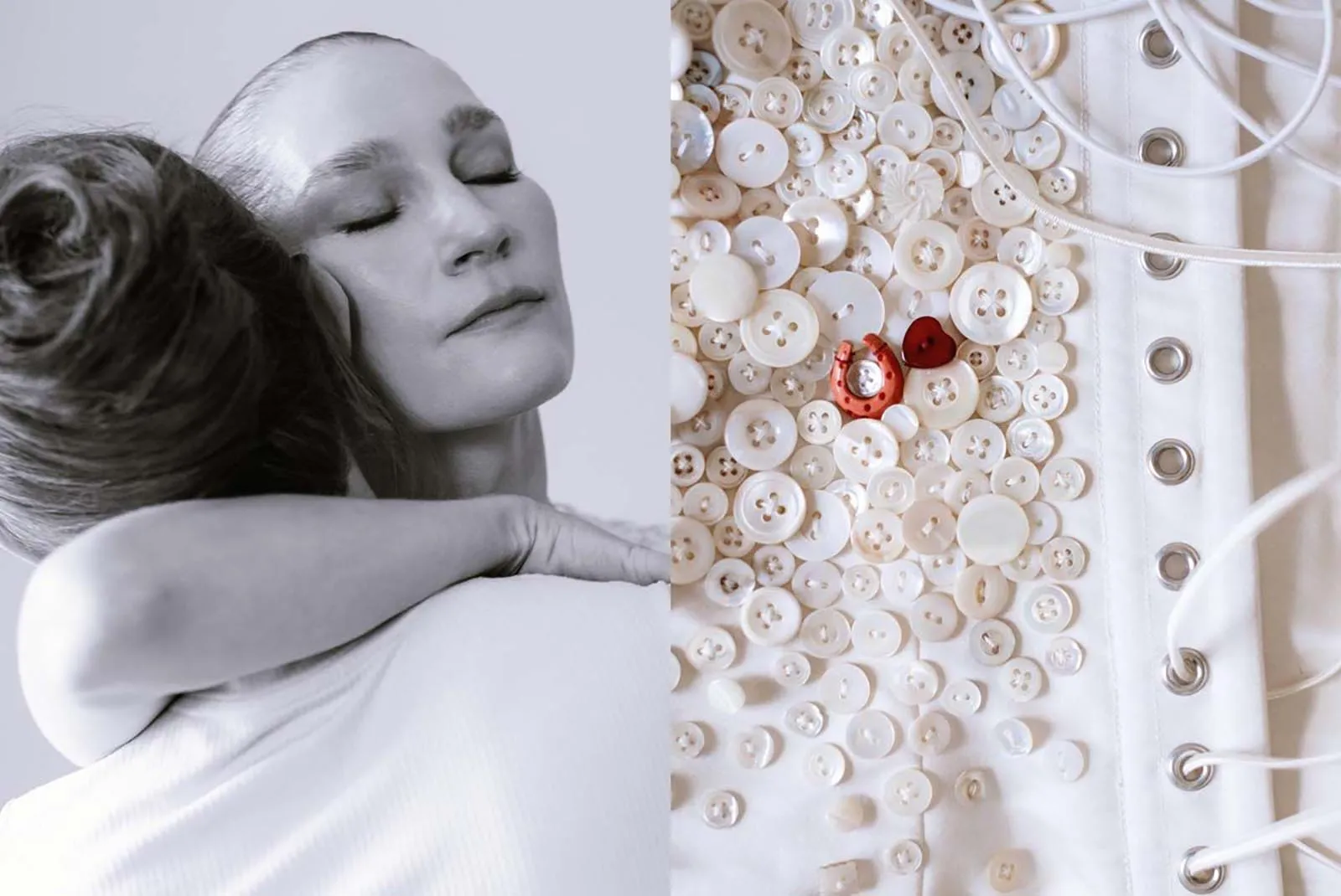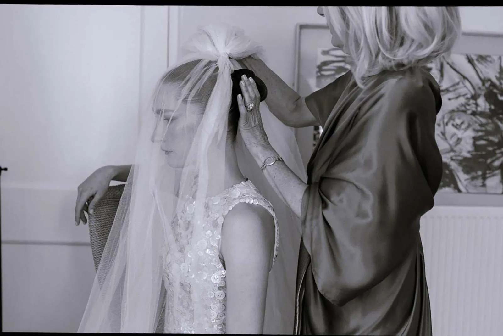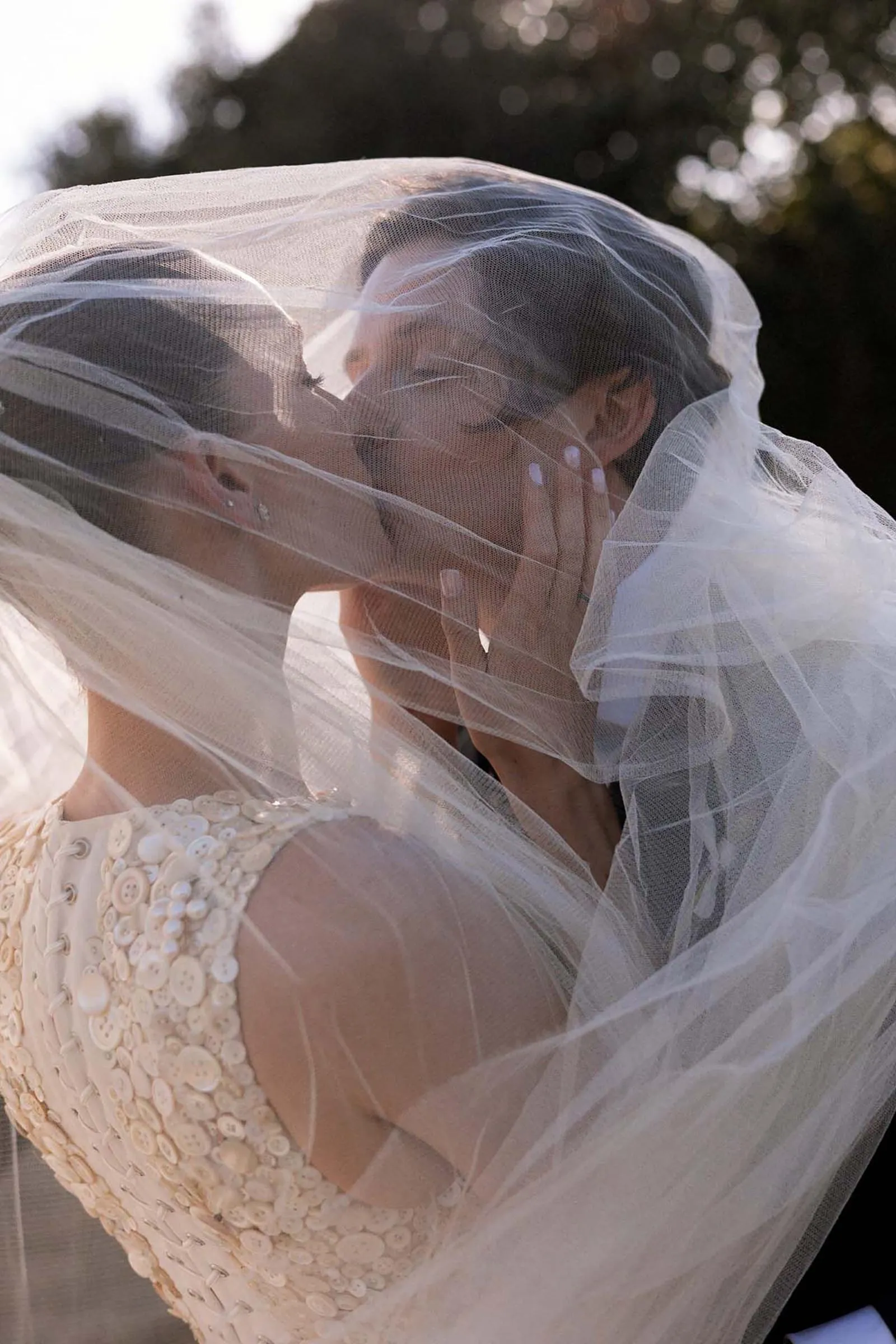 The fashion was just as intentional. “I originally wanted to have, like, 15 dresses, including a micro mini with a huge, billowing cape,” she says. “But my mum was like, ‘You just cannot wear that in a church.’” Judd consulted close friend Isabel Bonner – a stylist for whom she was bridesmaid in 2022 – and demi-couturier Ellie Misner to refine her editorial ambitions. Their moodboard included images of Pearly Kings and Queens (a tribute to Judd’s Mile End roots) with references to early Margiela, Gaultier and McQueen. The result? A shimmering mother-of-pearl bodice – hand-embroidered with hundreds of second-hand buttons from her late grandmother’s collection and parents’ clothes, alongside a pendant cross once worn by a friend’s mother – with an earthy raw wool skirt. “It carried all the spirits of people who were, and are, so precious to me.”