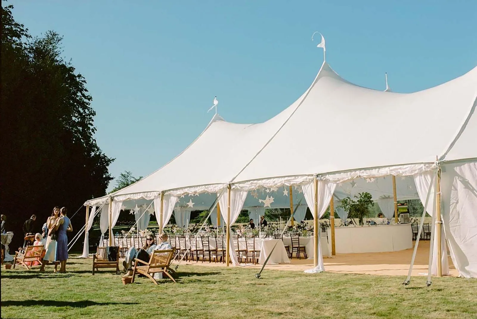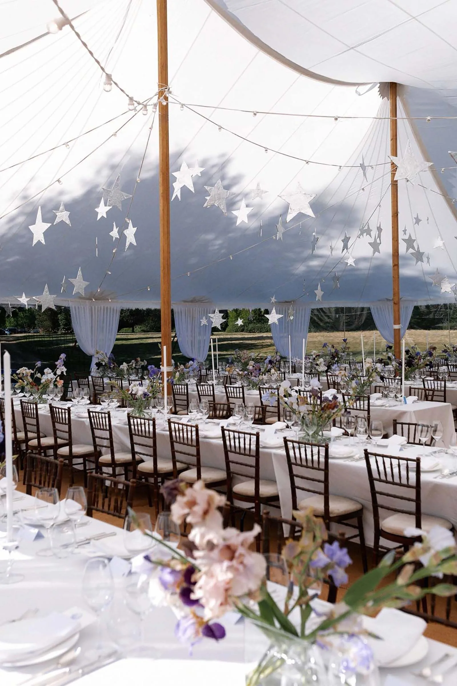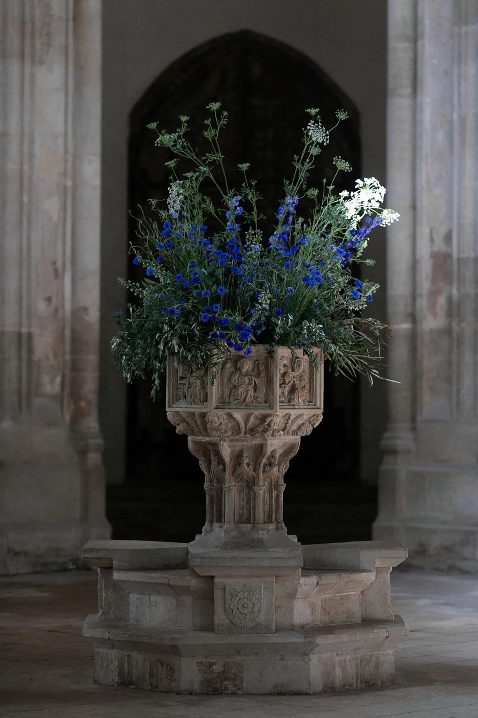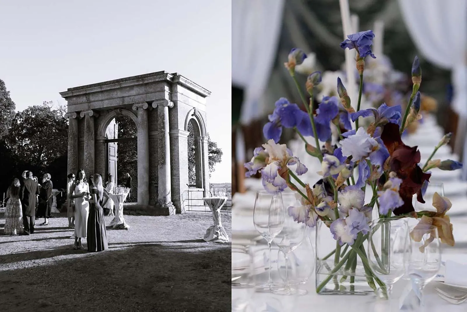 The mission, then, was to bring the spirit of Greece to Judd’s hometown in rural Suffolk. Big sprays of cornflower brought to life the brilliant blues of the Aegean Sea during the couple’s church service, while the ruins of Sir John Soane’s neighbouring Tendring Hall – the portico of which was modelled on the Parthenon – backdropped their reception, where bearded irises evoked the dusky purples and flaming oranges of an epic sunset. Elsewhere, a bespoke DJ booth rose in the shape of an Ionic column, while Minoan squid motifs – a nod to the long-limbed couple’s nickname, “the squids” – appeared on invitations, the order of service and even a flag flown above the church. Instead of a traditional wedding cake, guests were served tiramisu topped with chocolate plaques resembling marble friezes.