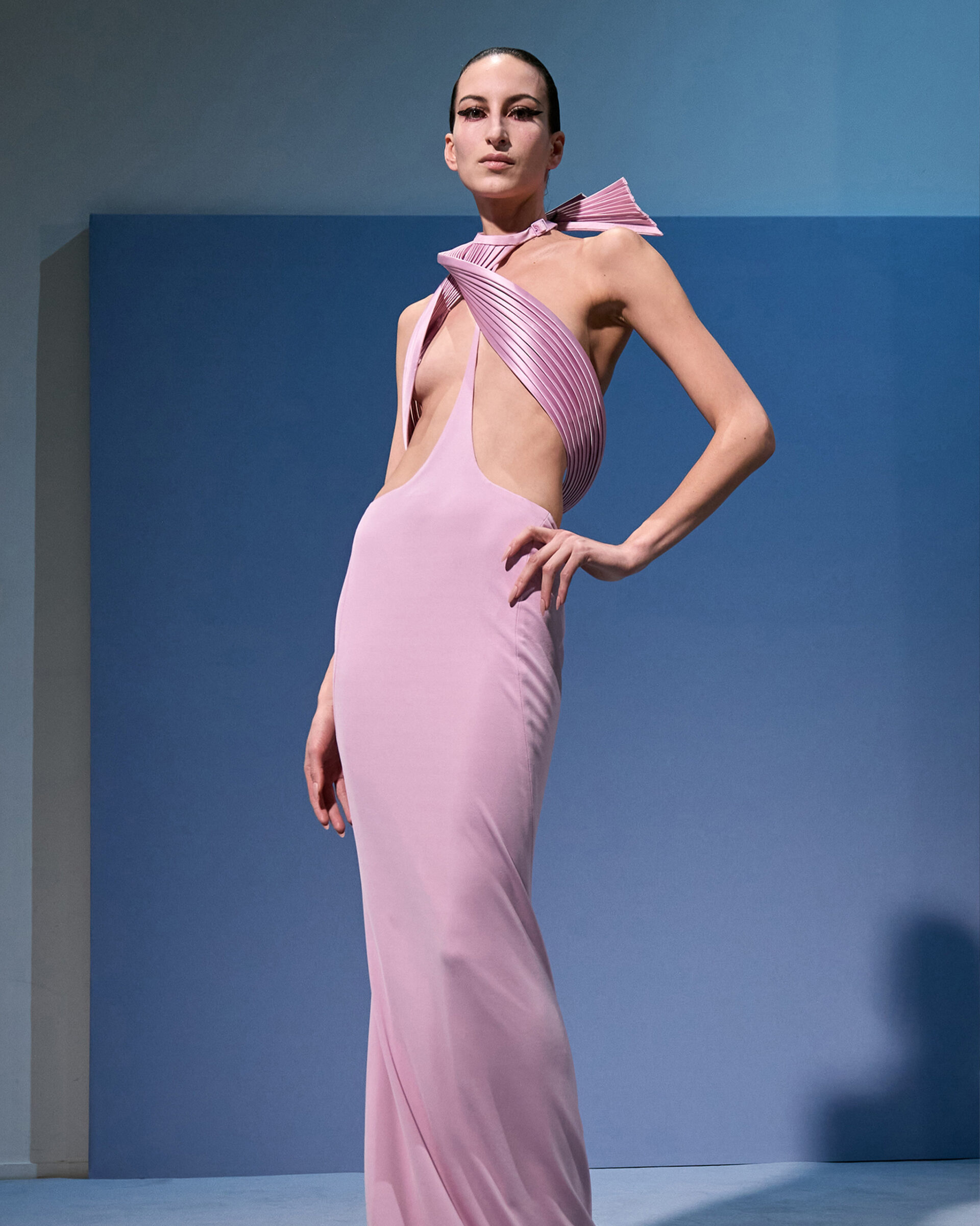The convergence he found began with Gaultier’s tailoring. “To go back to the essence of his work, which was perfect. People forget how immaculate his tailoring was. His work was magical. So I tried to go back to the pure lines, to find a calmness and moment of grace. Because I believe his work was magical.”