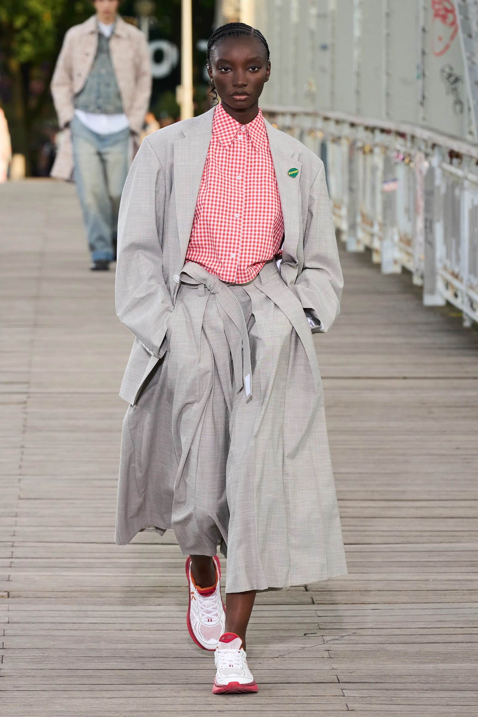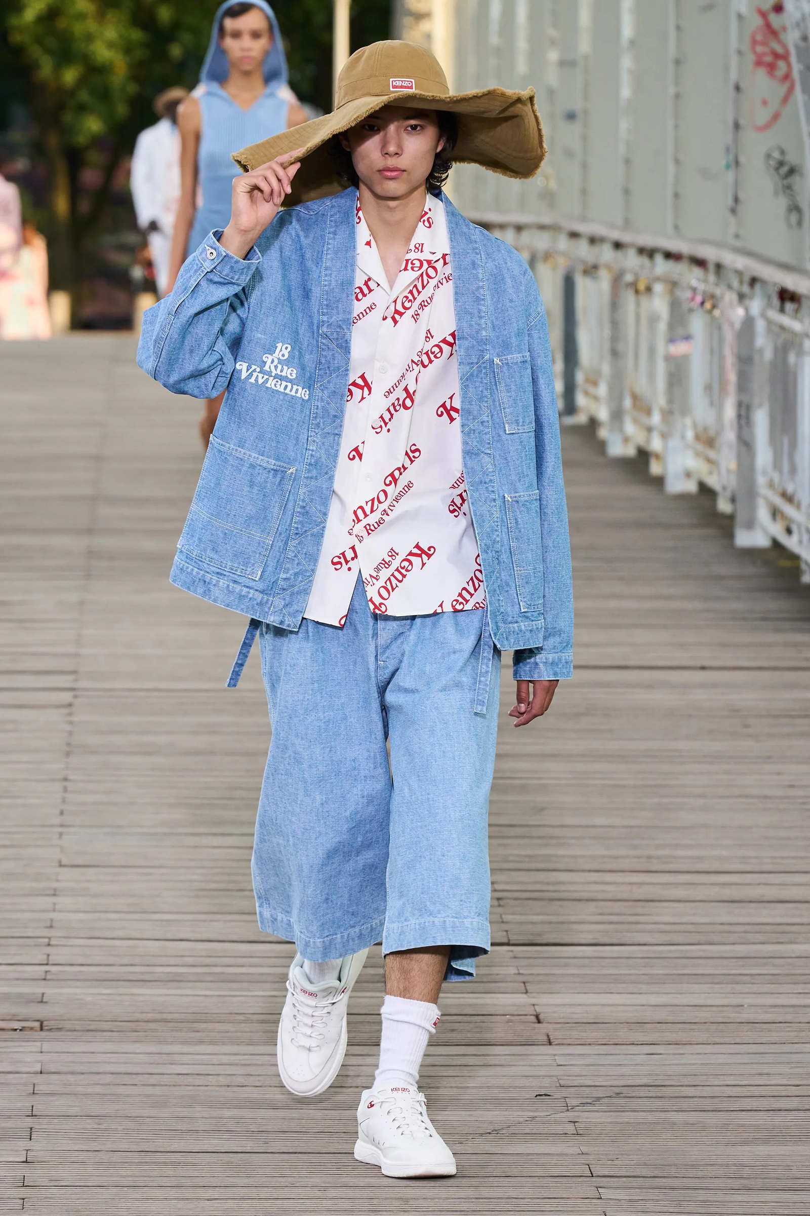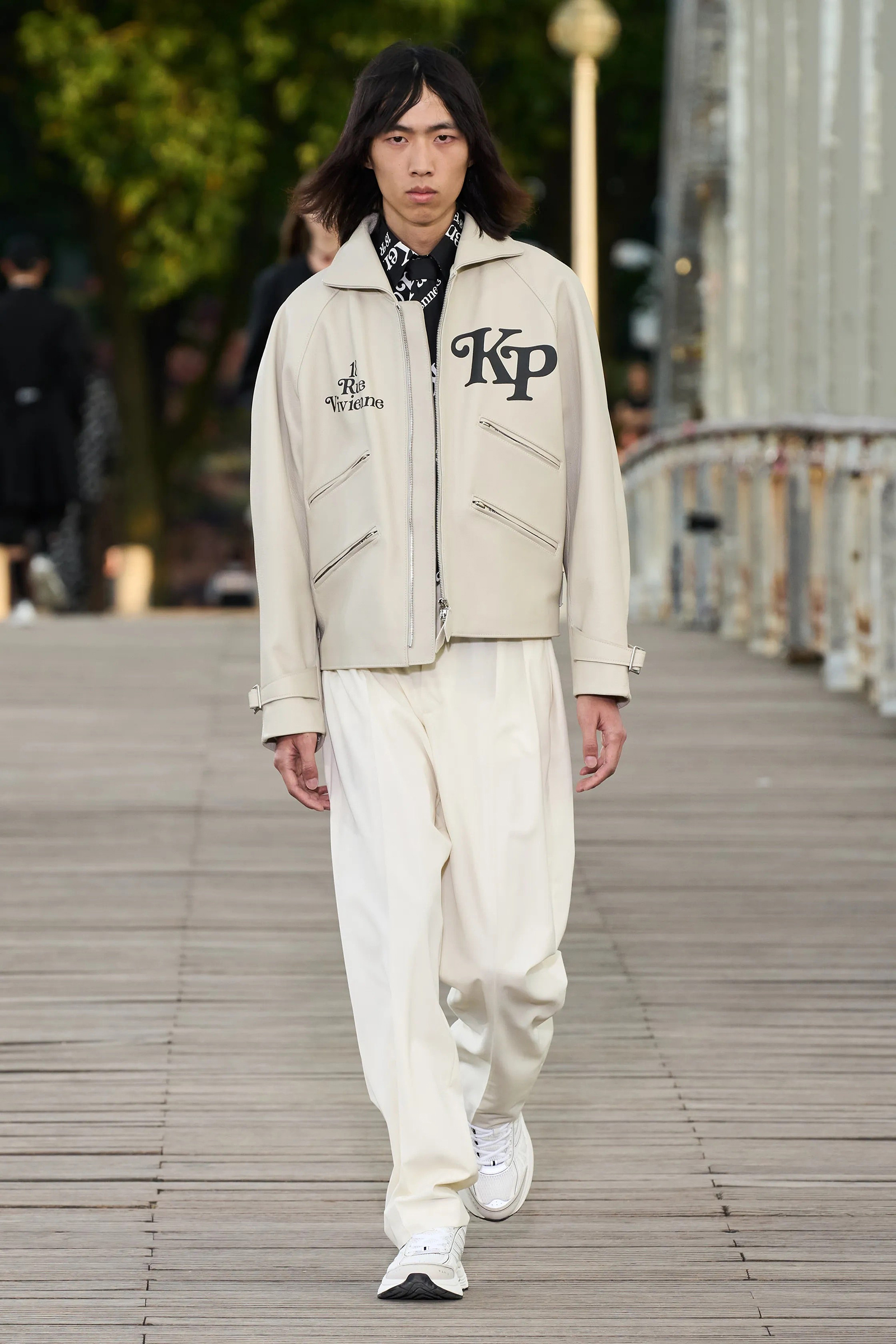 Nigo and Williams’s choices of locations obviously weren’t a coincidence. Both designers were born out of the hip-hop community and cut their teeth in places far from the fashion establishment of Paris. Through the years, they served as each other’s mentors and apprentices on many levels. Their practices are testament to how much they learned from one another. Where Williams’s bridge analogized a connection between Paris and his home state of Virginia, Nigo’s bridge linked Japan to Paris, quite literally: the Passerelle Debilly connects Palais de Tokyo with the Eiffel Tower across the Seine.