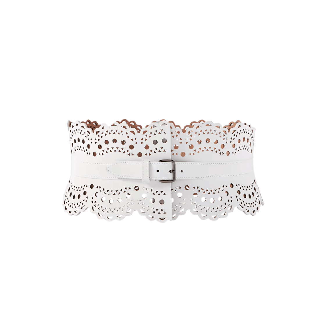 Sharpen the monochromatic corporate uniform with pointed oxford pumps, a statement belt, and cool-toned earrings to strike a fluid balance.