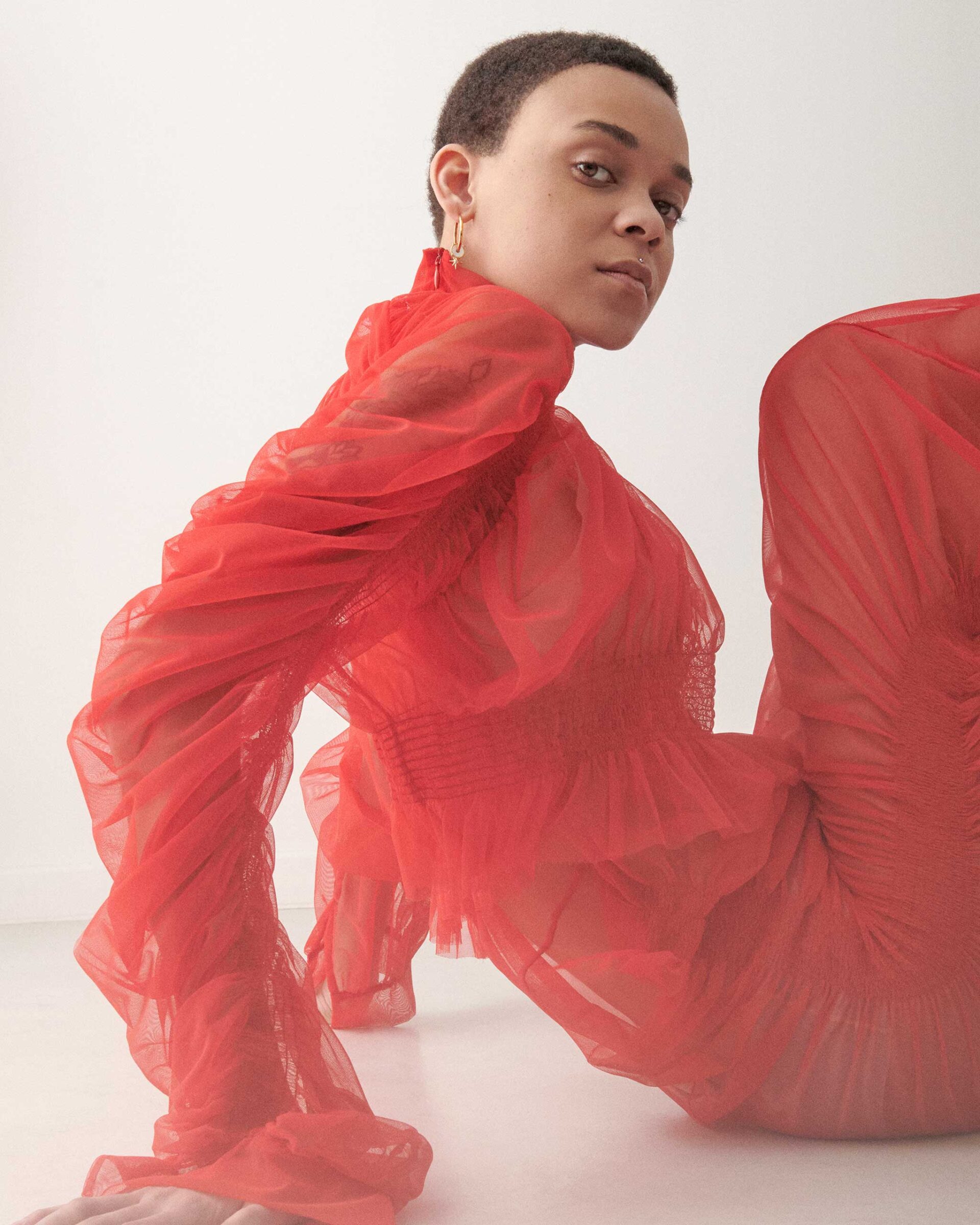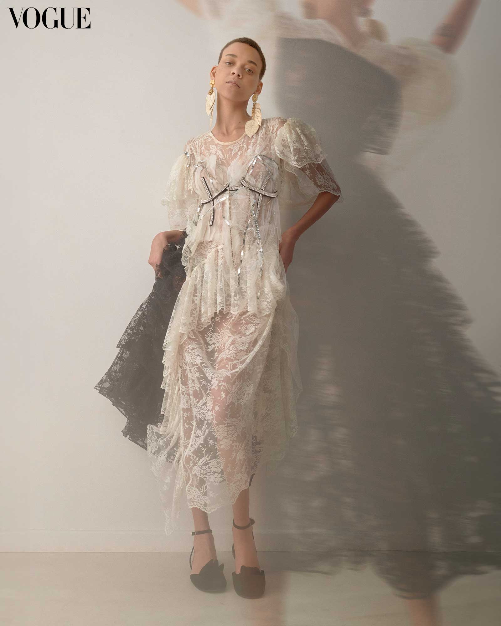 PREEN BY THORNTON BREGAZZI sheer dress, HEYRLOME earrings and necklace. Photo by Paul Farnham
