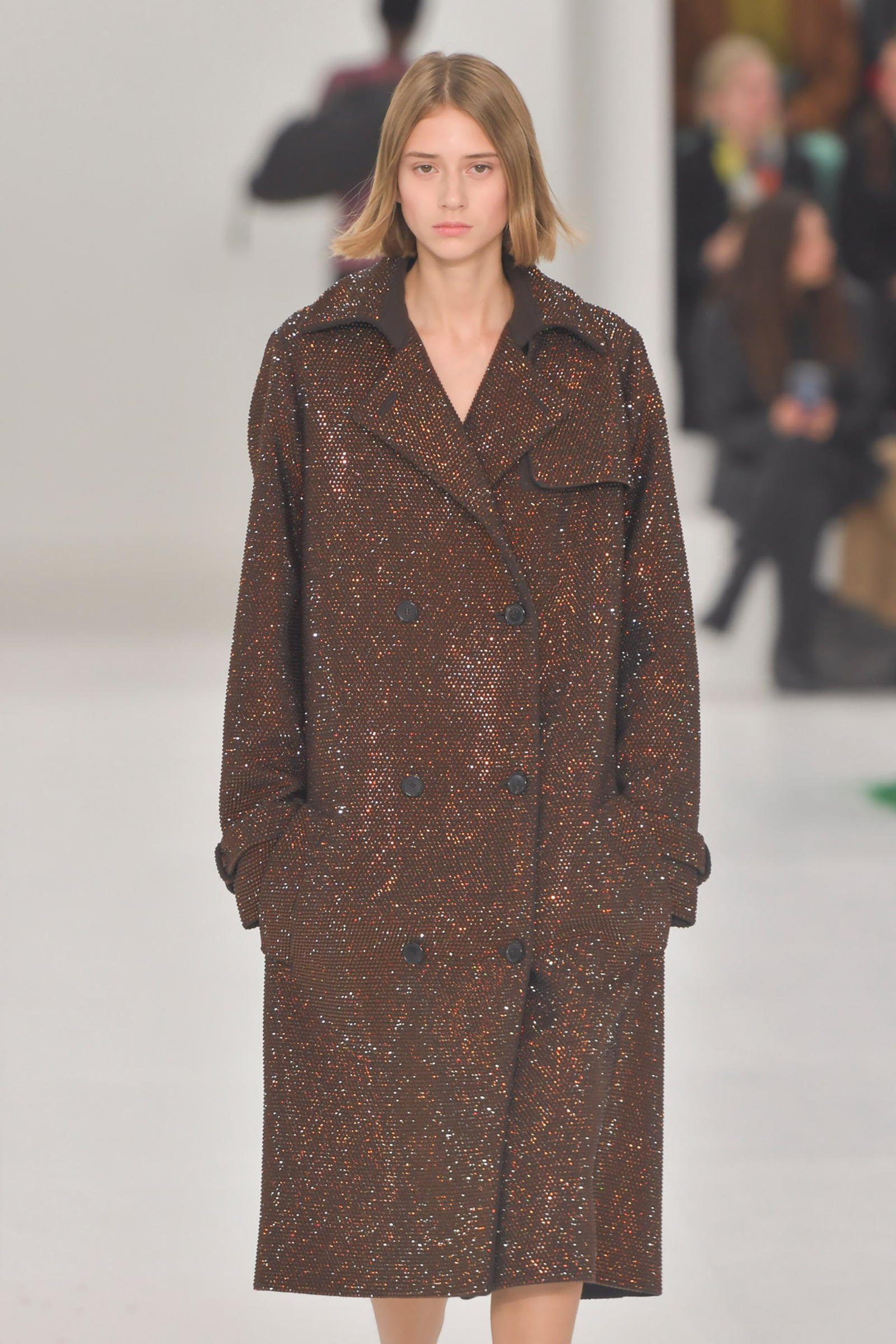 Anderson’s purist approach was typically abstract, but it also came with some simple proposals that were attractive in a more grounded way: handsome drop-shouldered leather coats, and an eroded oversized caban and brown crystal-encrusted coat that captured the purified elegance that’s been dominating the season. “There were moments in the show where I wanted this idea that she kind of breaks into a sensuality of the wardrobe, and moments where it becomes more withdrawn,” he said. He expressed the latter mood in a series of garments that evoked gestures like a child wrapping themselves in a blanket, or the draping of fabric over a nail on a door—transient things fixed in time. In fashion, as in life, nothing is as it seems.