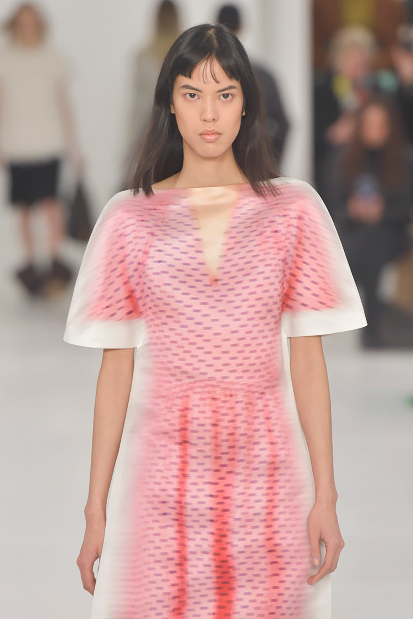 Anderson’s study of the ways we experience and consume fashion unfolded in several ways. Dresses inspired by the work of Gerhard Richter featured blurry motifs that, when seen from afar, would suggest a clarity to be found when viewed up close. But it was an illusion. “It’s the idea of a dress becoming out of focus. Fashion can become a bit of blur sometimes,” he said. Other dresses were printed with scans of antique garments that would have looked like an optical illusion from afar. Jumpers and trousers entirely made of feathers touched on the same idea. “My whole thing is the idea of looking at realities. In the room it looks like one thing, but we have an audience online that sees it in a different way,” Anderson explained.