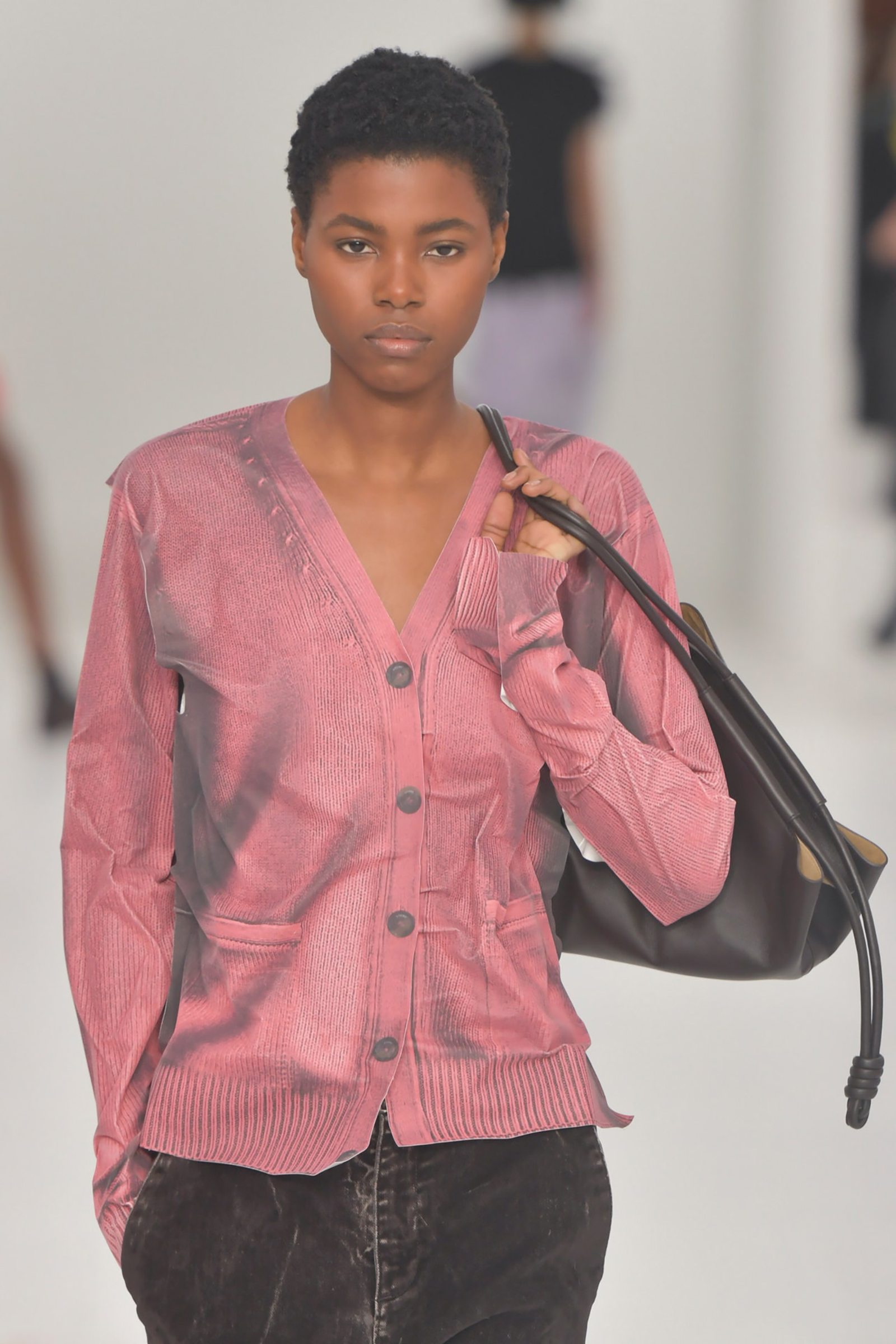 “Now that we consume imagery so quickly—and we’re kind of over shows before they’re even in store – my biggest obsession is how to make collections that are not for right now, but for in six months,” Anderson said. “I like the idea that the cardigan online will look like the cardigan, but in store, you will buy it as a sticker.” He realized that idea in cardigans that had been printed out on adhesive paper and stuck to the models’ bodies. “At Loewe, we always want to experiment with different things, but this one was a bit more purist. Reduction: simplifying the silhouette but at the same time still pushing the boundaries in terms of what can be done with clothing,” he said.