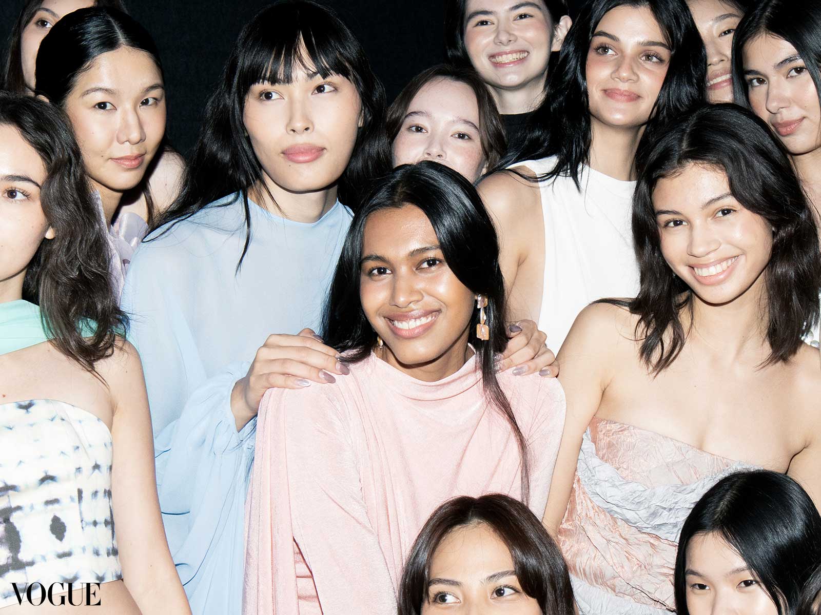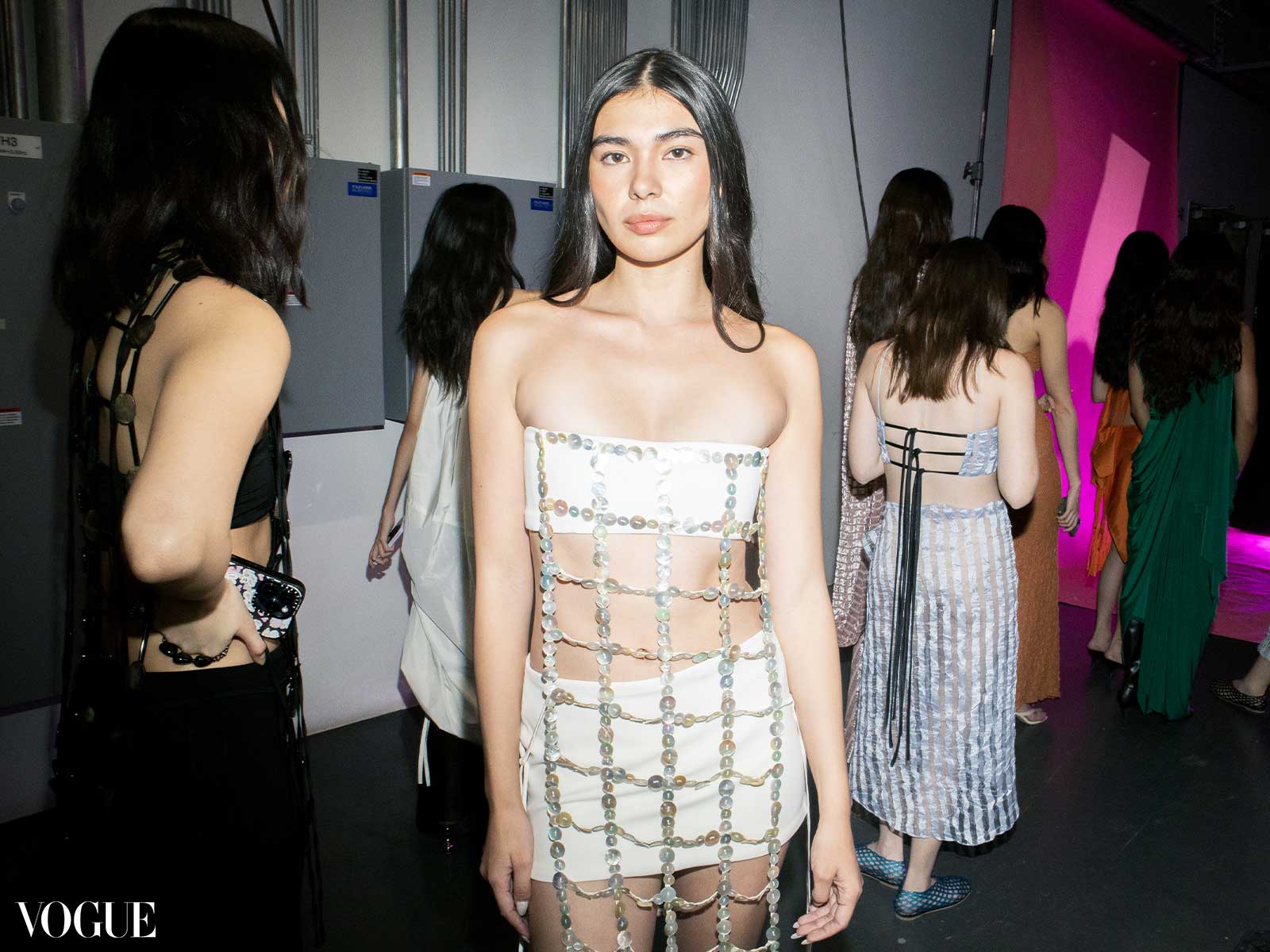 When the lights finally lifted, crwn’s arrangement of steady beats and soft percussion carried you into a dream. Martin’s sequence unspooled in a melange of texture, color, and visual interest, often plush or pointed or light-as-air, with trails of chiffon waving in the wind. There were pieces that had fabric gathered at the waist, pinned up with organically shaped metal pieces custom-made by jewelry label Pranca or Philippine mother-of-pearl buckles by Neil Felipp.