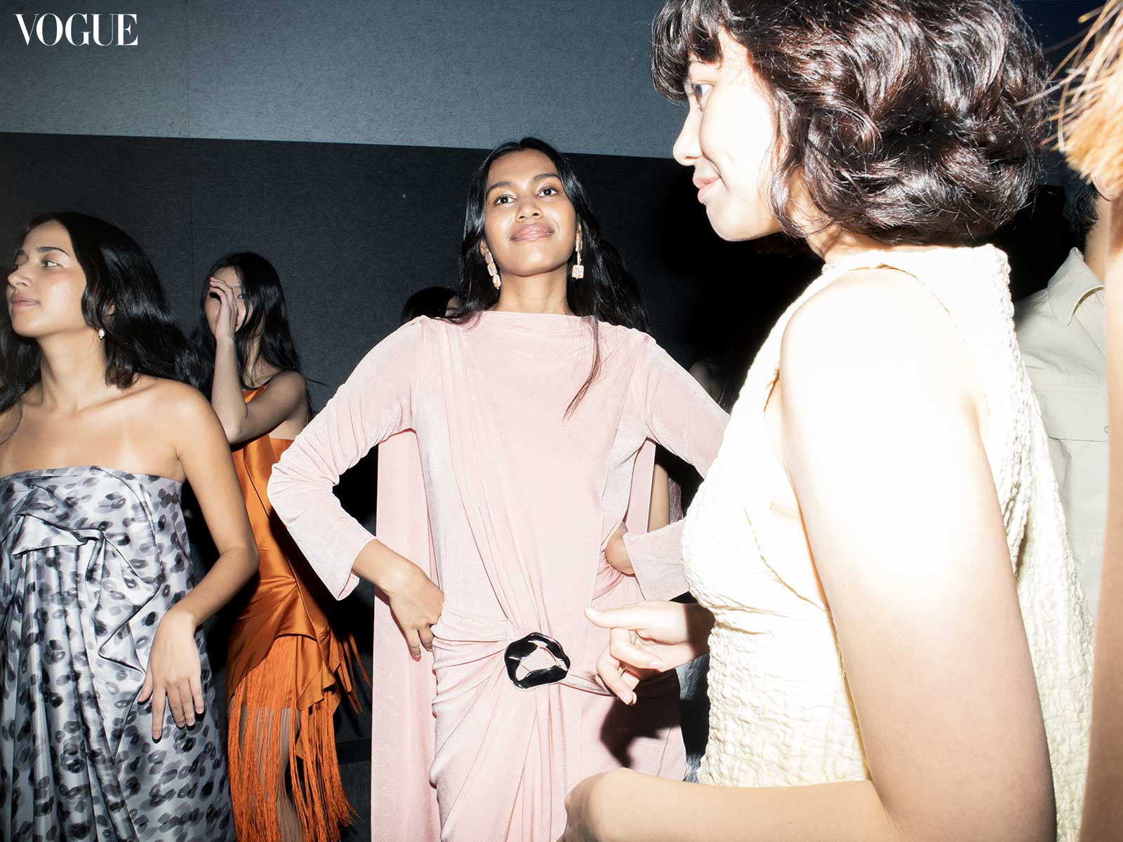 That through-line resulted in elements that felt didn’t belong together but somehow worked together. There was the play on color and texture, and then there was the wide vocabulary of shape and proportion: airy caftans were followed by boxy minis or straight-cut separates, with long black ribbon affixed at the shoulder or skeins of fringe falling from asymmetrical hemlines. “I think for the first time, also, I’m able to read the fabric differently from how I was doing it before. There’s a lot of maturity in this collection,” he says decisively. “There’s a lot of maturity, even in the way I’m able to imagine.”