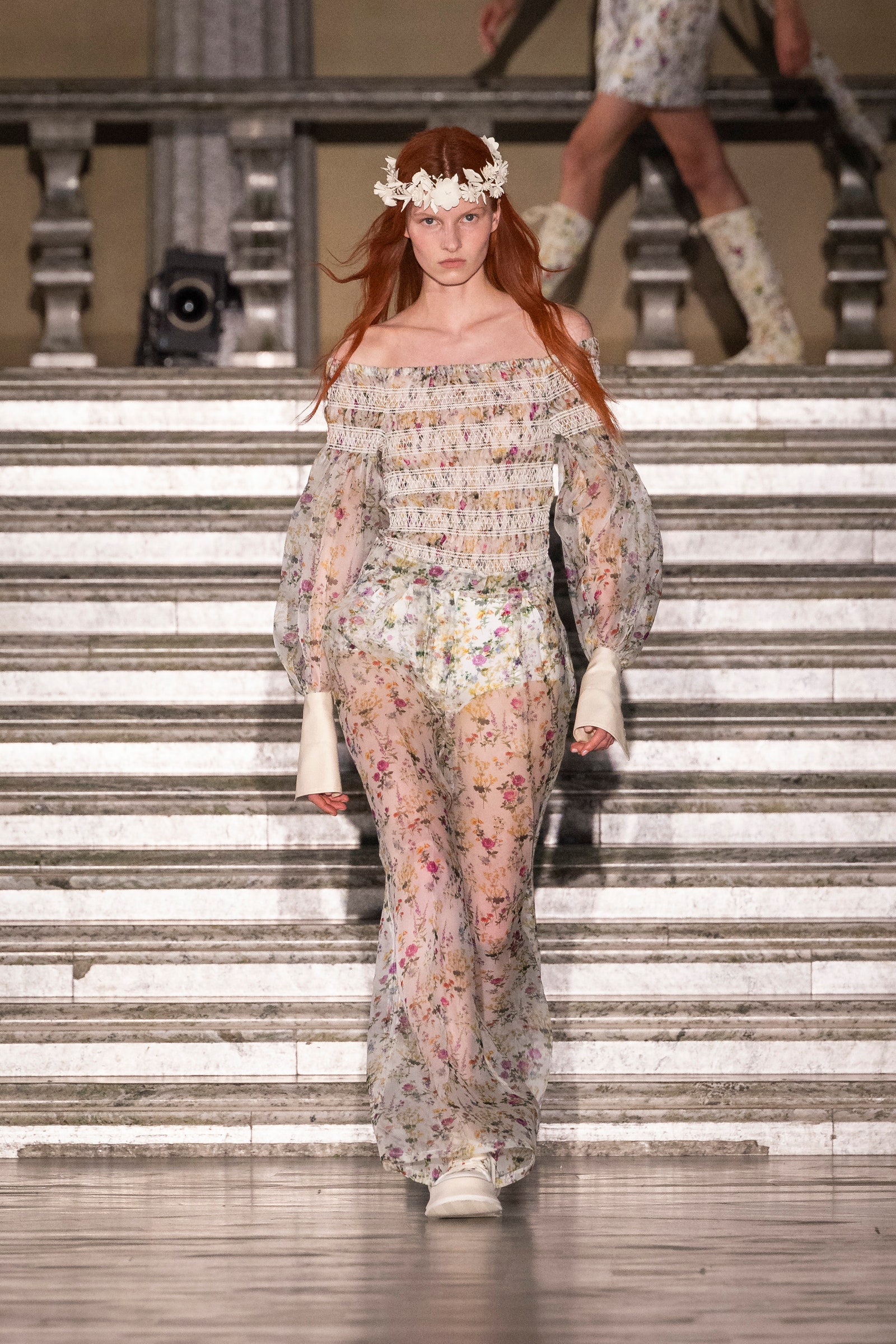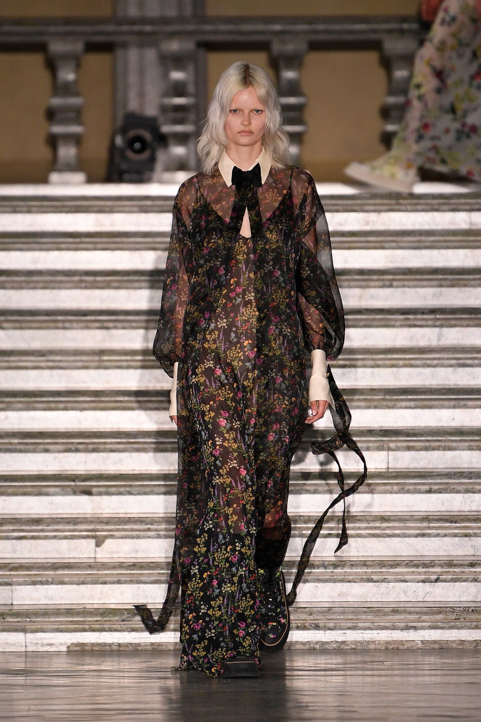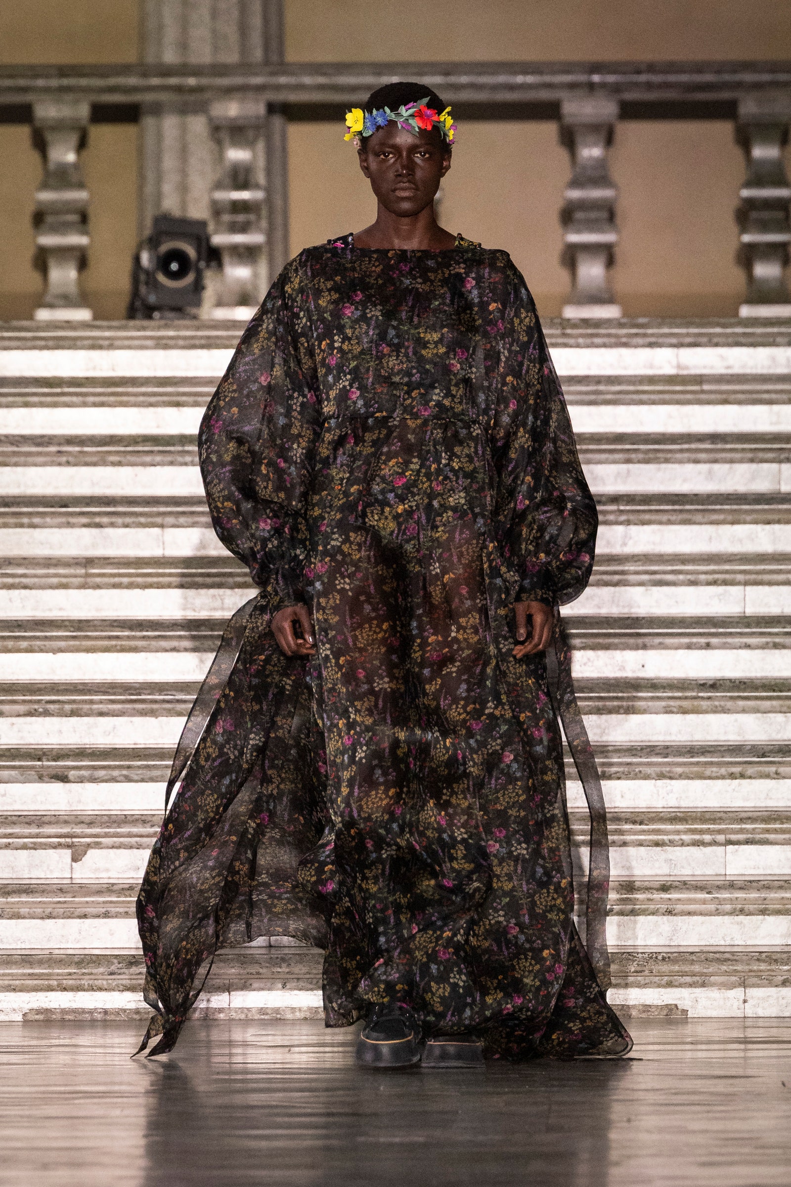 The collection’s floral elements – a meadow’s worth of wildflowers flutter across billowing dresses and capes – are an ode to the Swedish folk festival that celebrates the gift of the summer. And yes, Griffiths has seen the Florence Pugh film. “I put aside all the sinister, gory bits, but I loved the flowers,” he said. “[That said], there is something a little bit gothic about the collection,” the designer noted, pointing to the inherent darkness of Scandinavian folk tales in which children “get baked in pies, or have their feet cut off, or are shrunk down to the size of a thumb”. The models’ floral coronets – made from paper rather than real foliage (“I think something that goes on the runway has to be a made object”) – were ivory and black, in contrast to Midsommar’s traditional explosion of colour. “They instantly become much more powerful, and less pretty,” Griffiths said. “There is something just a bit moody about the collection, and a tiny allusion to punk, which I think is always a good thing.”