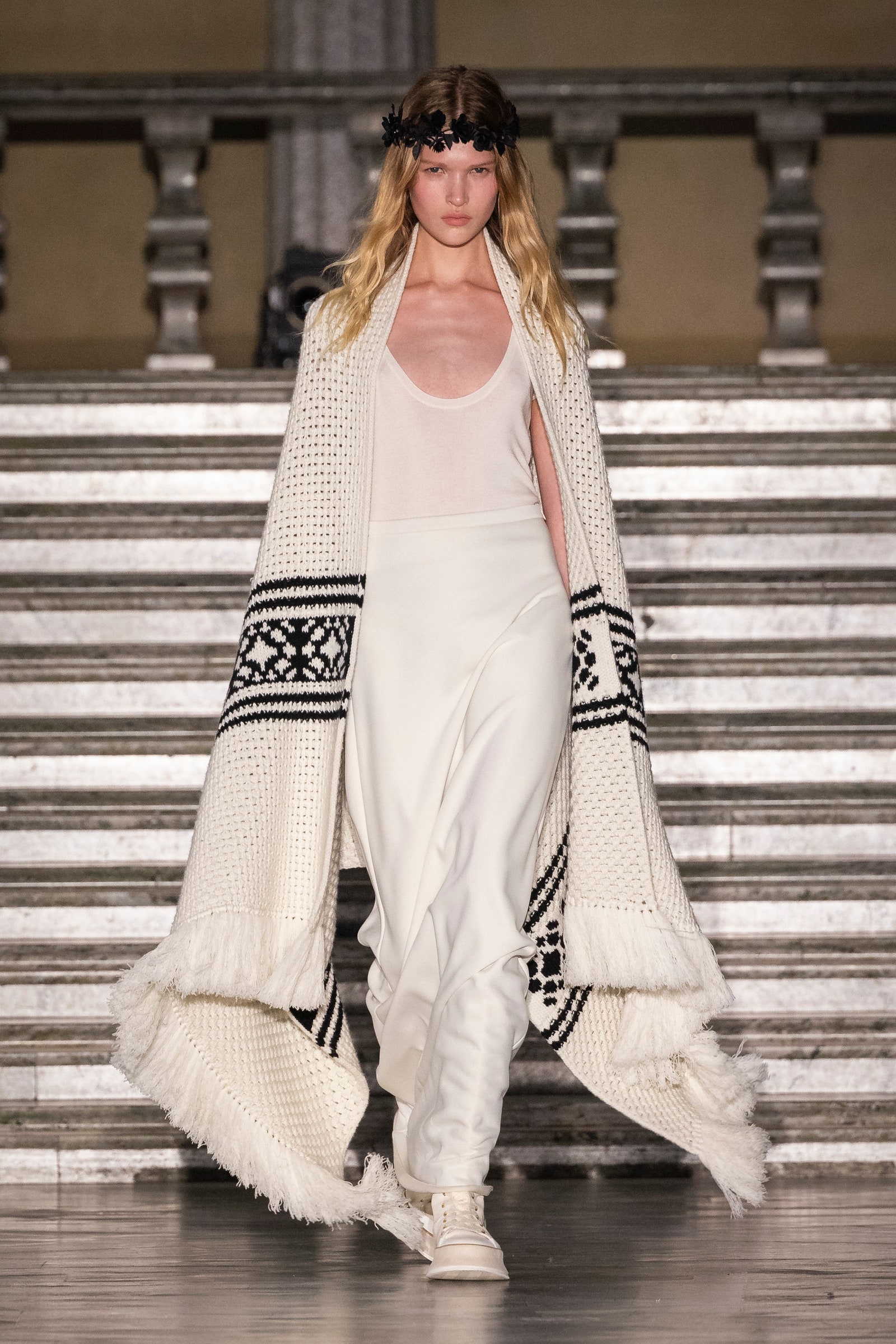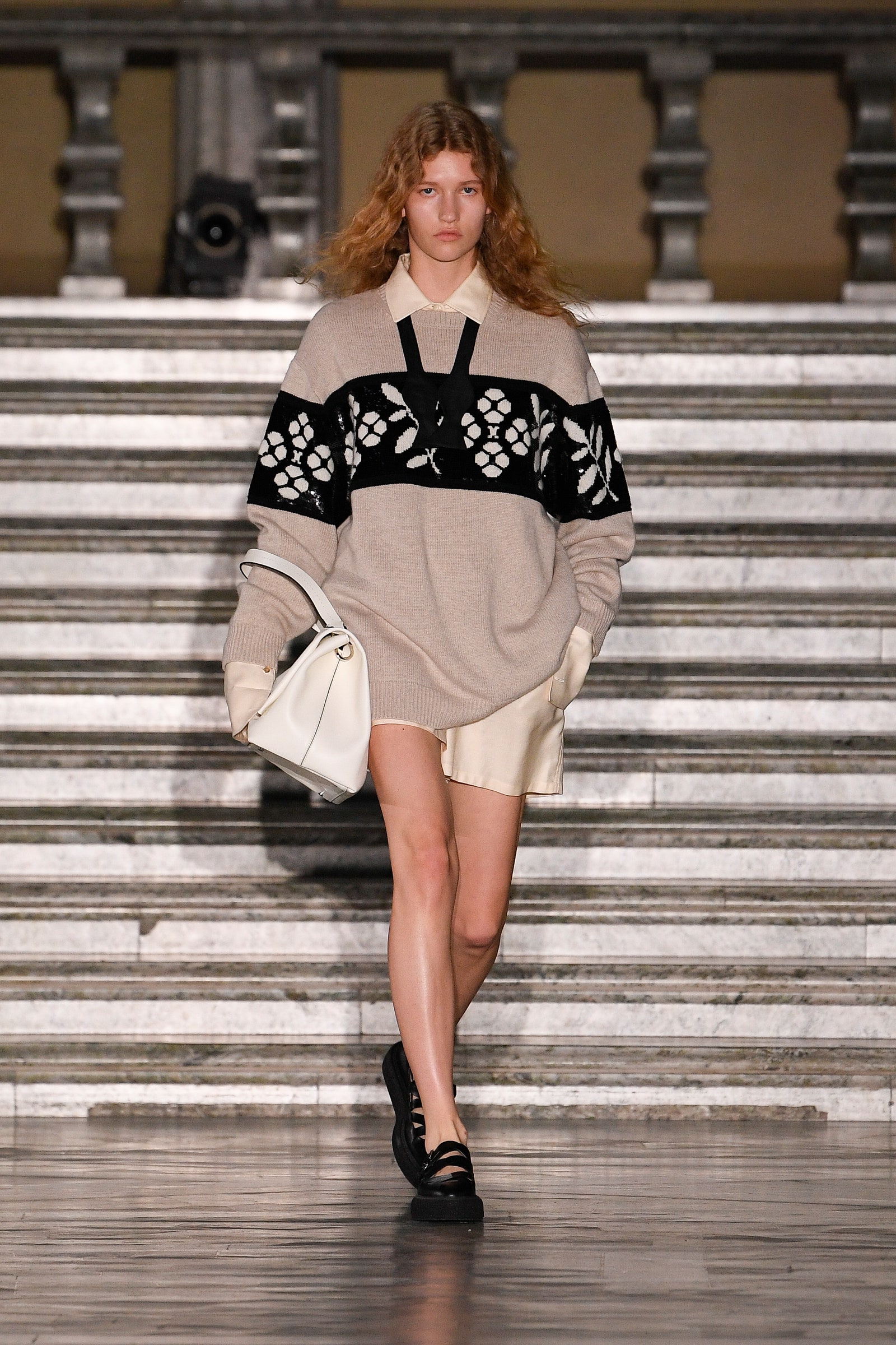 Griffiths brought the fashion set to Kungsholmen Island, home to Stockholm City Hall, which had its official opening on Midsummer Eve, 1923. Its Blue Hall has been the setting for the Nobel banquet – held annually after the Nobel Prize ceremony – every year since 1930. The designer had immersed himself in museums, galleries, restaurants and shops in Stockholm and beyond while creating his Scandinavian-themed collection. “The folk museum in Oslo [Norsk Folkemuseum] is amazing – I spent ages there, and I spent a lot of time at [beloved Swedish interiors destination] Svenskt Tenn. It’s one of the perks of my job,” Griffiths said. “I can wake up one morning and think, we should do a show in Scandinavia. And then a year later here we all are in Scandinavia – including Demi Moore and her Chihuahua!”