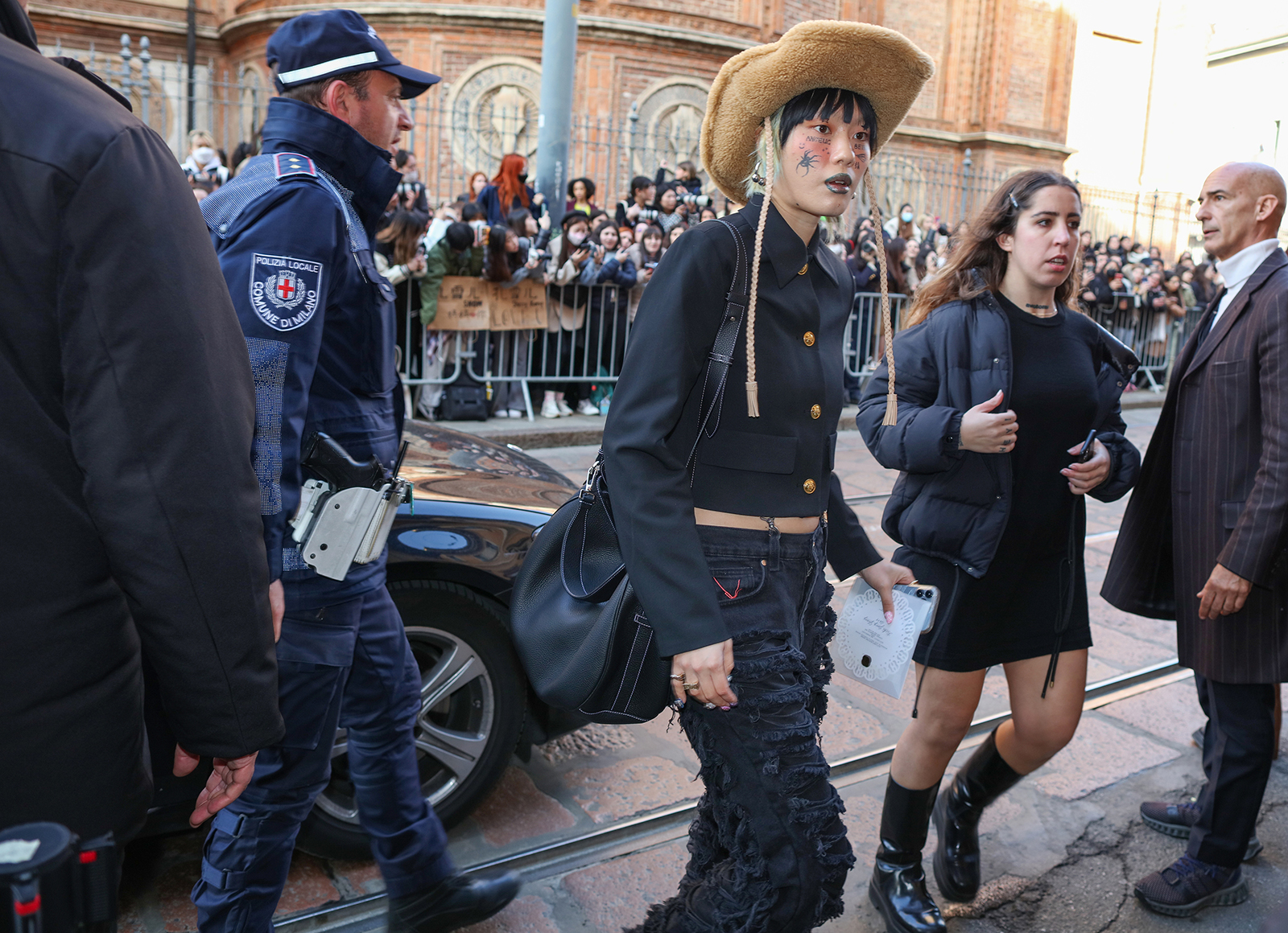 After departing from London’s punk celebration in honor of the late Vivienne Westwood, the Italian fashion houses kept in tune with the tone of counterculture nostalgia. Moschino’s models were styled with aristo-punk, grunge headwear, while Gucci and Etro’s collections recalled back to ’80s glam rock New Romantics, and early Y2K proportions.