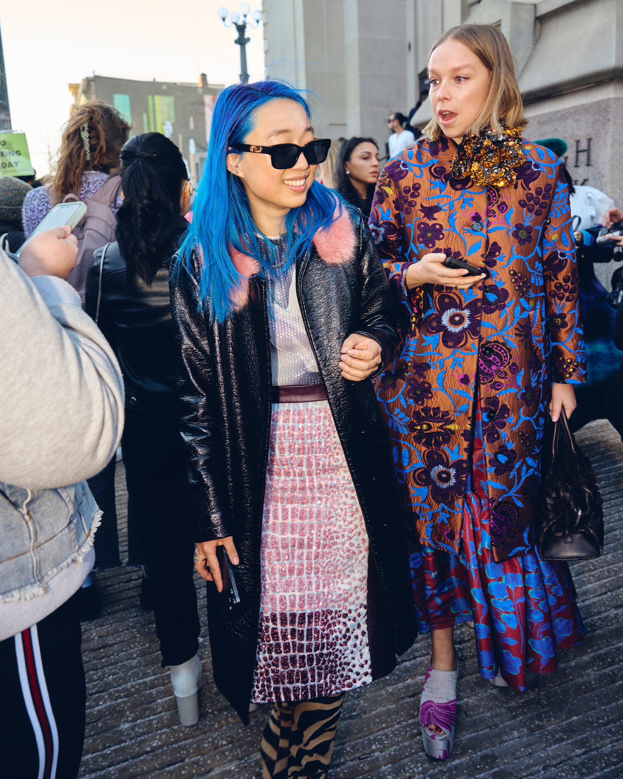 Outside the runway, however, the New York fashion week goers decided to bring maximalism and color to the final days of winter. Fashion photographer Selwyn Tungol captures each attendee at their best. Bright pastels, brocades, furs, and knits were all over the streets outside the designer’s shows. Vogue China editor-in-chief Margaret Zhang stepped out in her now signature blue hair and a glossy black coat trimmed with a pink collar, which she wore over layered sparkling animal prints.