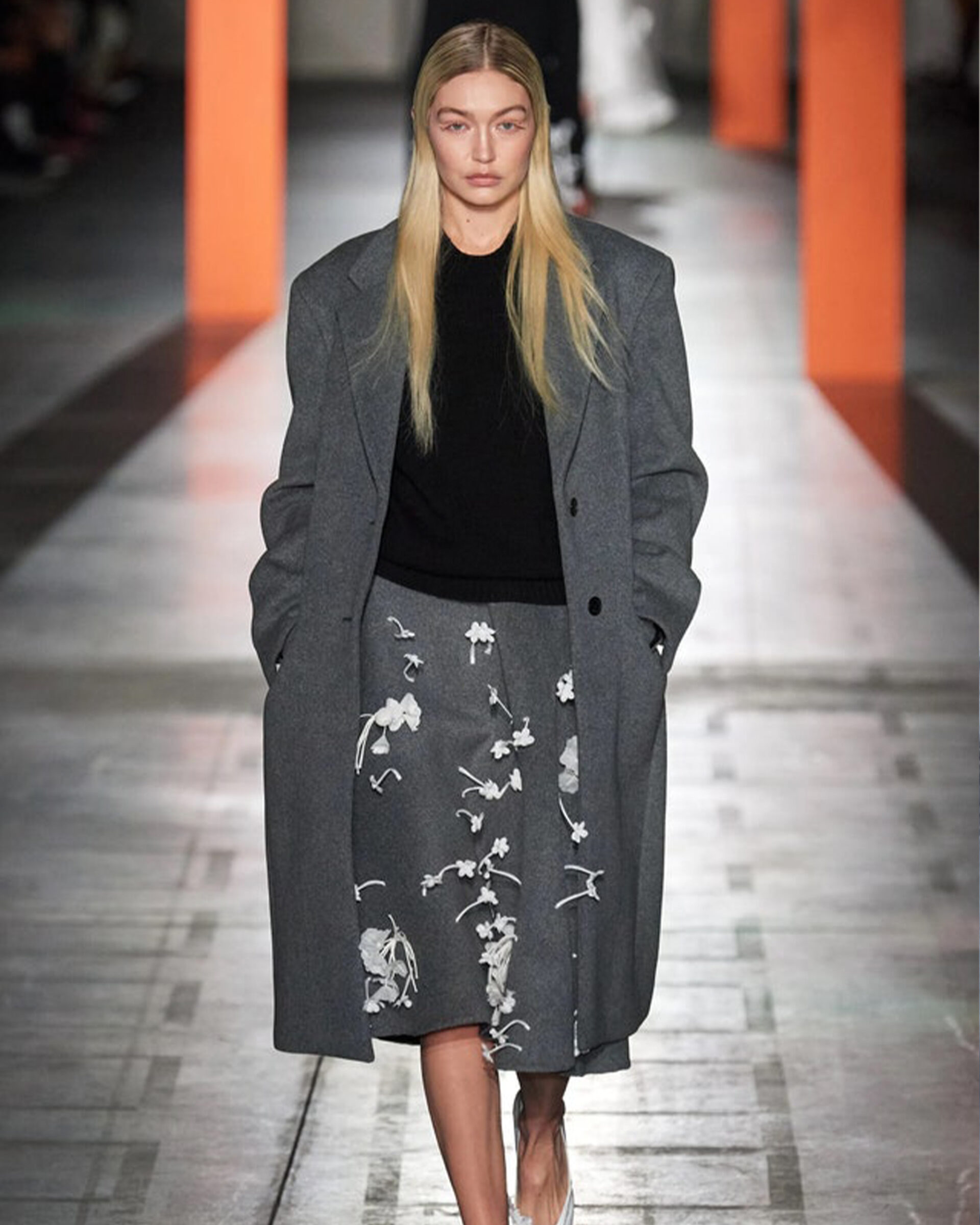 The designers’ elevation of everyday garments inspired a study of “the stereotypes of outerwear”, as Simons called them: how to make extraordinary the pieces that feel most desirable to us as customers. It generated expressions like a white skirt and top padded to new proportions. “It was interesting to see how they could architecturally evolve,” Simons said. “Because we’re so into reality, and because we’ve seen so many variations on these pieces over the years, we wanted to make the effort to see if we could push it into something new.” It manifested in elongated outerwear silhouettes that played with proportion, supersizing the upper parts of garments and minimizing the lower.