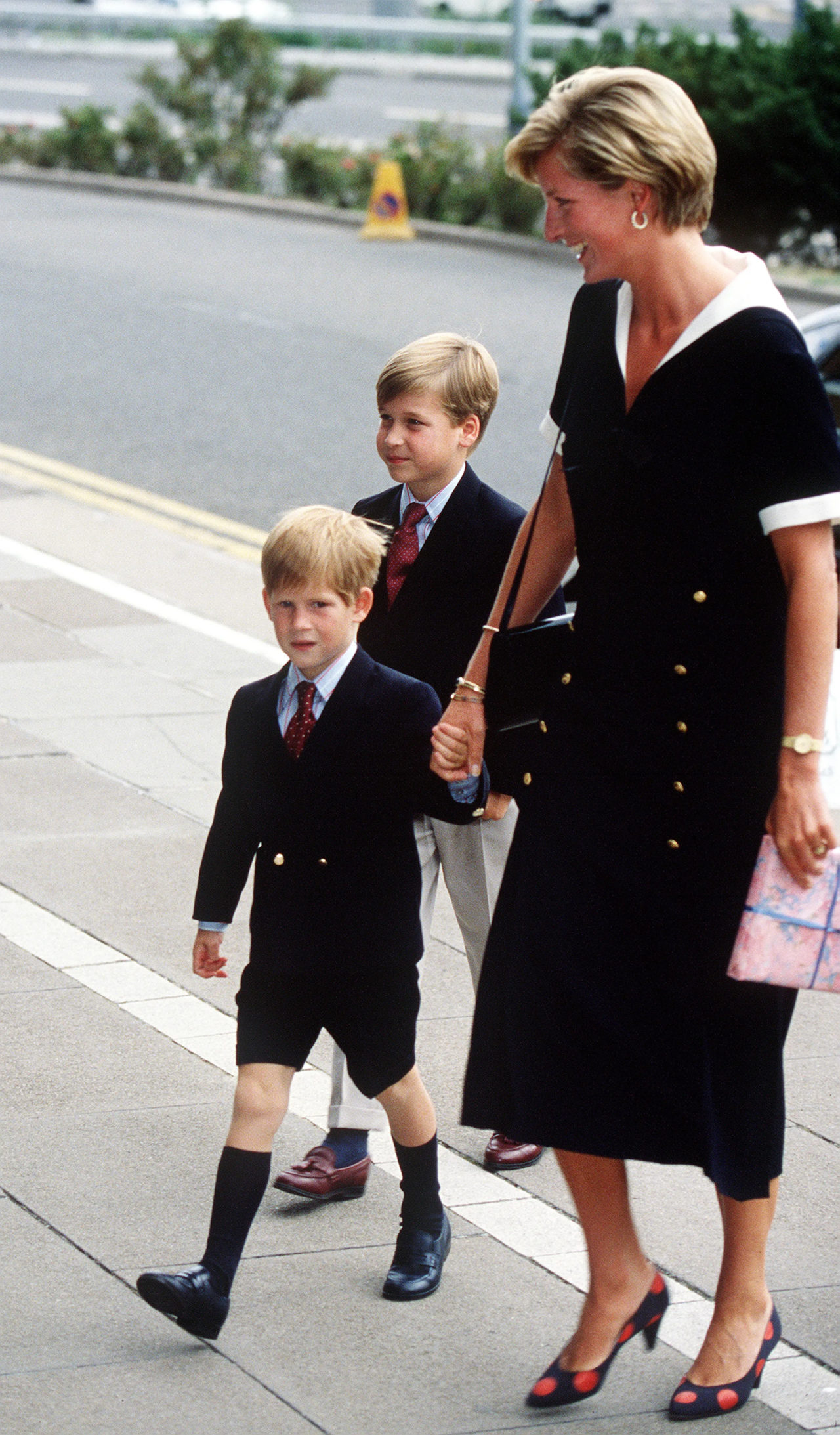 The then Princess of Wales arriving at the Nottingham Medical Centre in a black Chanel dress, accompanied by Prince William and Prince Harry.