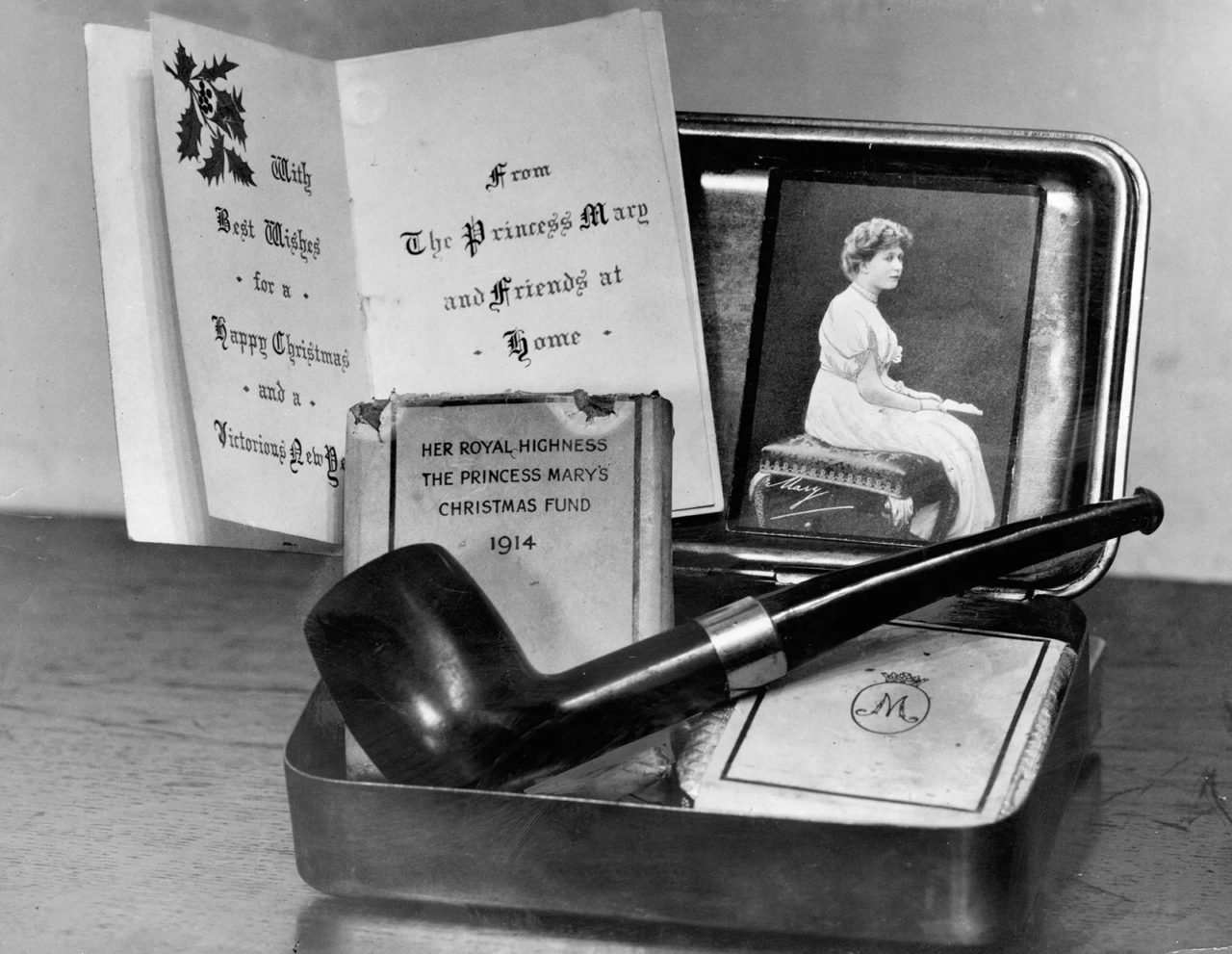 Princess Mary’s Christmas card in 1914, part of a Christmas gift tin for soldiers.