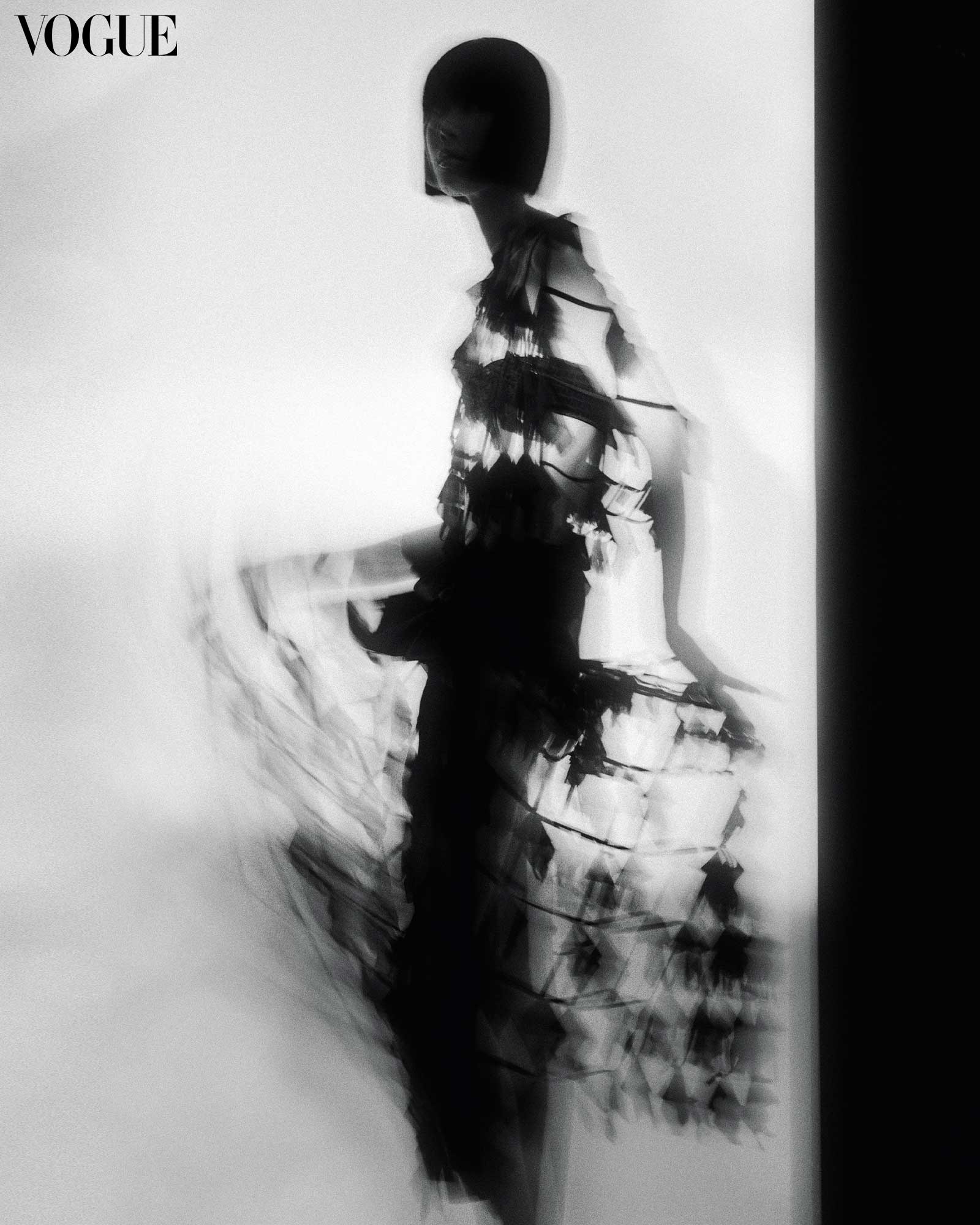 In a balancing act, light illuminates by casting shadows. Sheer and printed fabrics are layered and draped, clinging to the female form in and out of focus.