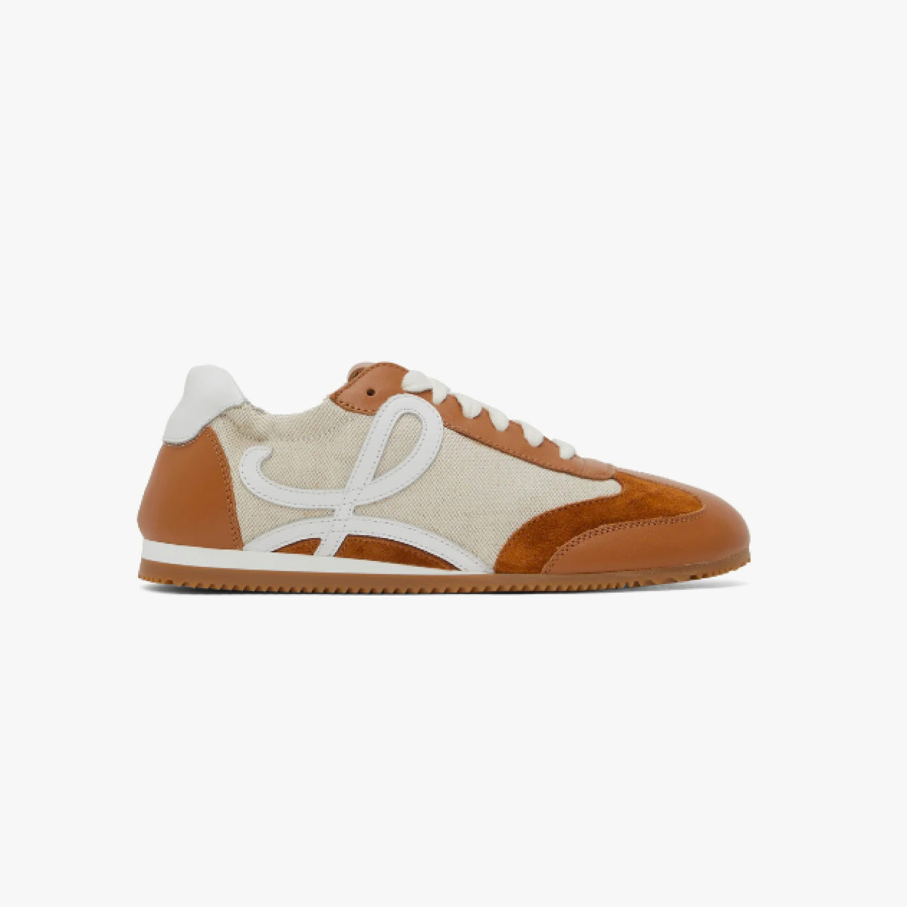 Try ditching the usual black or white for a pair of neutral tan shoes like these soft sneakers from Spanish brand Loewe. Available here.
