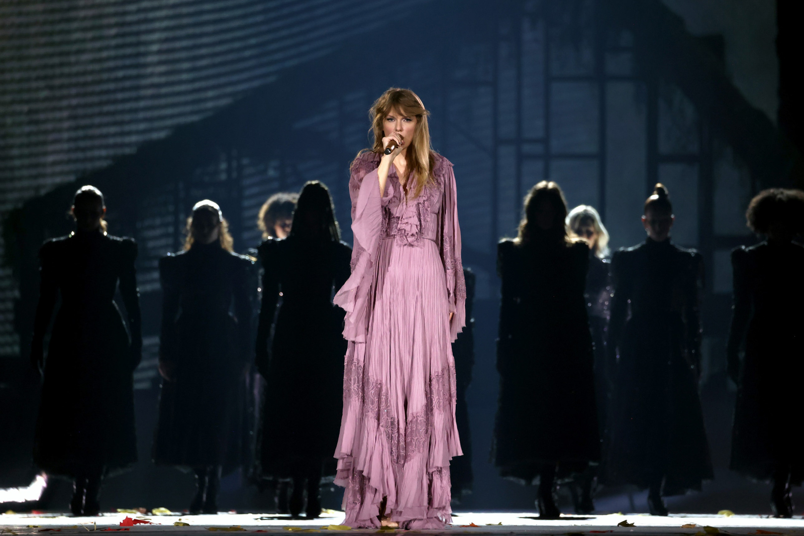 Each outfit was aligned with the message and vibe of the era Swift referenced, showcasing the different audio and visual aesthetics she’s embraced over her nearly two-decade-long career. Swift opened with her songs from the Lover album, and channeled the album’s visual pastel vibes with a glitzy Versace bodysuit. (All of the looks were also complete with shimmery Christian Louboutin boots.) While performing Midnight’s “Lavender Haze,” she chose a faux fur lavender coat by Oscar de la Renta, complete with a beaded bodysuit. During her more ethereal Folklore section, Swift leaned on gauzy prairie gowns by Alberta Ferretti and Etro.