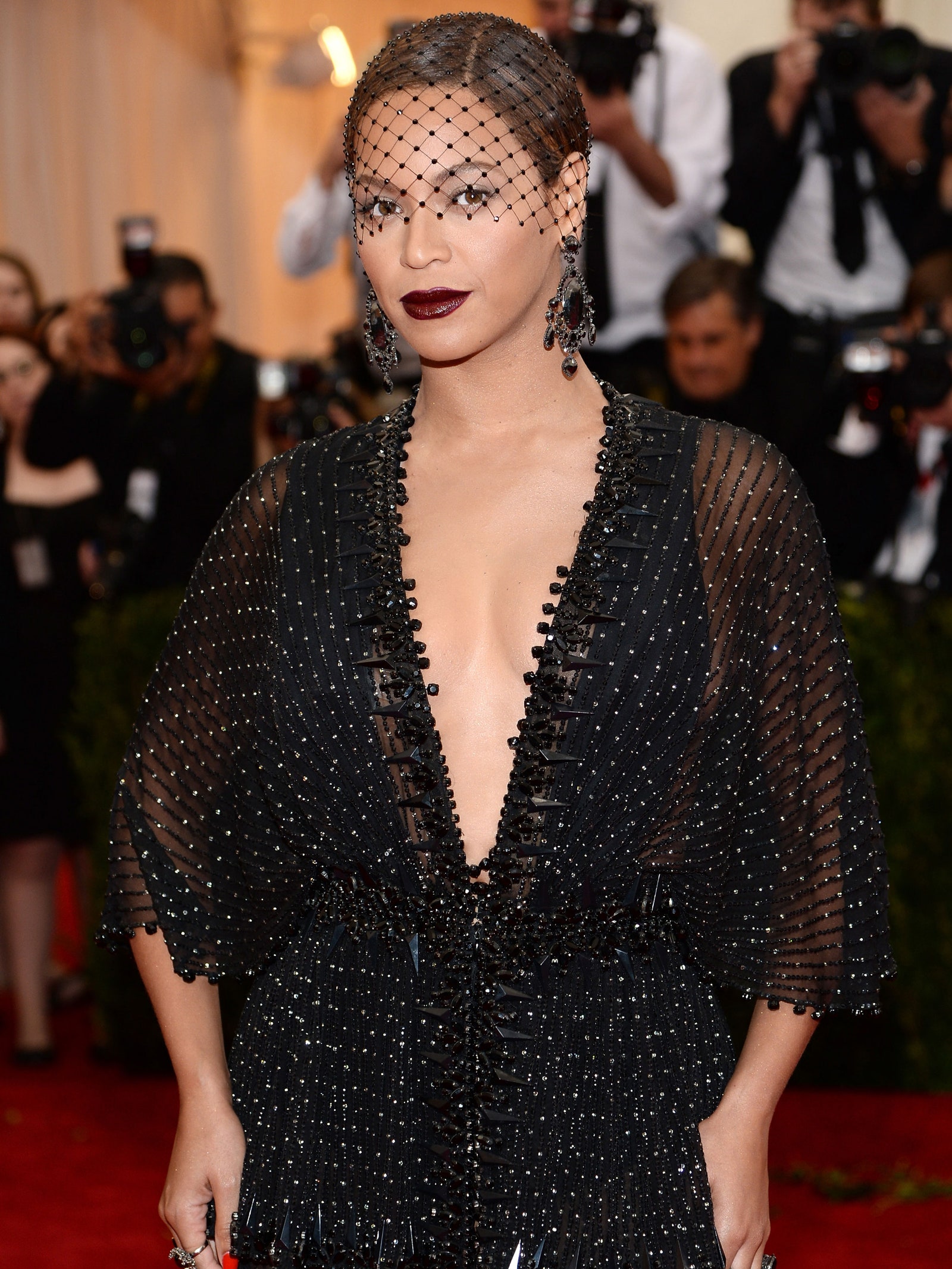 Clad in a Givenchy beaded frock, Beyoncé arrived to the 2014 Met Gala with a bordeaux pout and studded face veil, an homage to the “Charles James: Beyond Fashion” theme.
