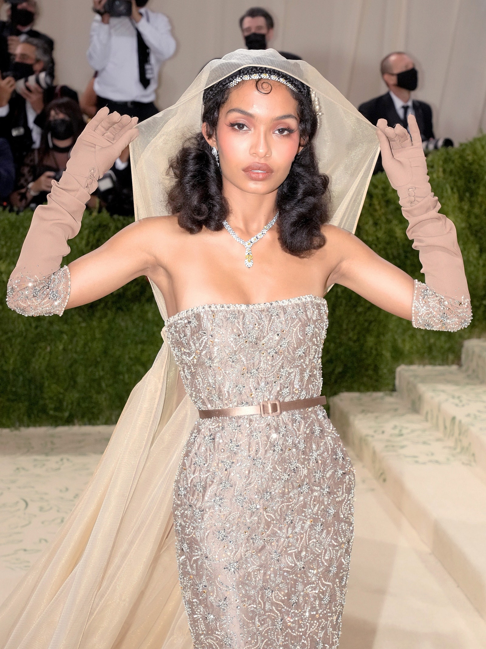 Paying tribute to Josephine Baker as a “powerhouse renegade Black American artist,” Yara Shahidi wore the famed performer’s signature kiss-curl hairstyle, topping off the look with soft wings and a deep nude pout.