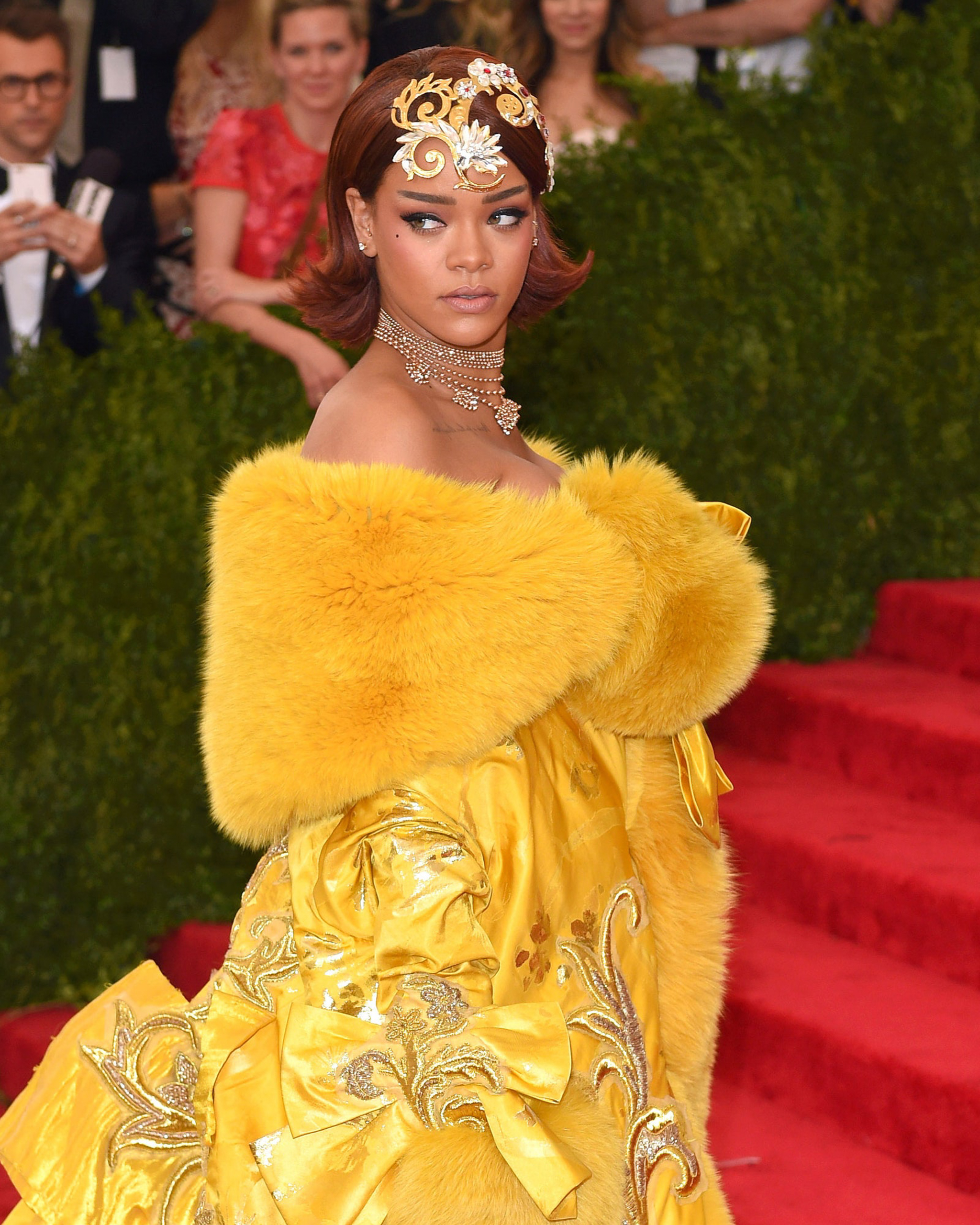 Co-hosting the Met Gala in 2015 for “China: Through the Looking Glass,” Rihanna enlisted Chinese designer Guo Pei to create her sherbet yellow robe, pairing the showstopper with a set of horizontal brows and a diamante headdress.