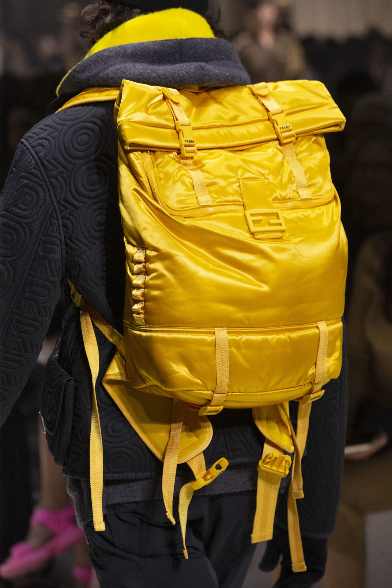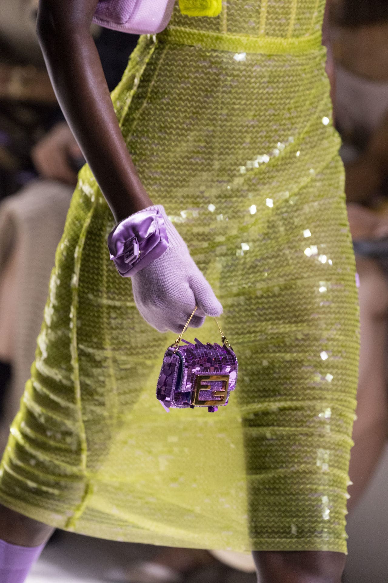 The resulting special collection reincarnated the Baguette: the iconic purple-sequined purse now in a mini version, one tacked on a neon yellow tote as a pocket, and even one enlarged as a backpack. An ode to the city of New York, where the style was immortalized in pop culture canon, the collection also reworked the design into jacket pockets, tactical pants, socks—even as a pocket on a beanie or baseball cap.